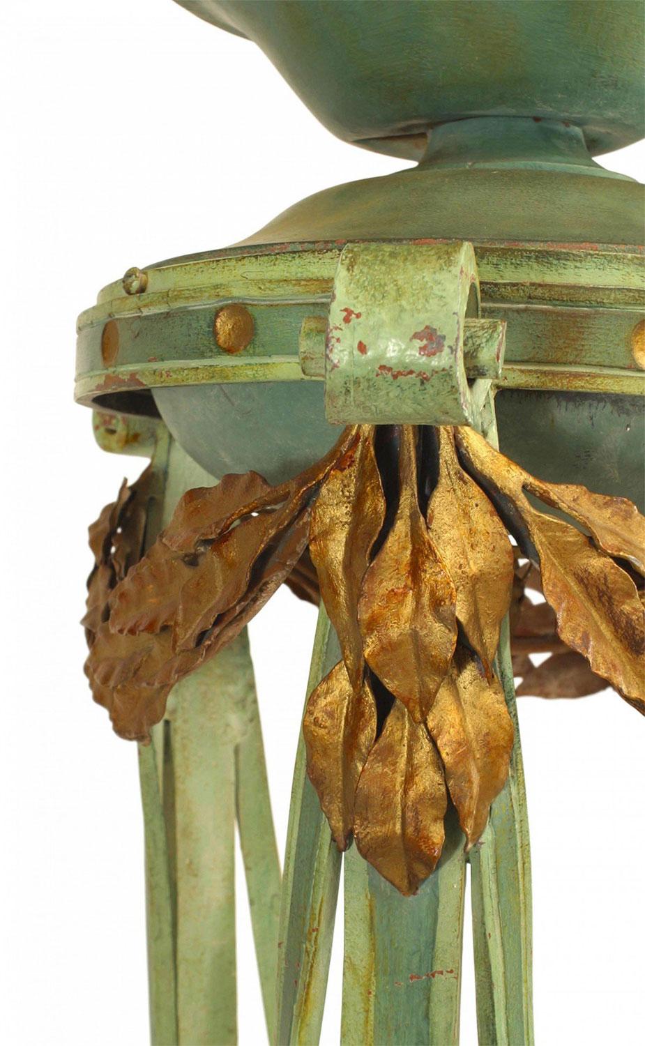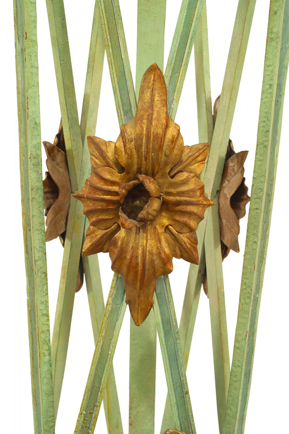 2 Italian Neo-classic style (19th Century) green and gold painted iron brazier style wreath design floor lamps with marble bases (ONE SHADE MISSING; ONE REPAIRED-can be replaced with modern shades)(PRICED EACH)