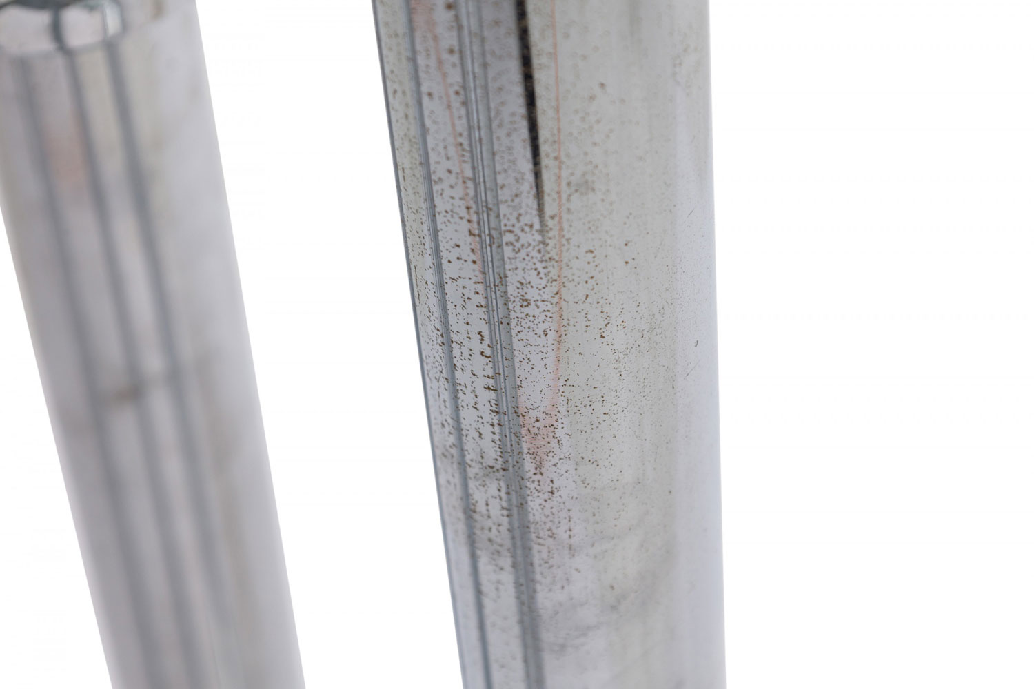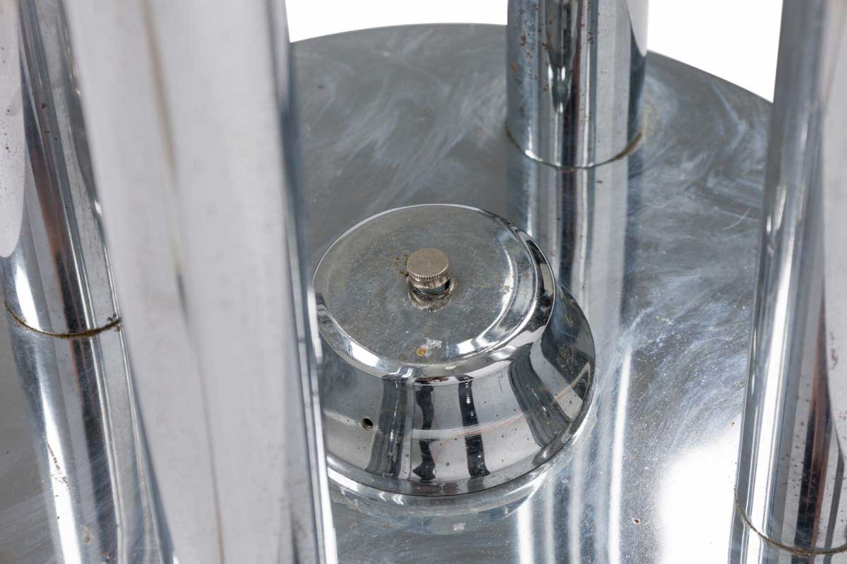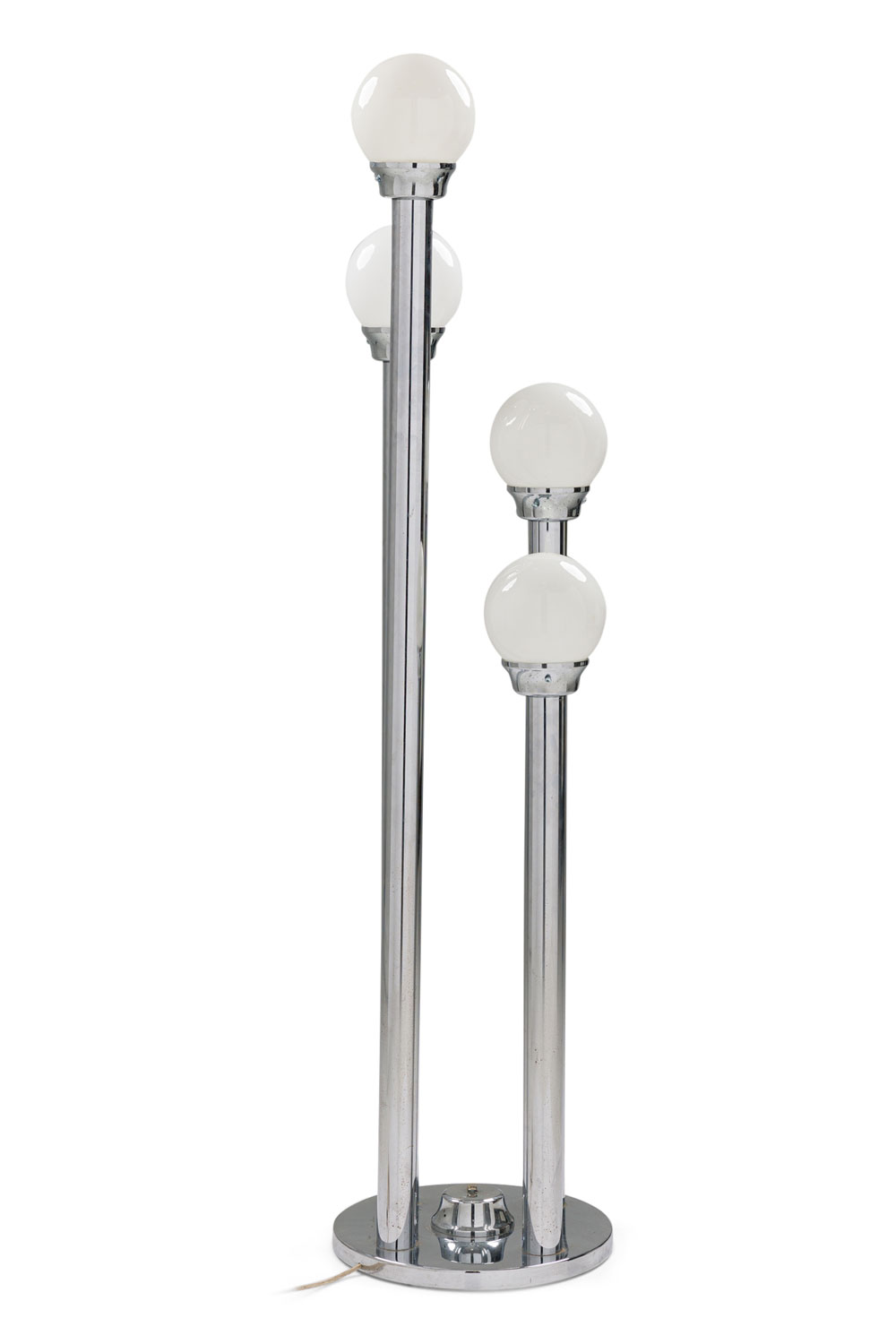 Italian 1950/60s Phantom design chrome floor lamp with 4 various height columns emanating from a round base holding white/milky glass shades
