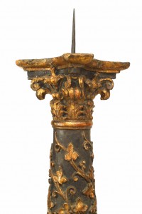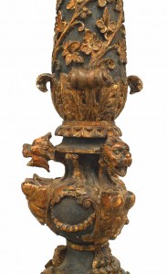 PAIR of Italian Renaissance-style (17th Century) dark green painted large floor standing altar style candlesticks with gilt carved floral and vine trim supported on base with 3 griffins (PRICED AS PAIR)