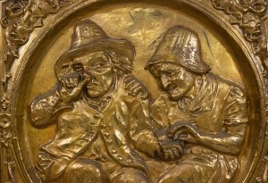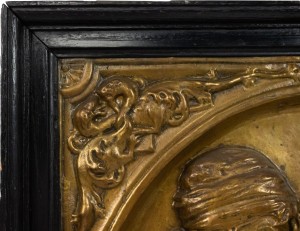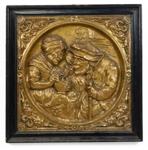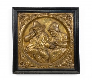 PAIR of Italian Renaissance style (19th Century) square black framed brass embossed wall plaques with scene of 17th Century man & women (PRICED AS PAIR).