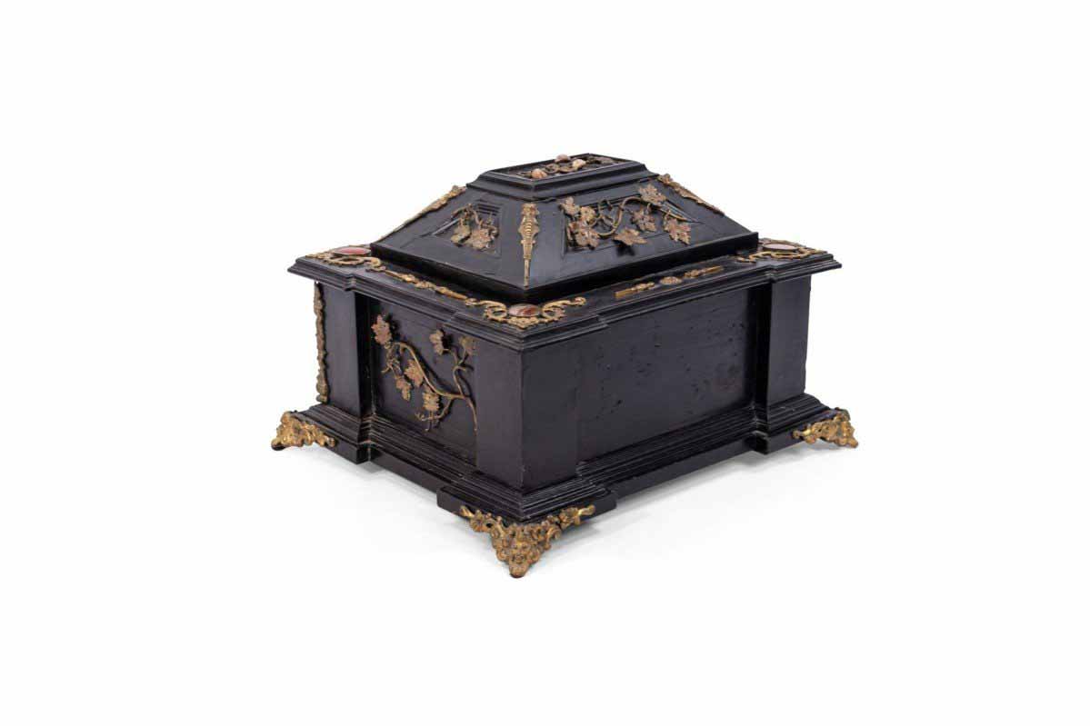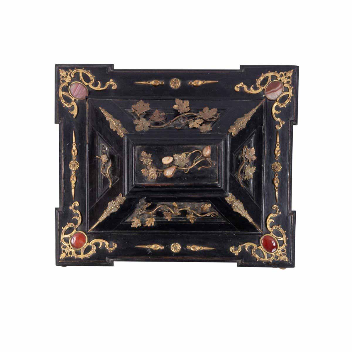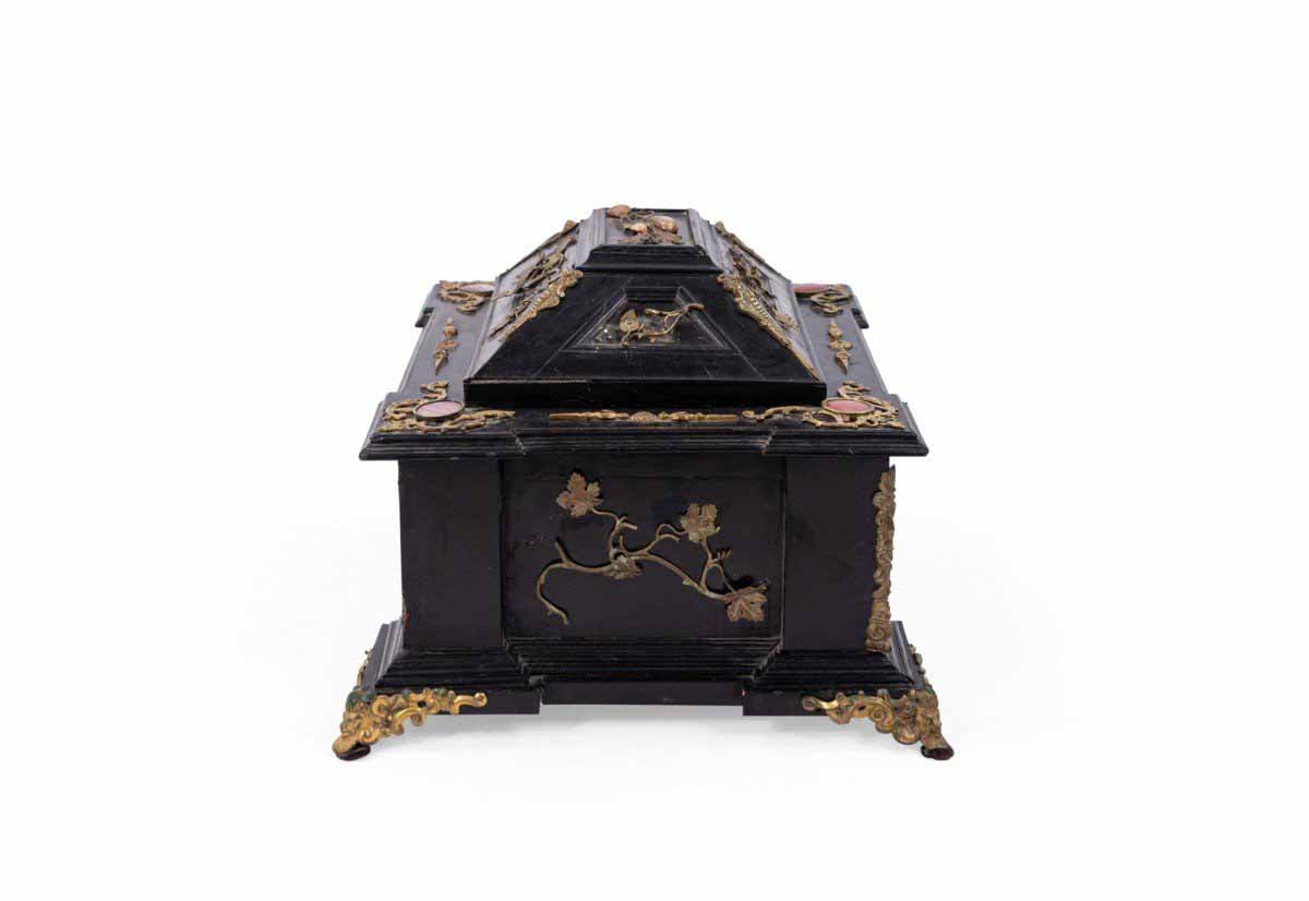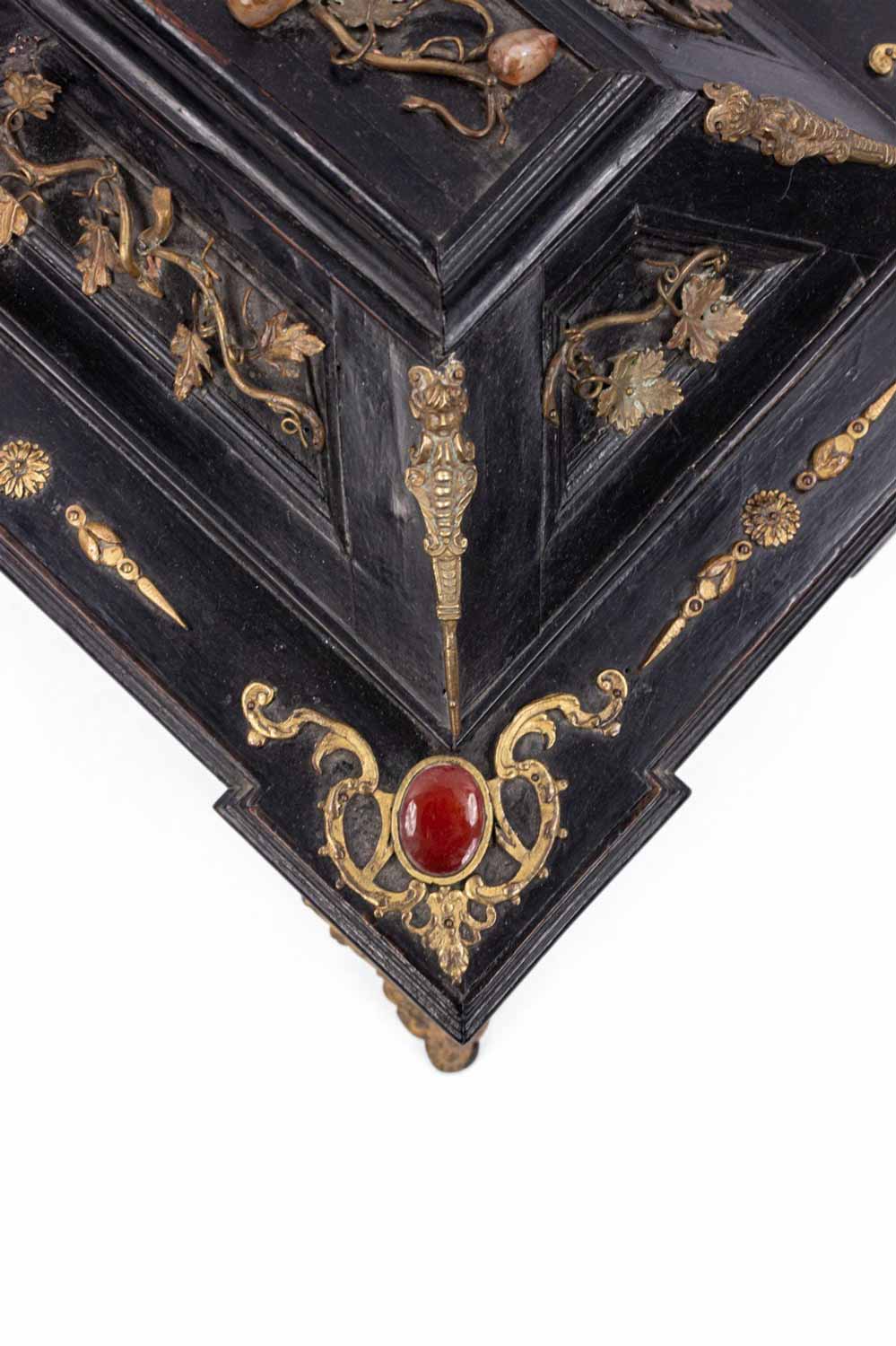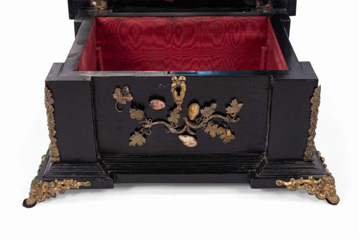 Italian Renaissance-style (19th Century) large black lacquered box with semi precious stones and bronze floral trim