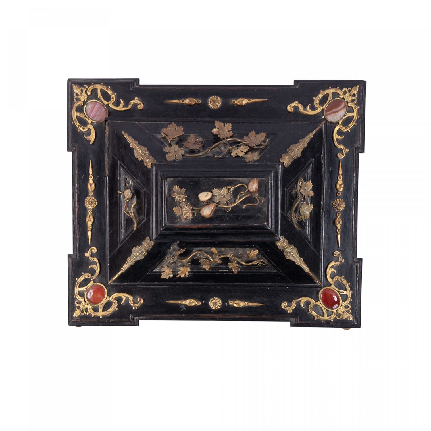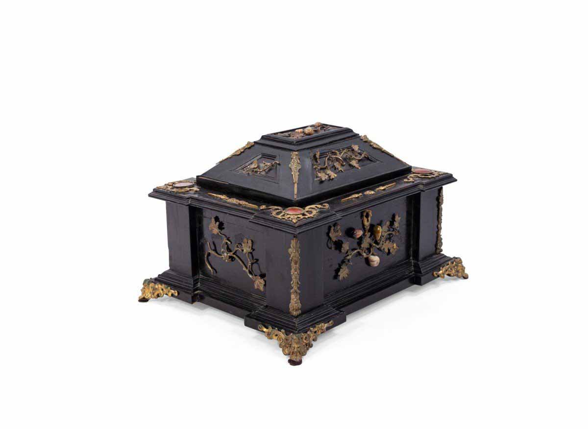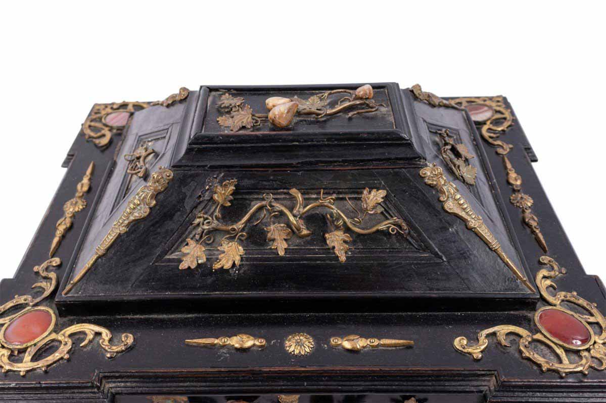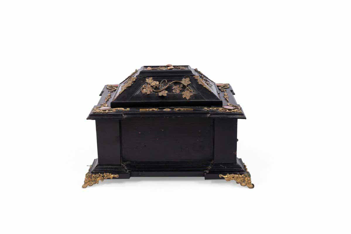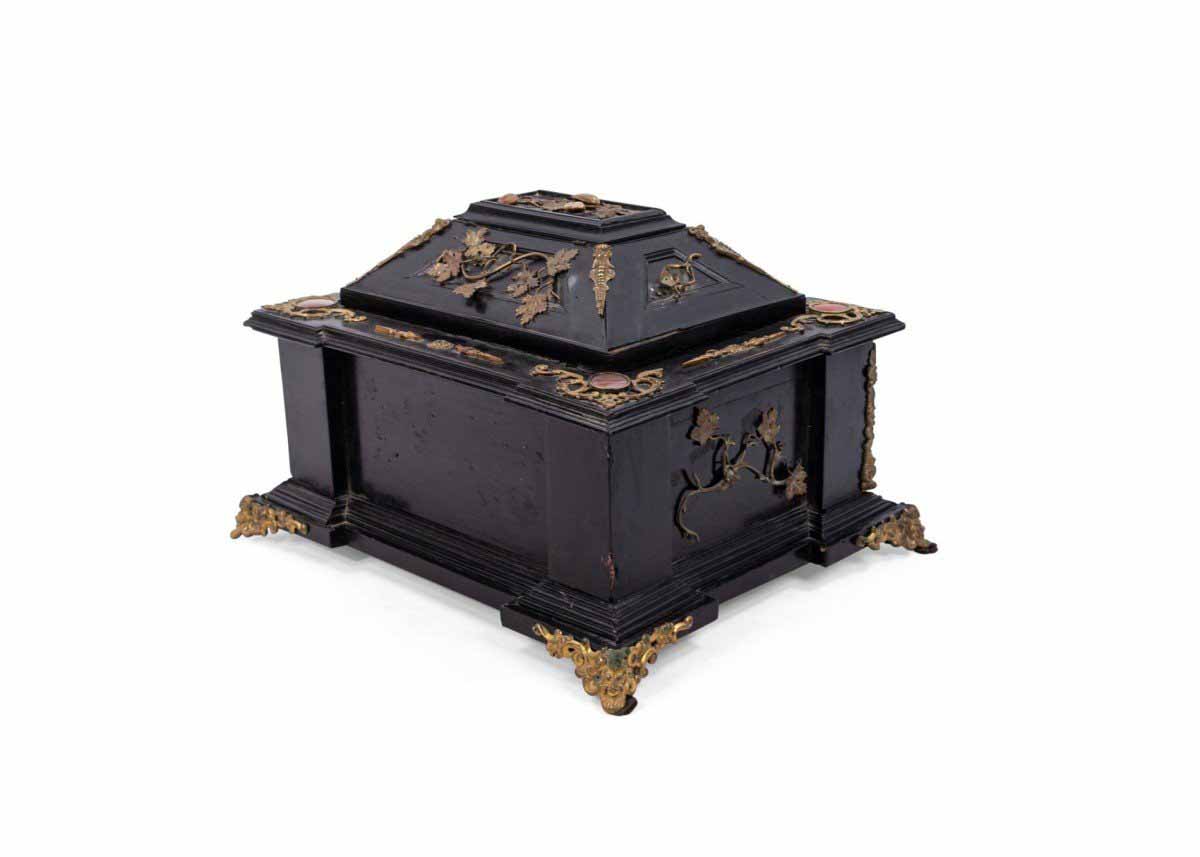 Italian Renaissance-style (19th Century) large black lacquered box with semi precious stones and bronze floral trim