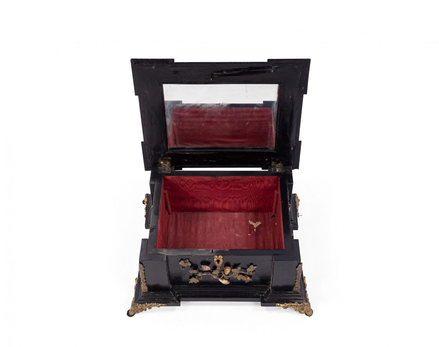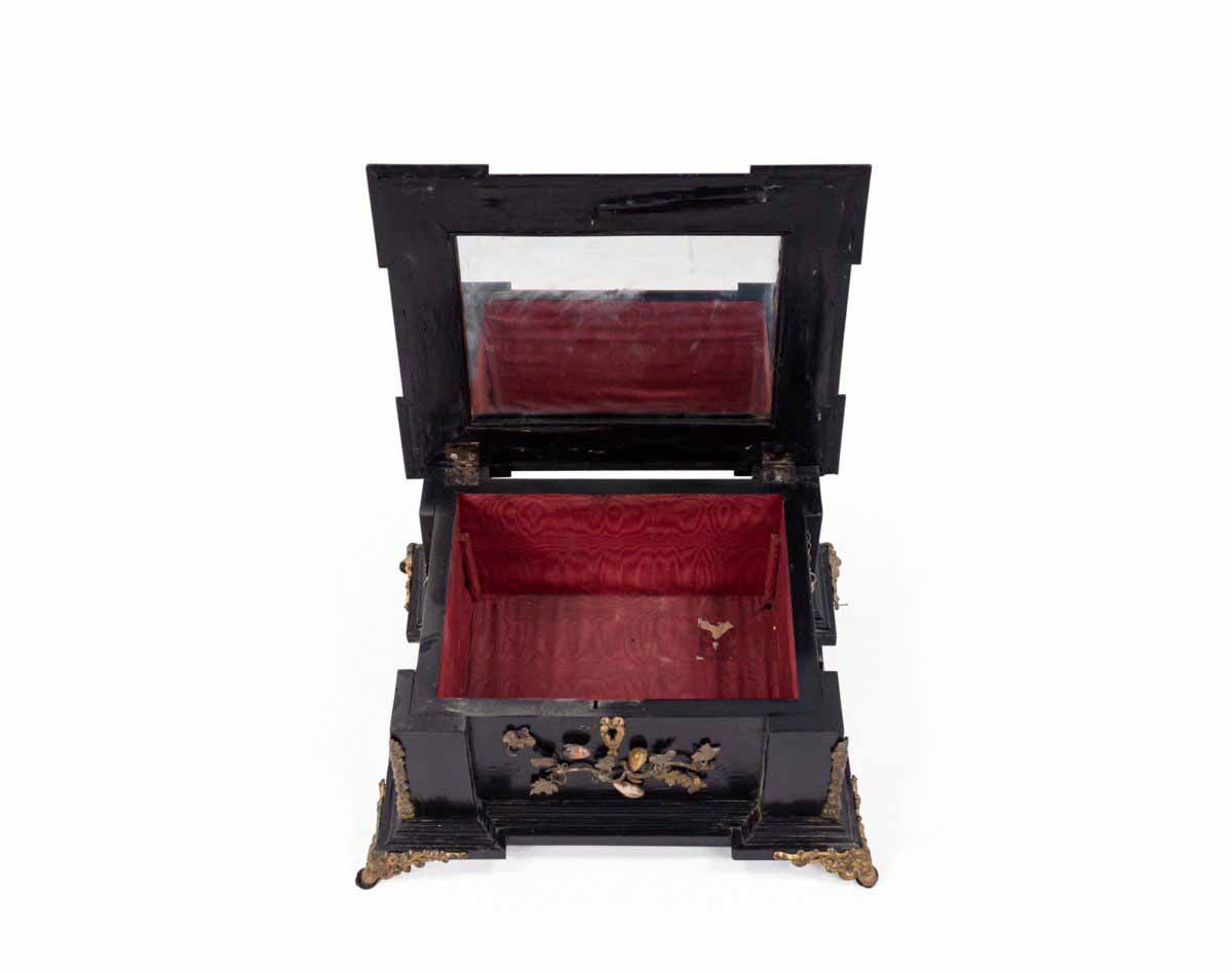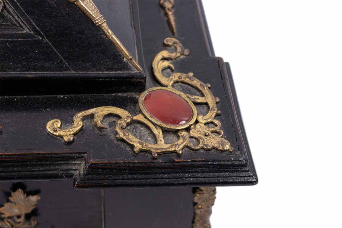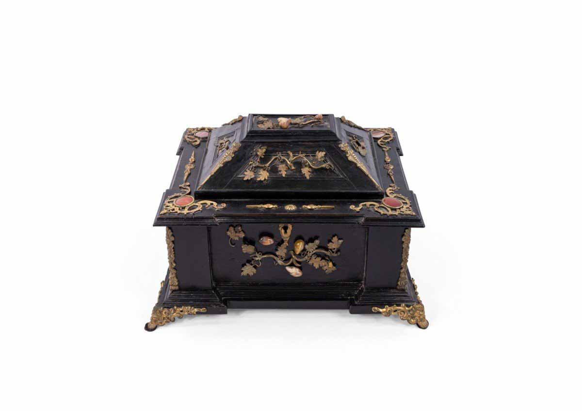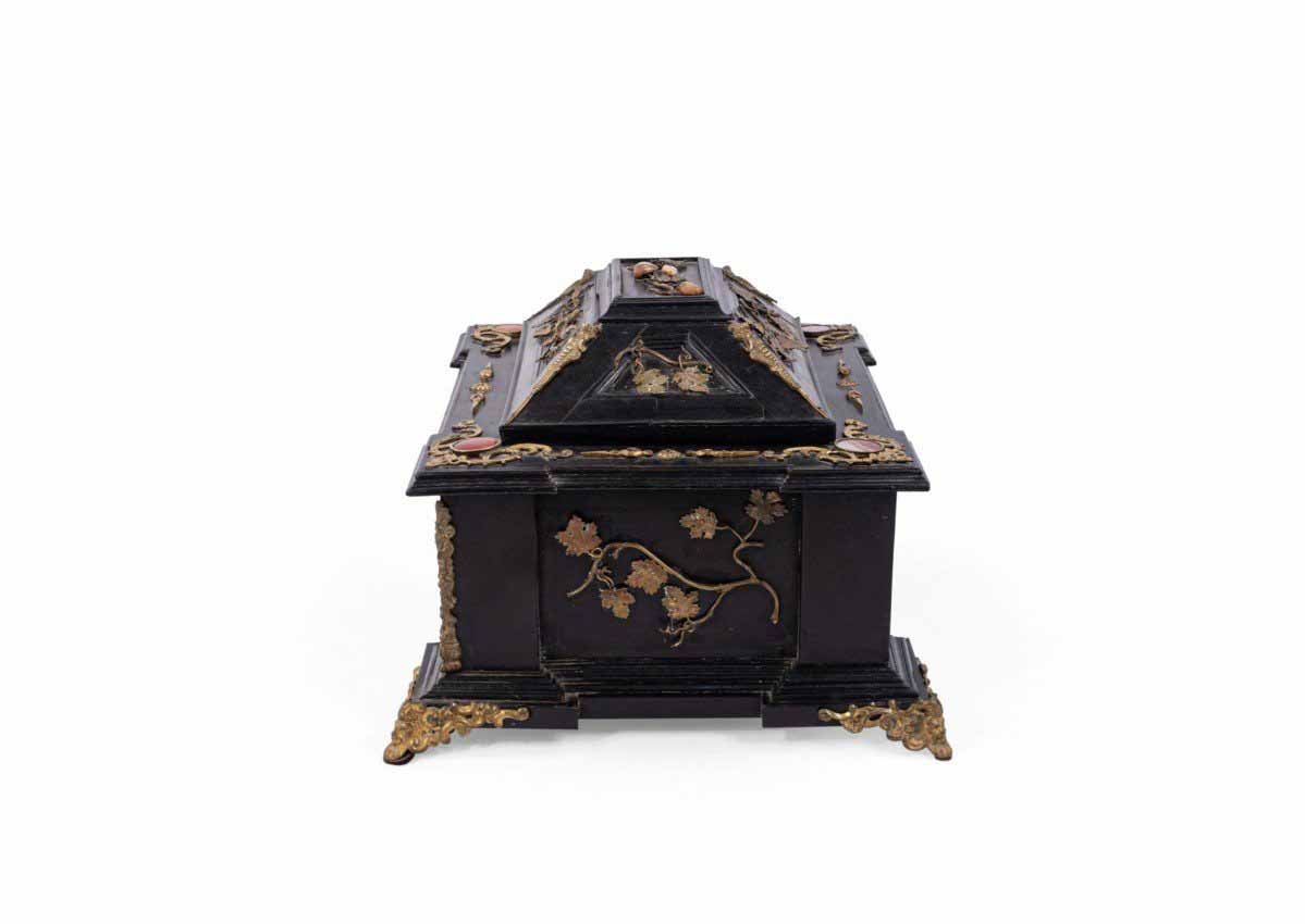 Italian Renaissance-style (19th Century) large black lacquered box with semi precious stones and bronze floral trim