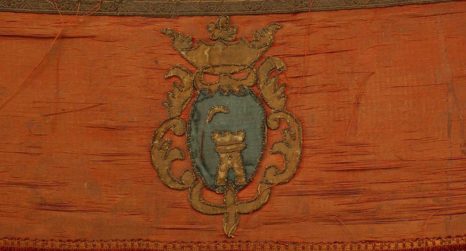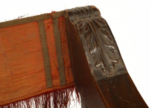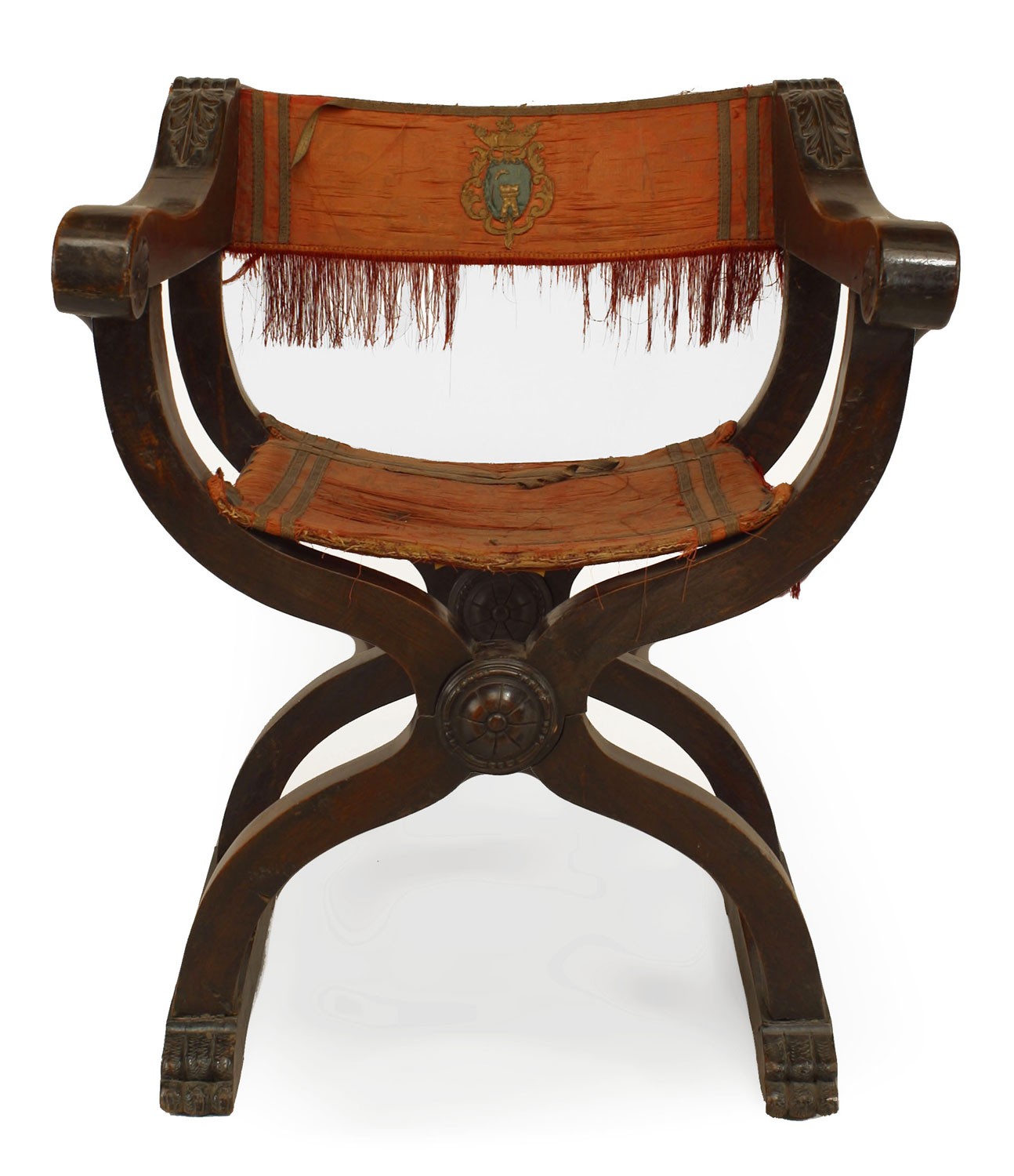 Italian Renaissance Savanarola style walnut arm chair with gold velvet back and red and gold cut velvet seat (19th Cent)