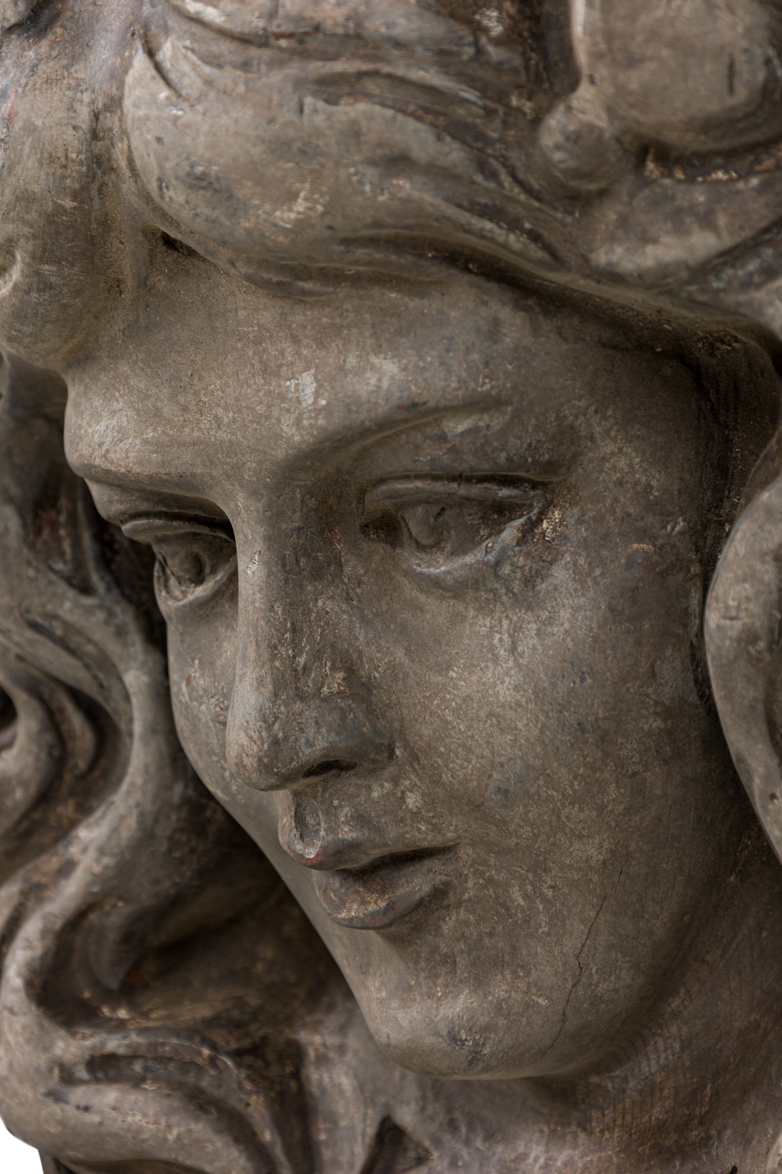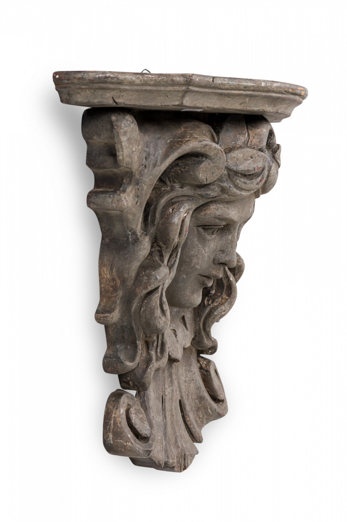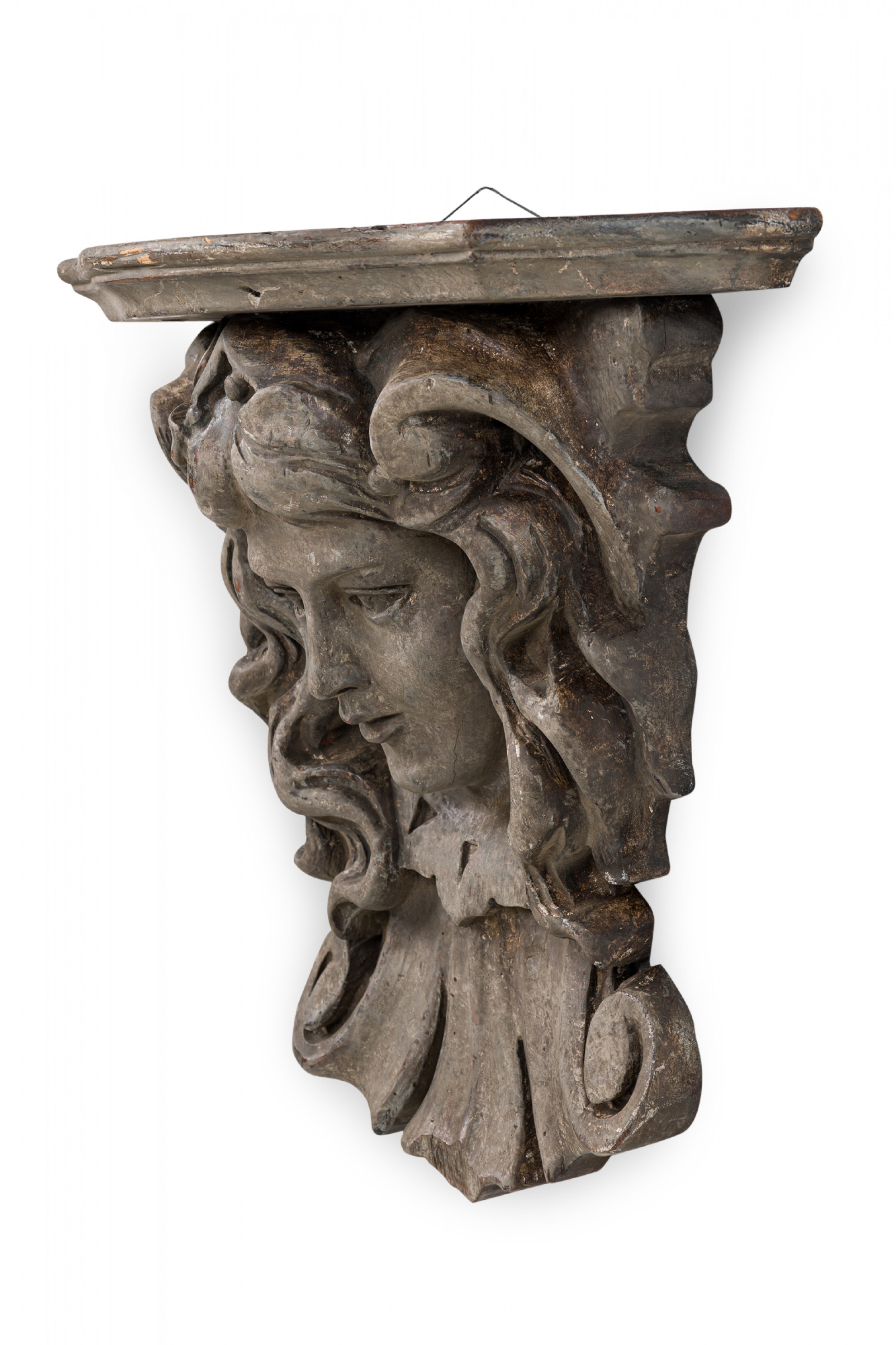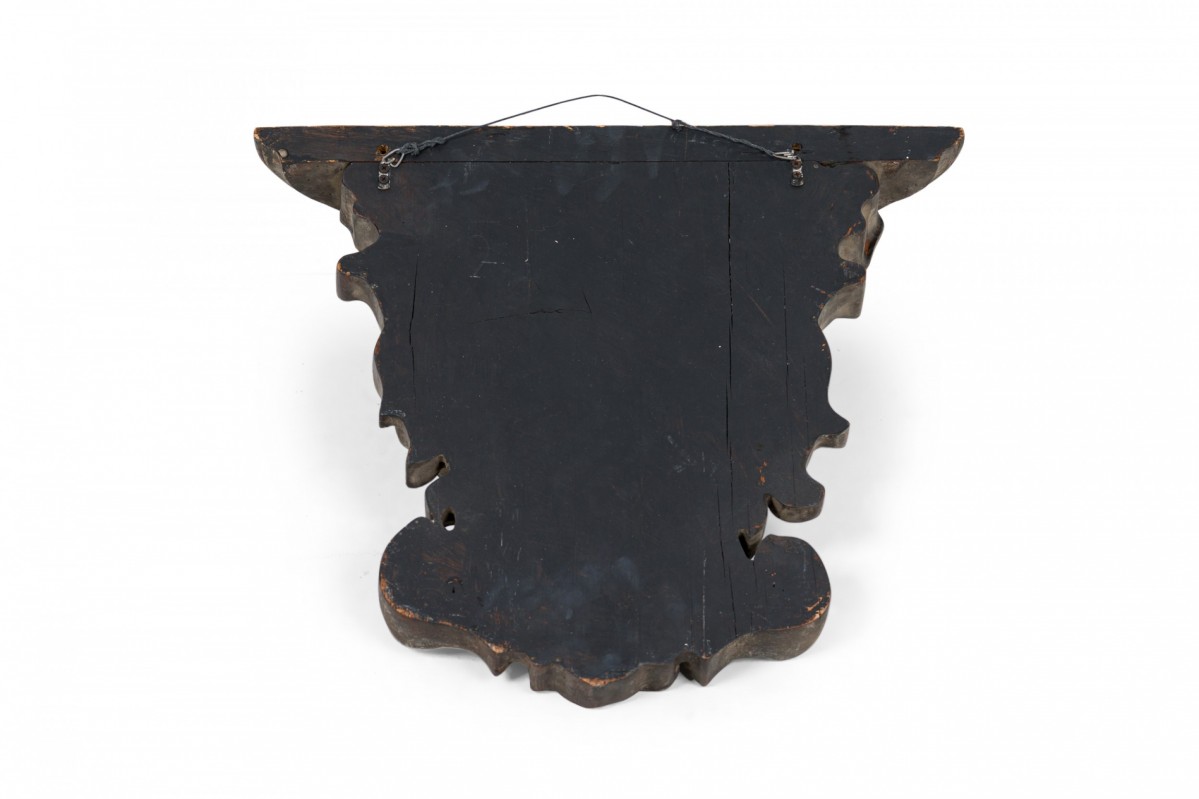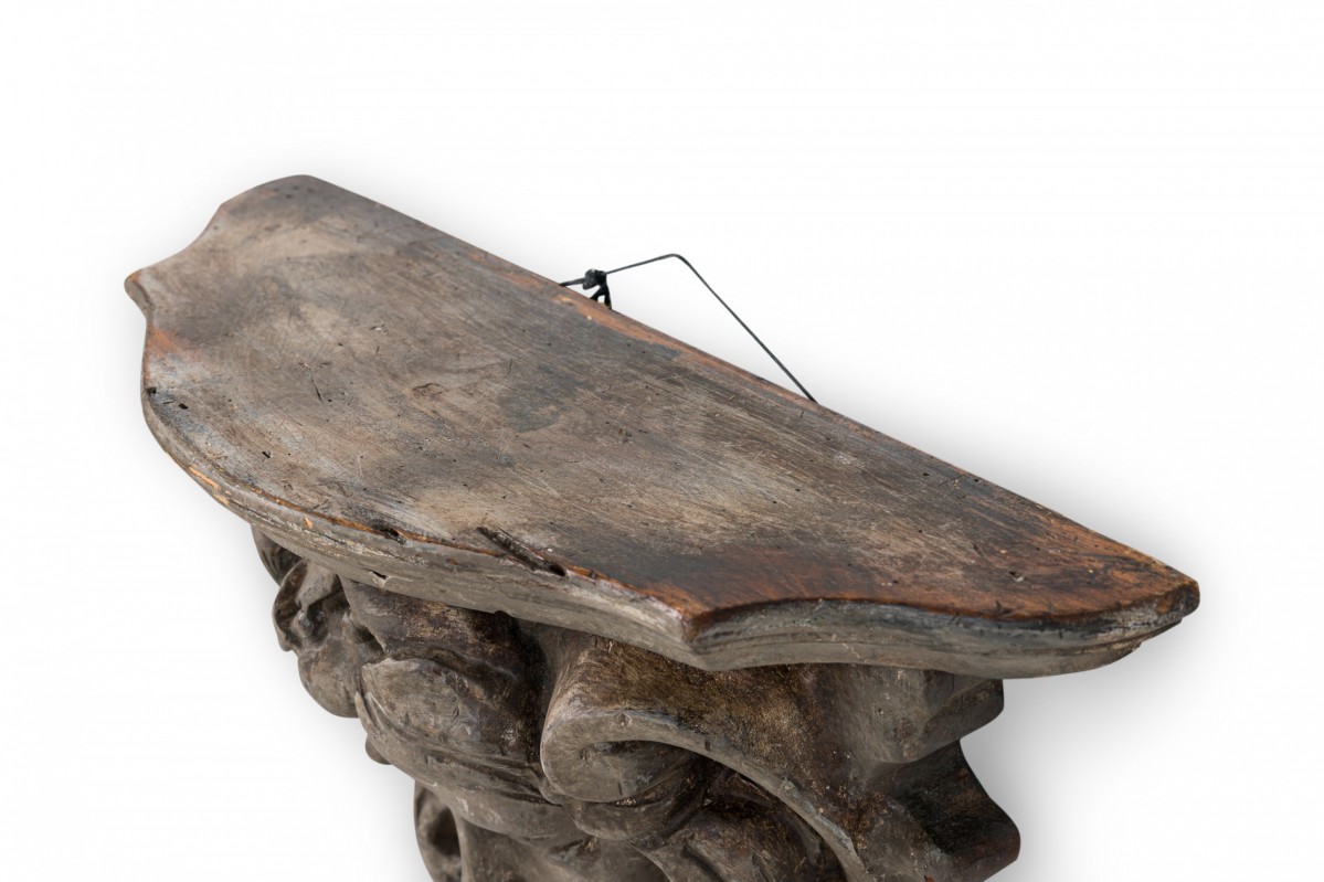 Italian Rococo-style wooden wall bracket / shelf / architectural element featuring a carved face below an upper shelf with carved and shaped beveled edge, treated with a faux bois painted finish.