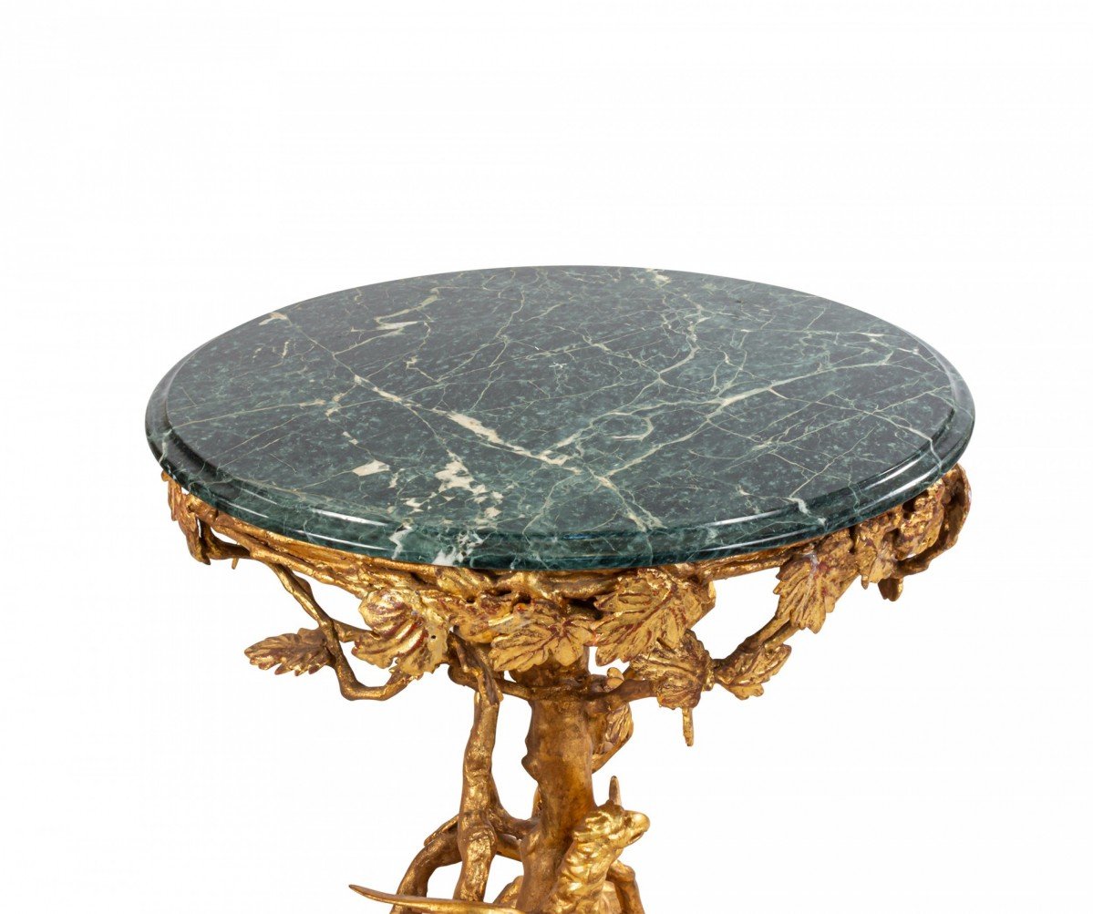 Italian Rococo (18th Century) gilt round end table with a floral carved design and eagle figure resting on a triangular base with an apron supporting a round green marble top.