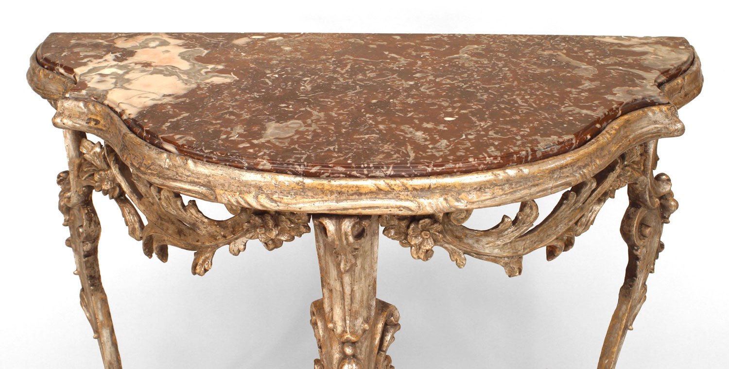 Italian Venetian (18th Century) gilt 3 leg console table with carved floral design stretcher & apron with shaped brown marble top.