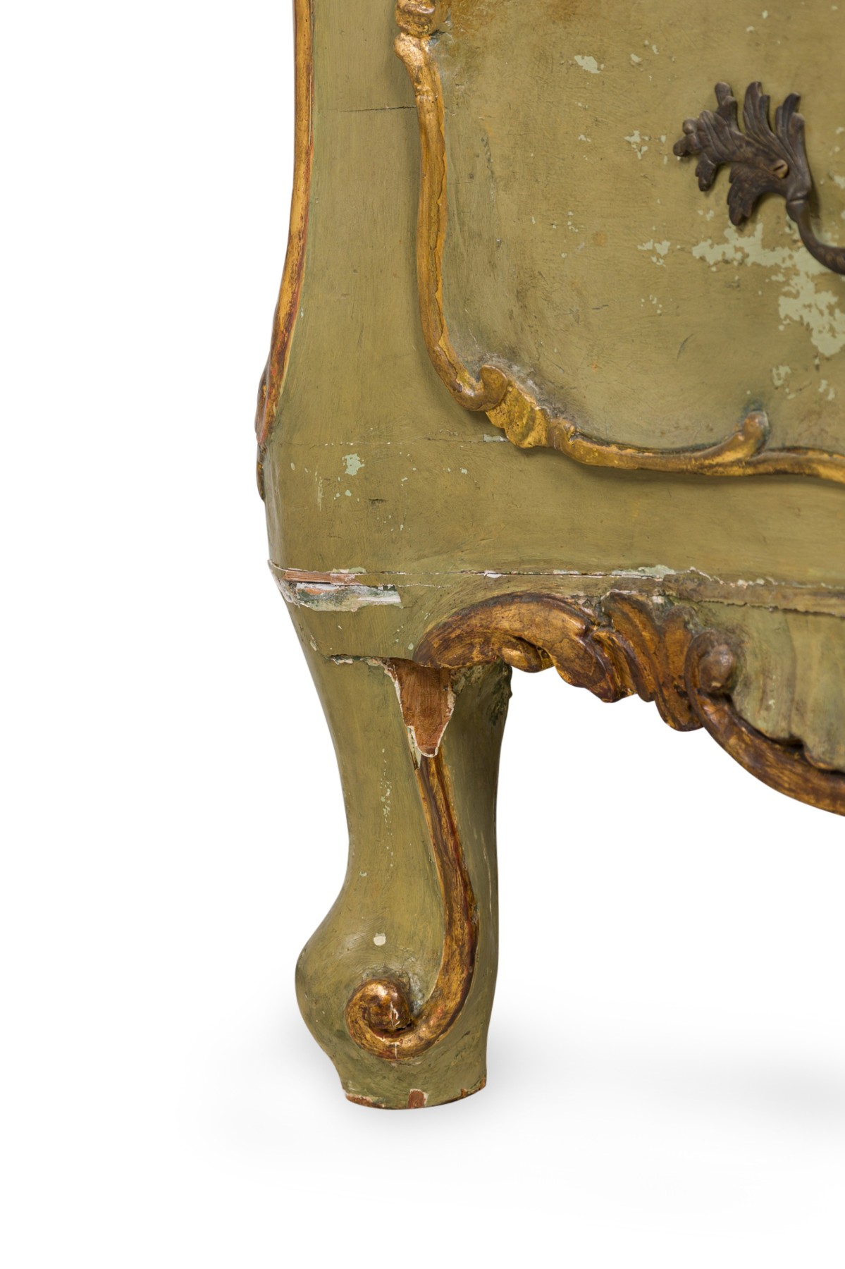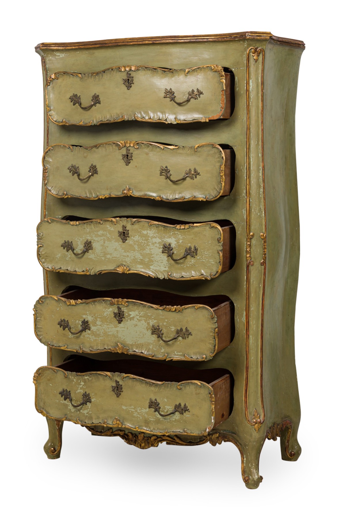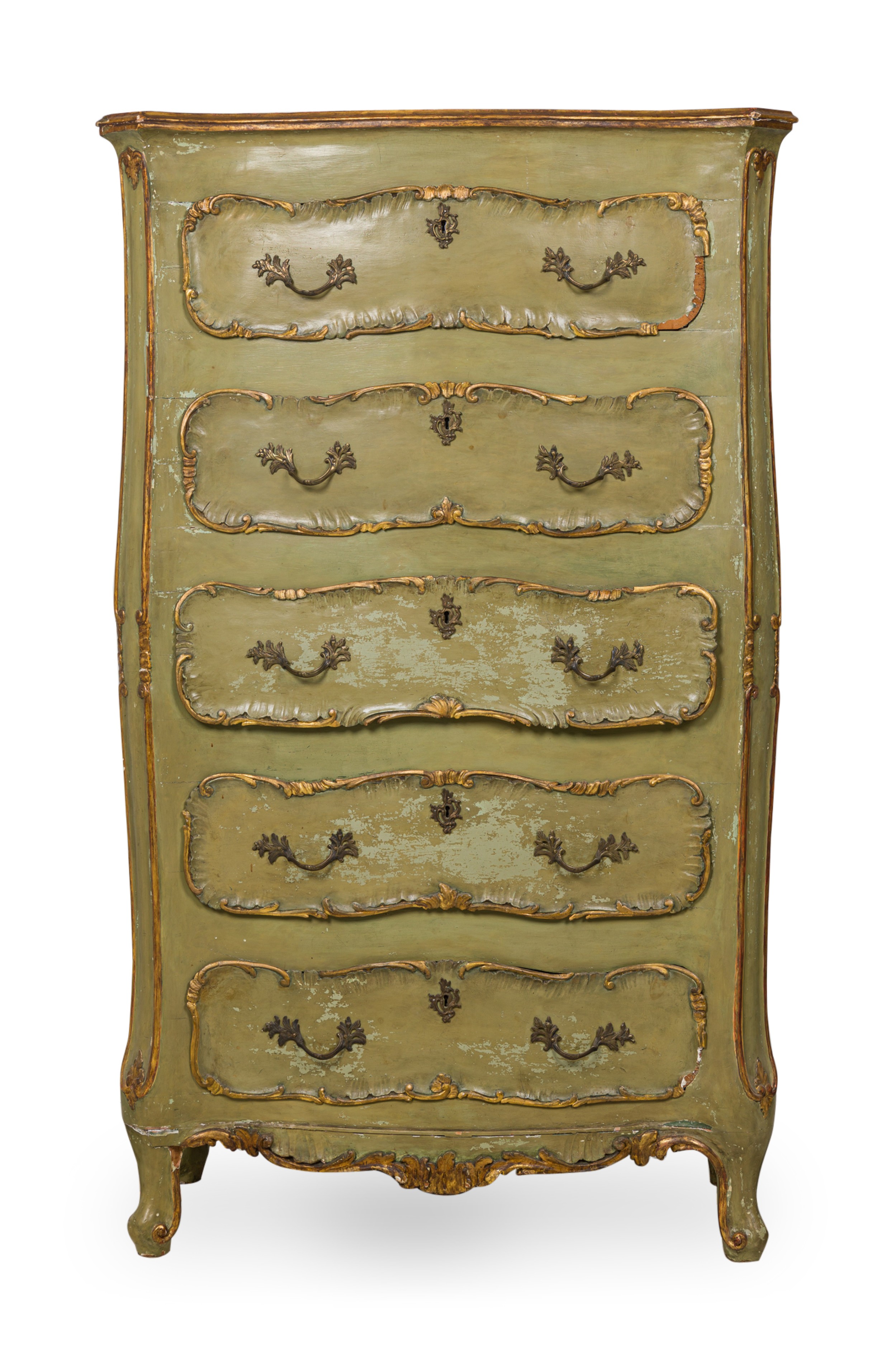 Italian Venetian Rococo-style serpentine semainier / dresser having 5 drawers with carved gilt trim and bronze drawer pulls, parcel-gilt and painted in a light green finish, resting on four carved feet.