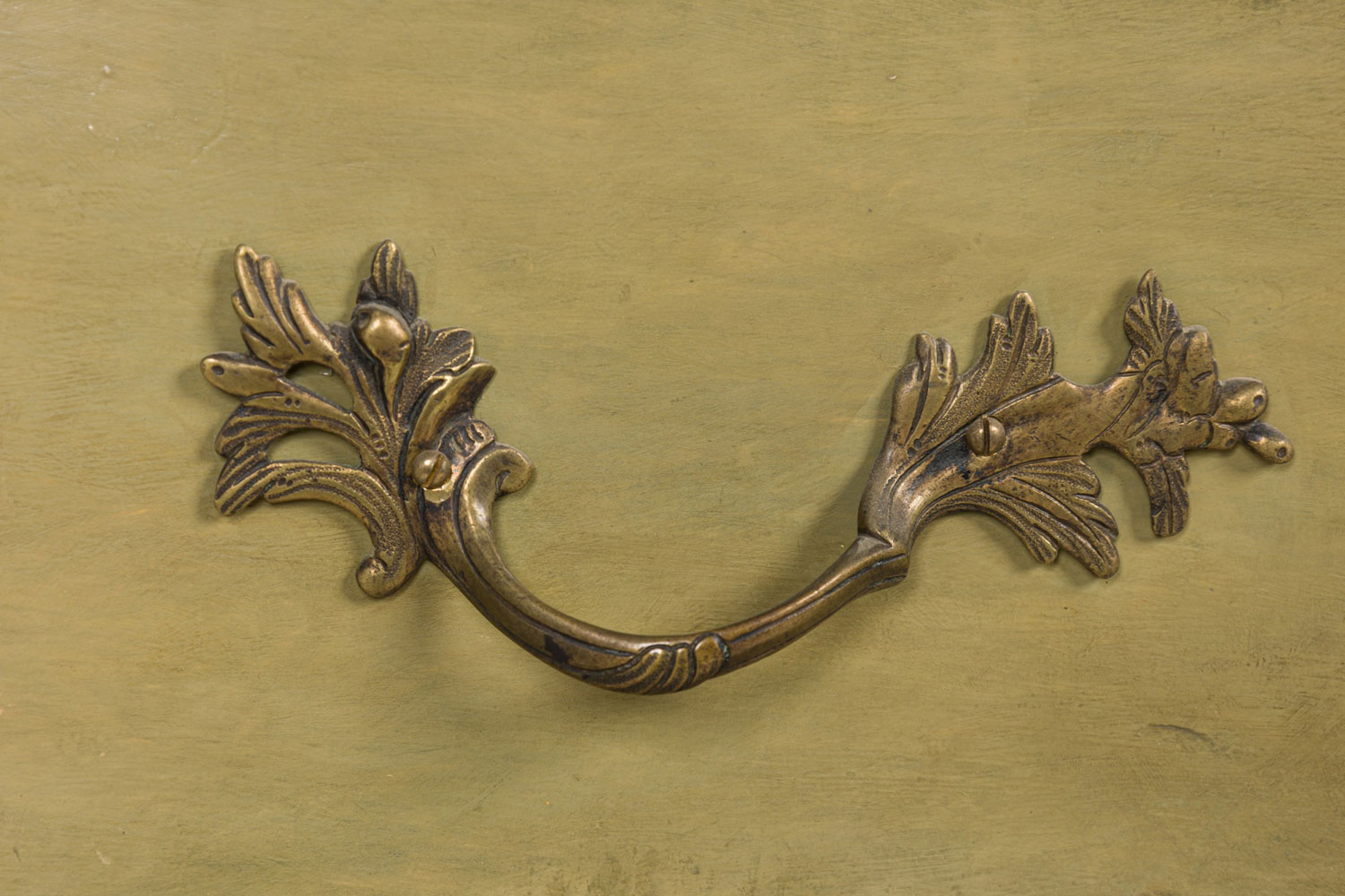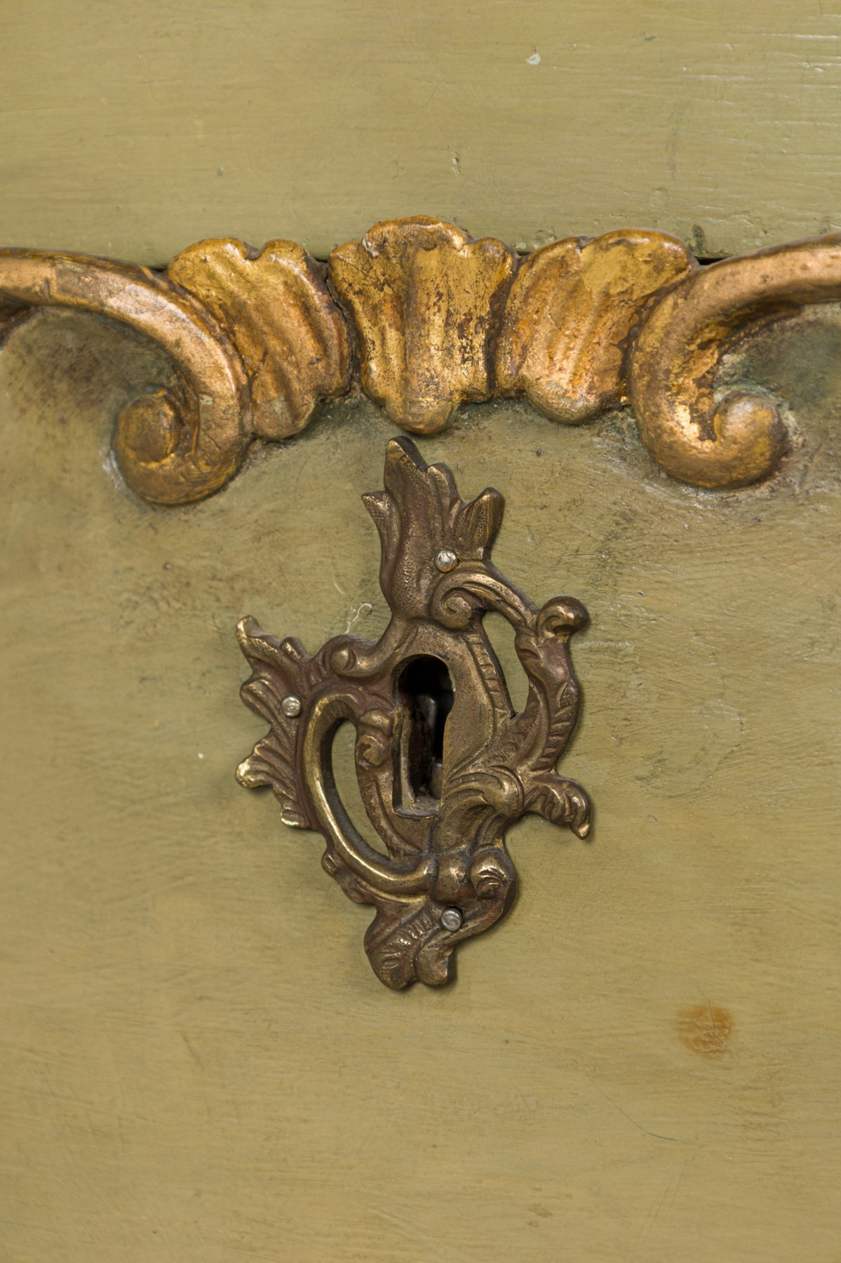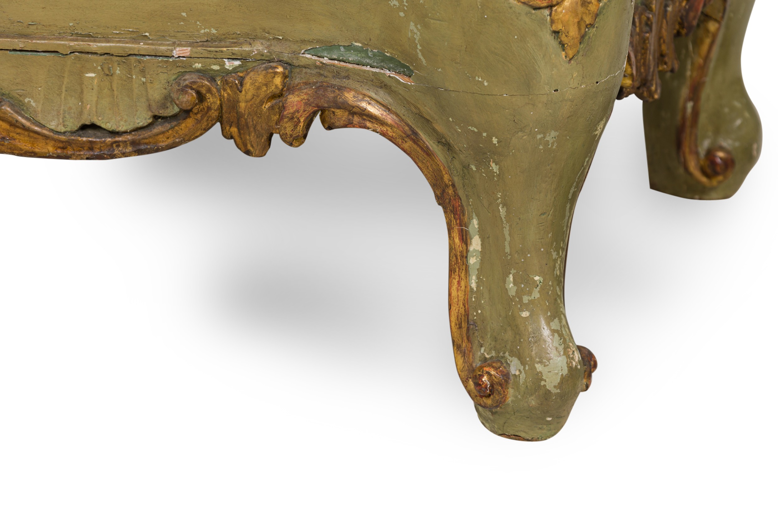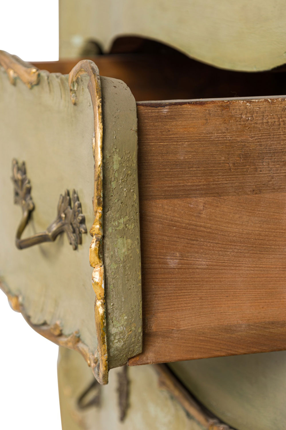 Italian Venetian Rococo-style serpentine semainier / dresser having 5 drawers with carved gilt trim and bronze drawer pulls, parcel-gilt and painted in a light green finish, resting on four carved feet.
