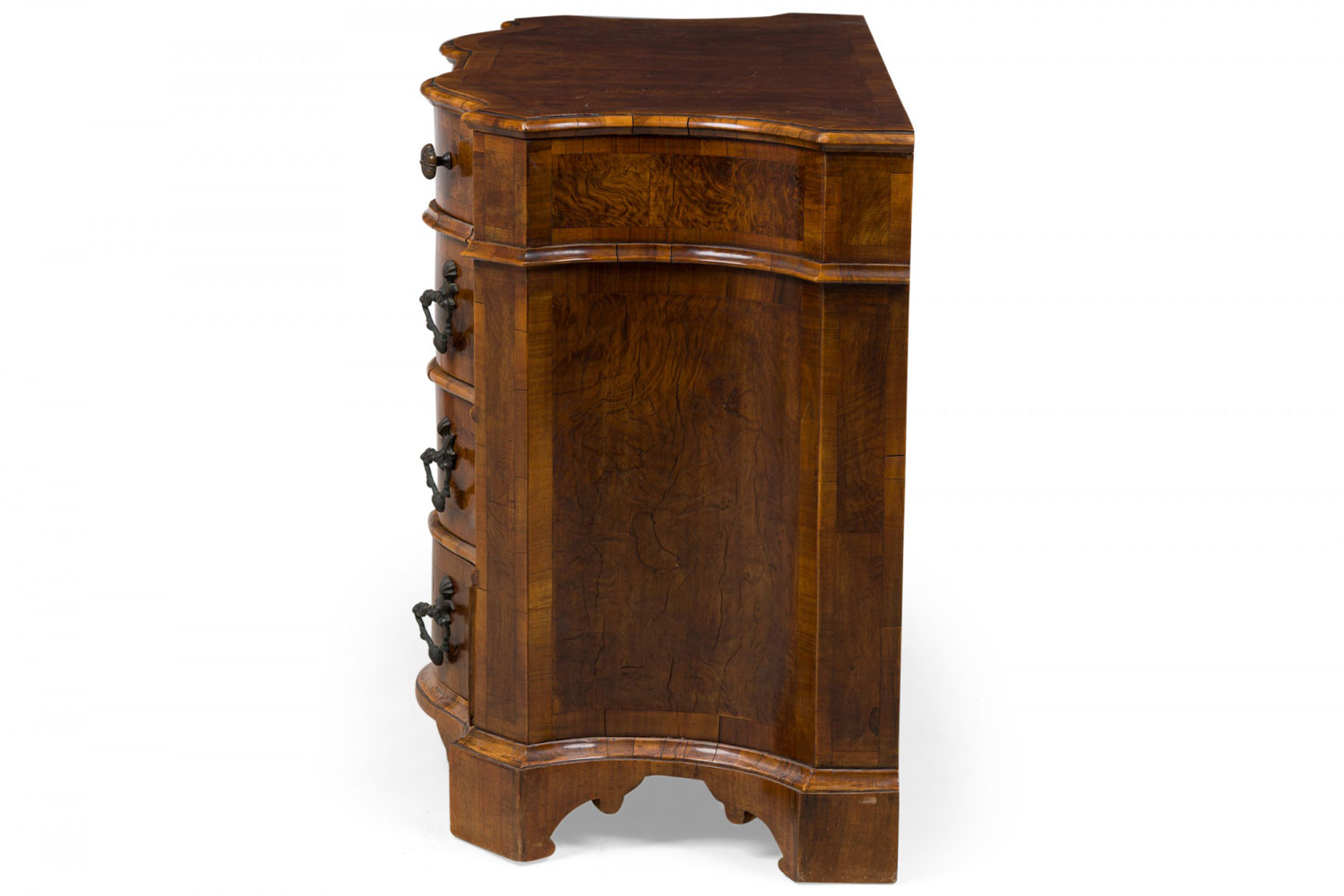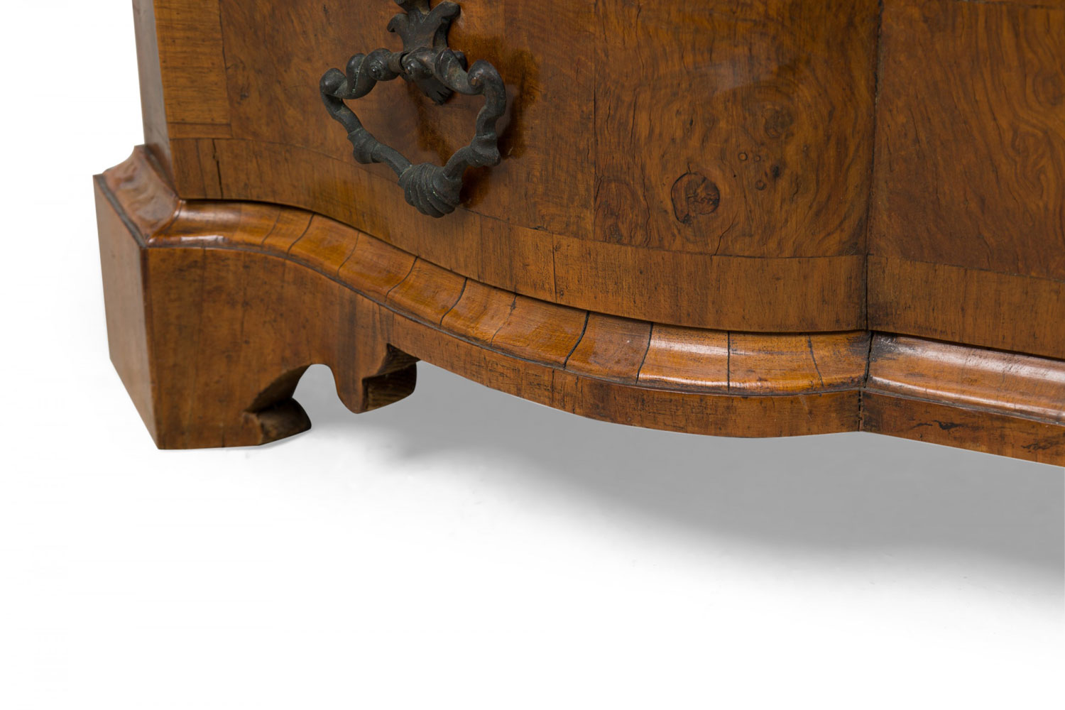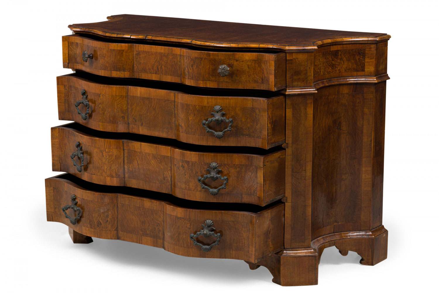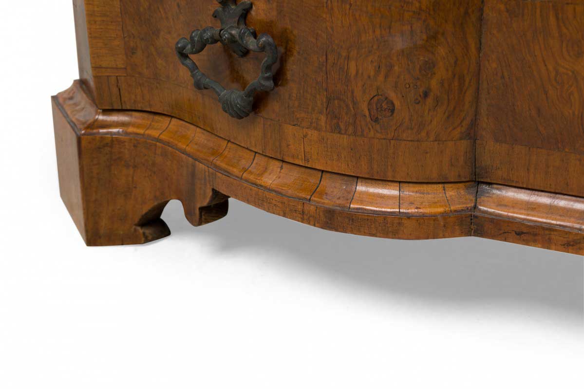 Italian Venetian olive wood chest with a serpentine front and shaped top, containing four drawers with patinated bronze ornater handles on the bottom 3 drawers and 2 knob pulls on the top drawer