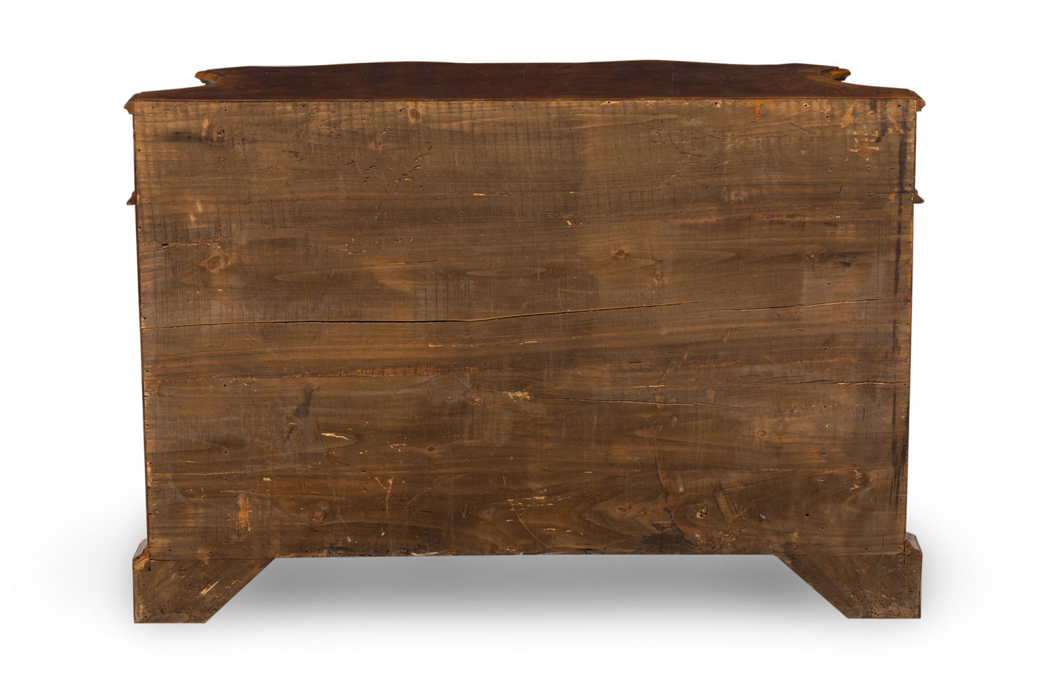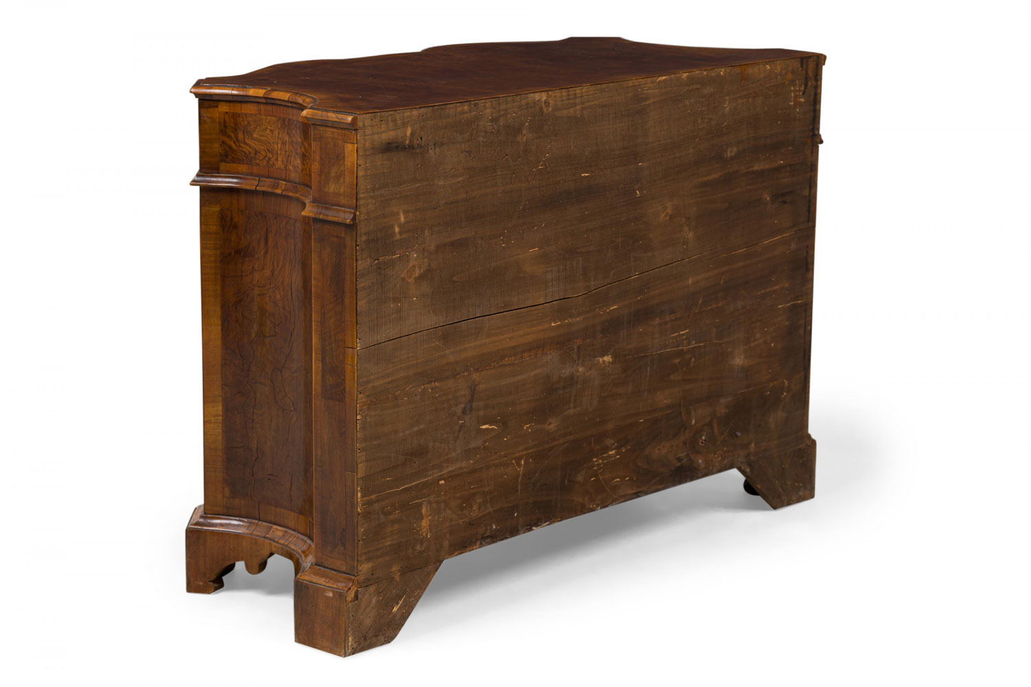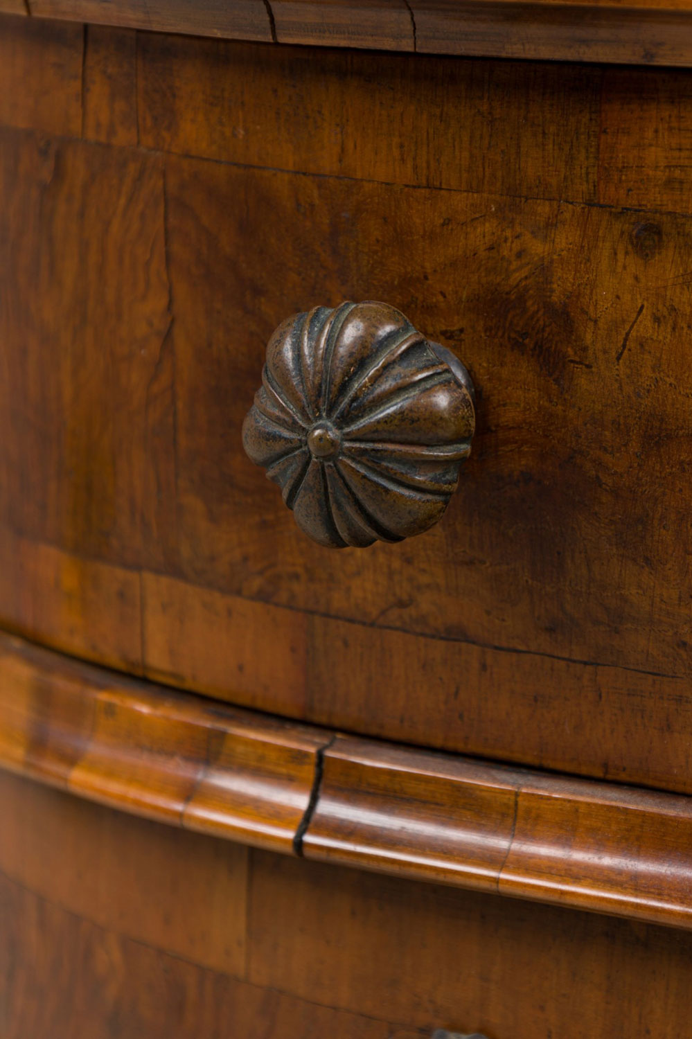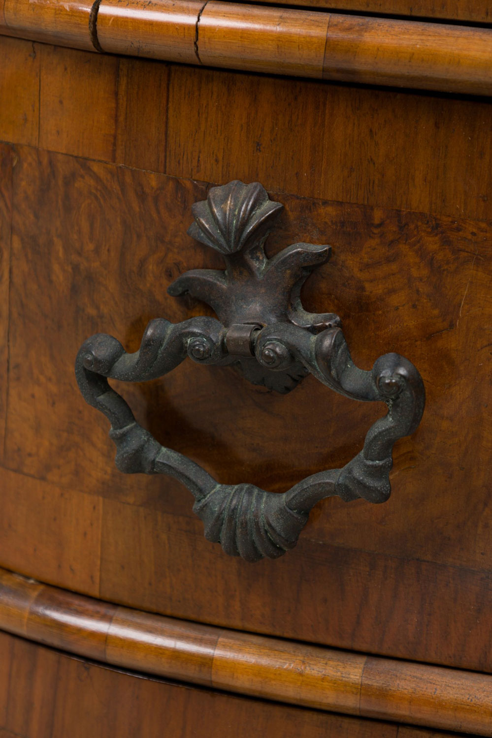 Italian Venetian olive wood chest with a serpentine front and shaped top, containing four drawers with patinated bronze ornater handles on the bottom 3 drawers and 2 knob pulls on the top drawer