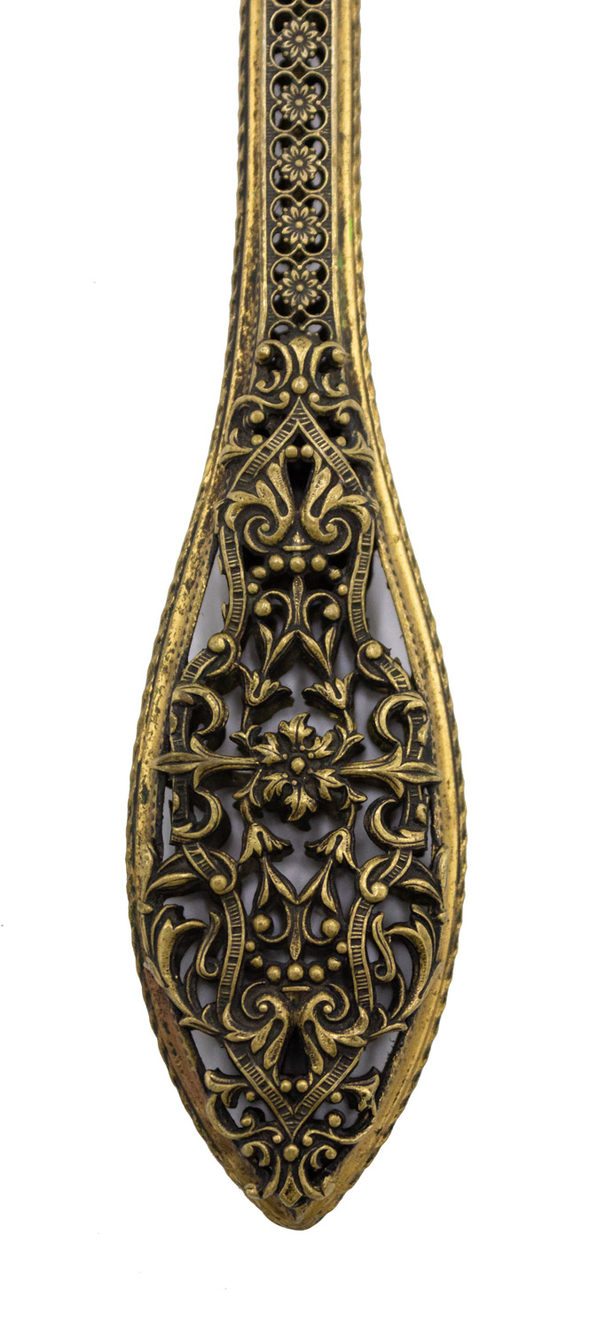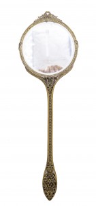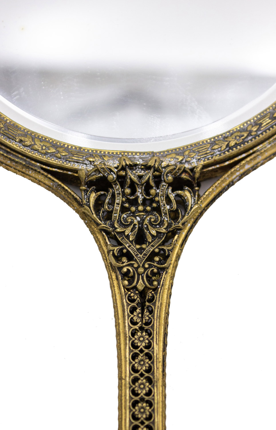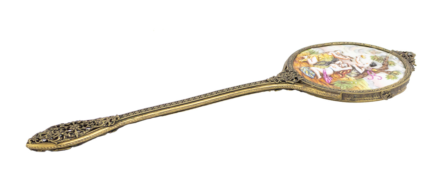 Italian Venetian style brass hand mirror with round Capo di Monte porcelain on back and filigree handle. (19/20th Cent)