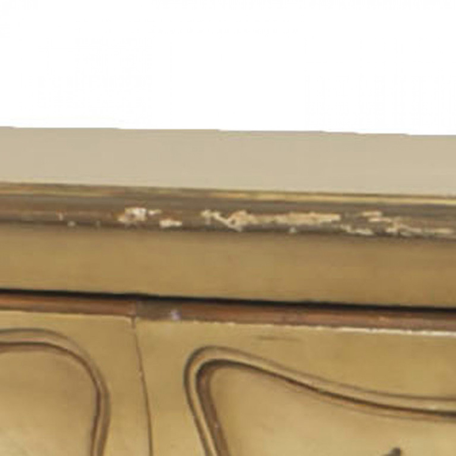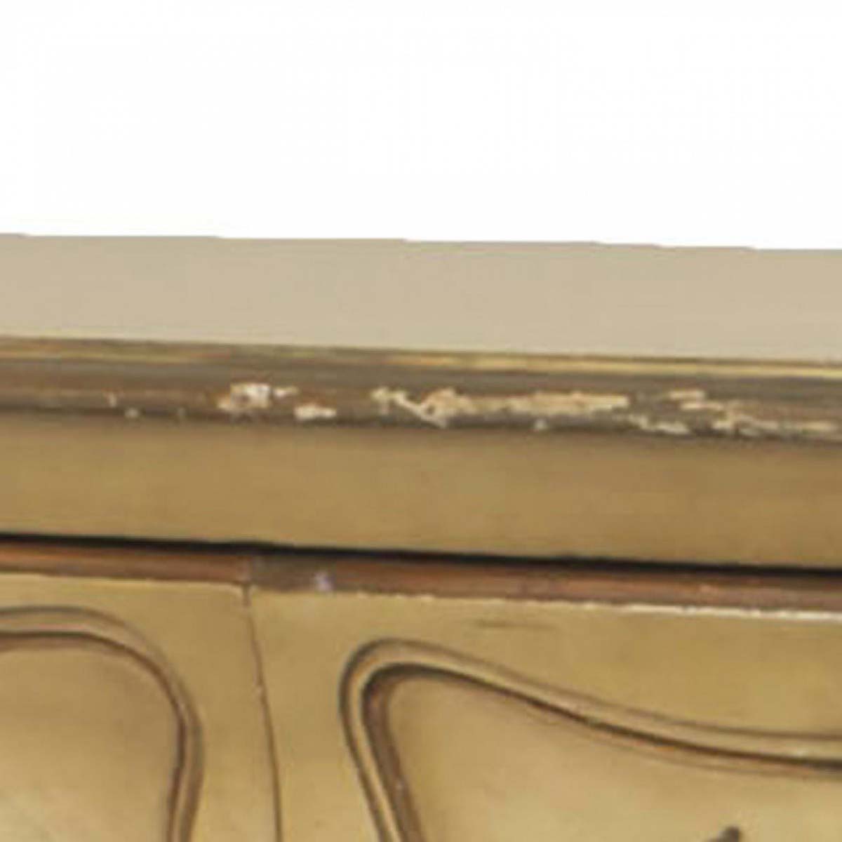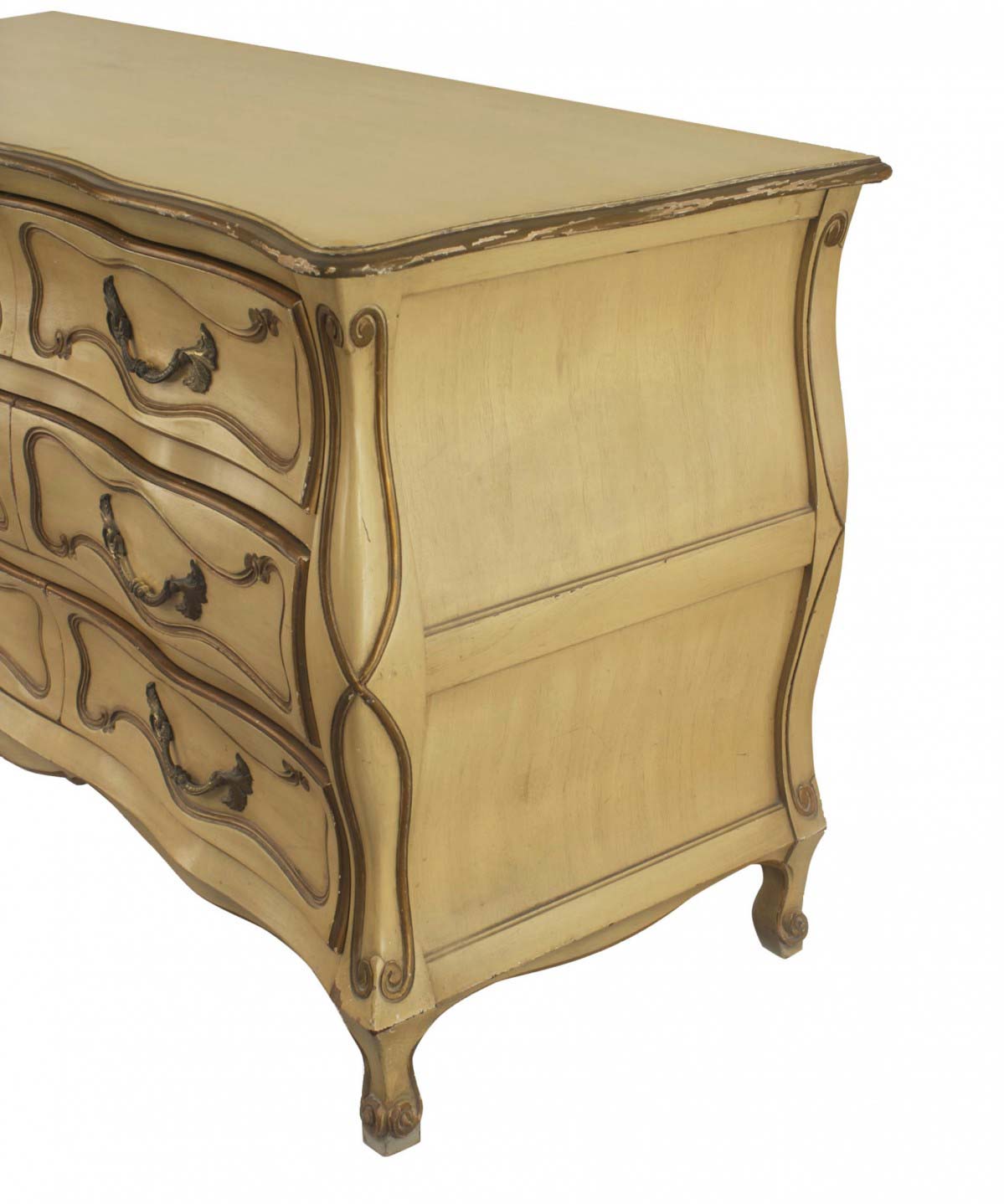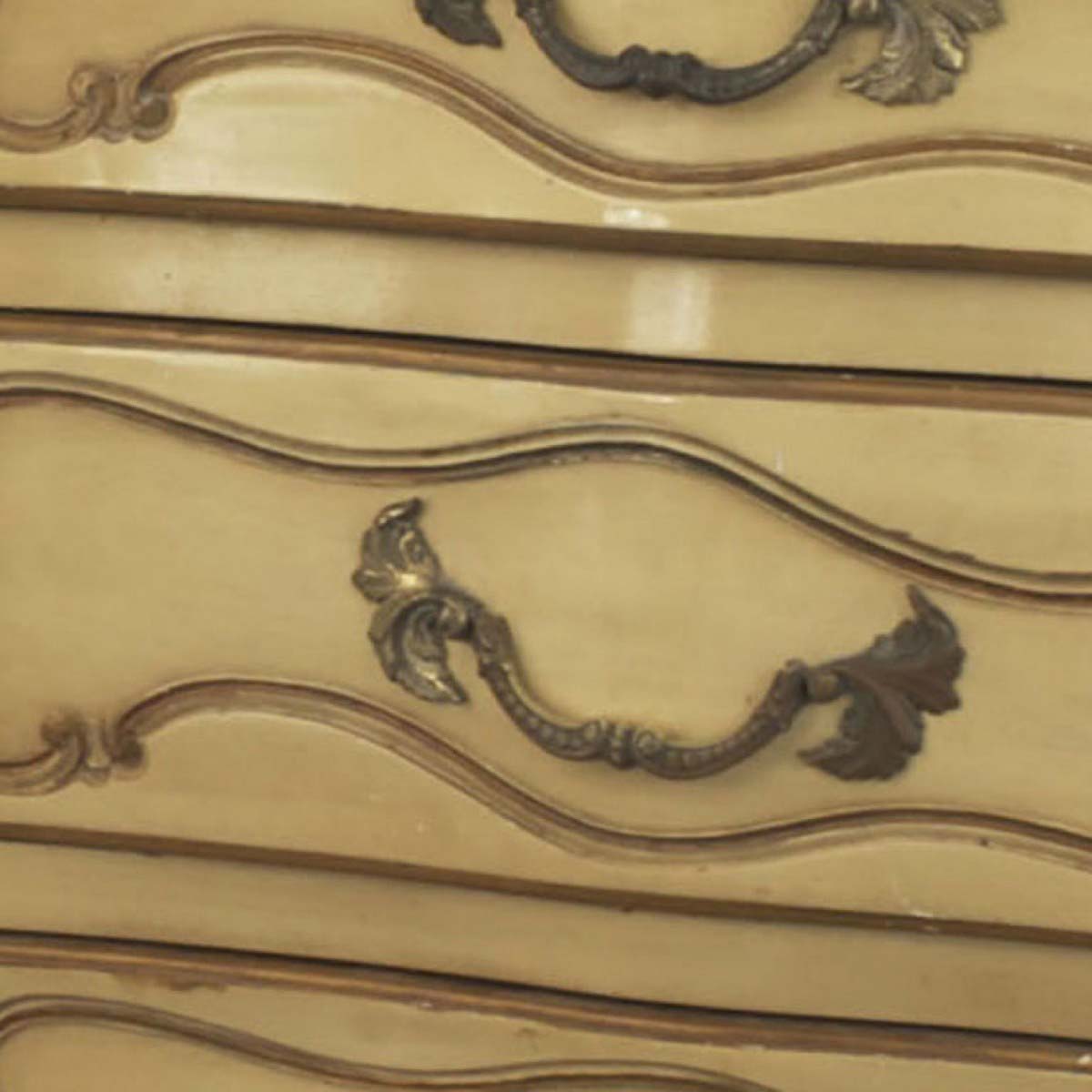 Italian Venetian style (1950s) pale yellow painted and gilt trimmed bedroom chest with 9 drawers and a bombe shape.