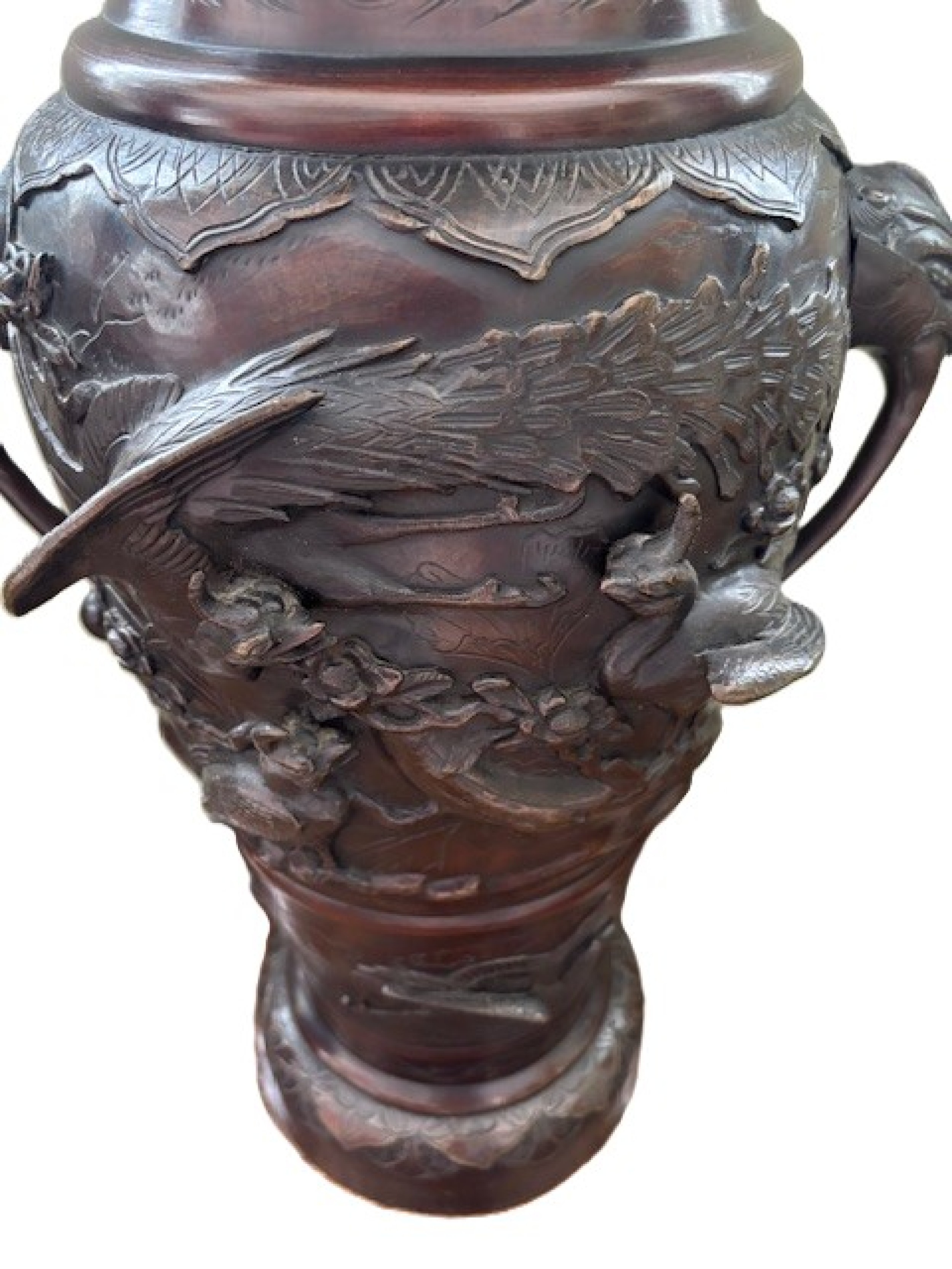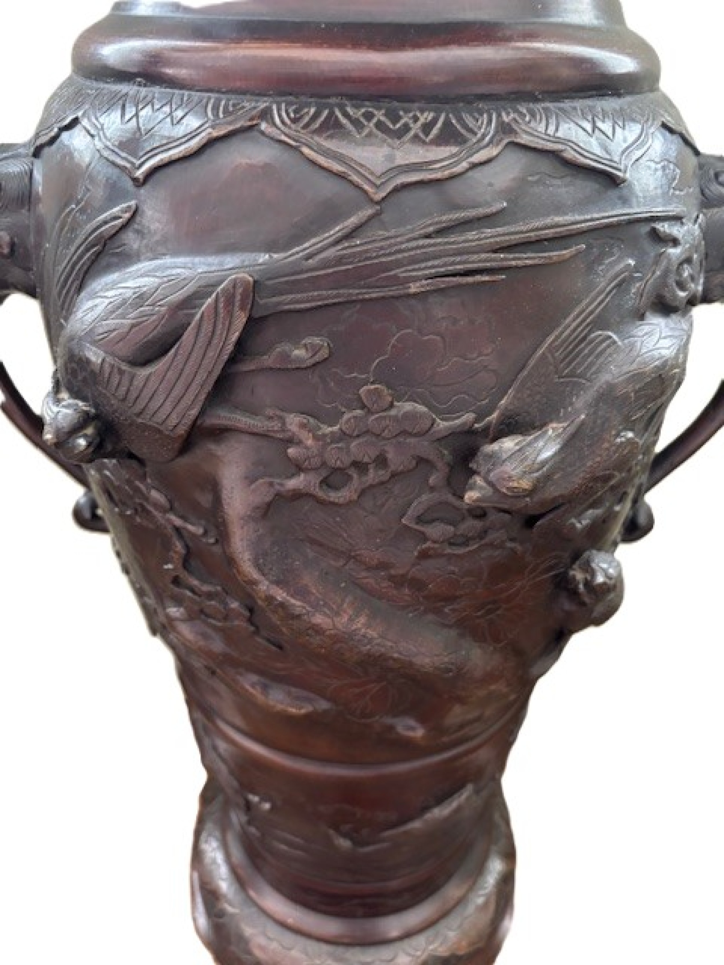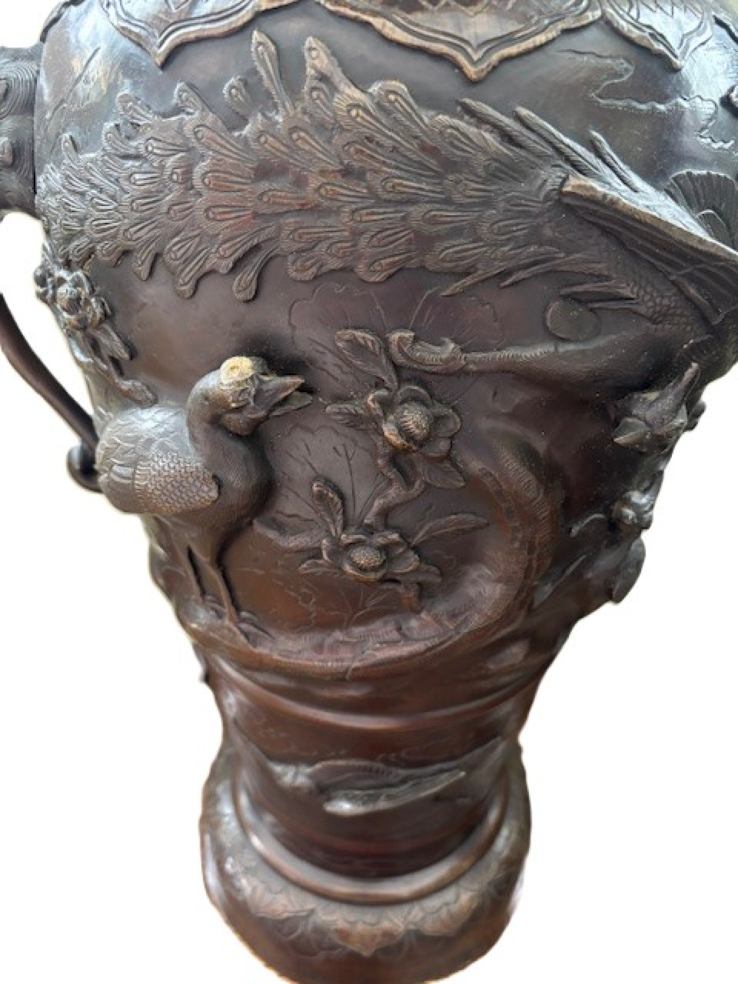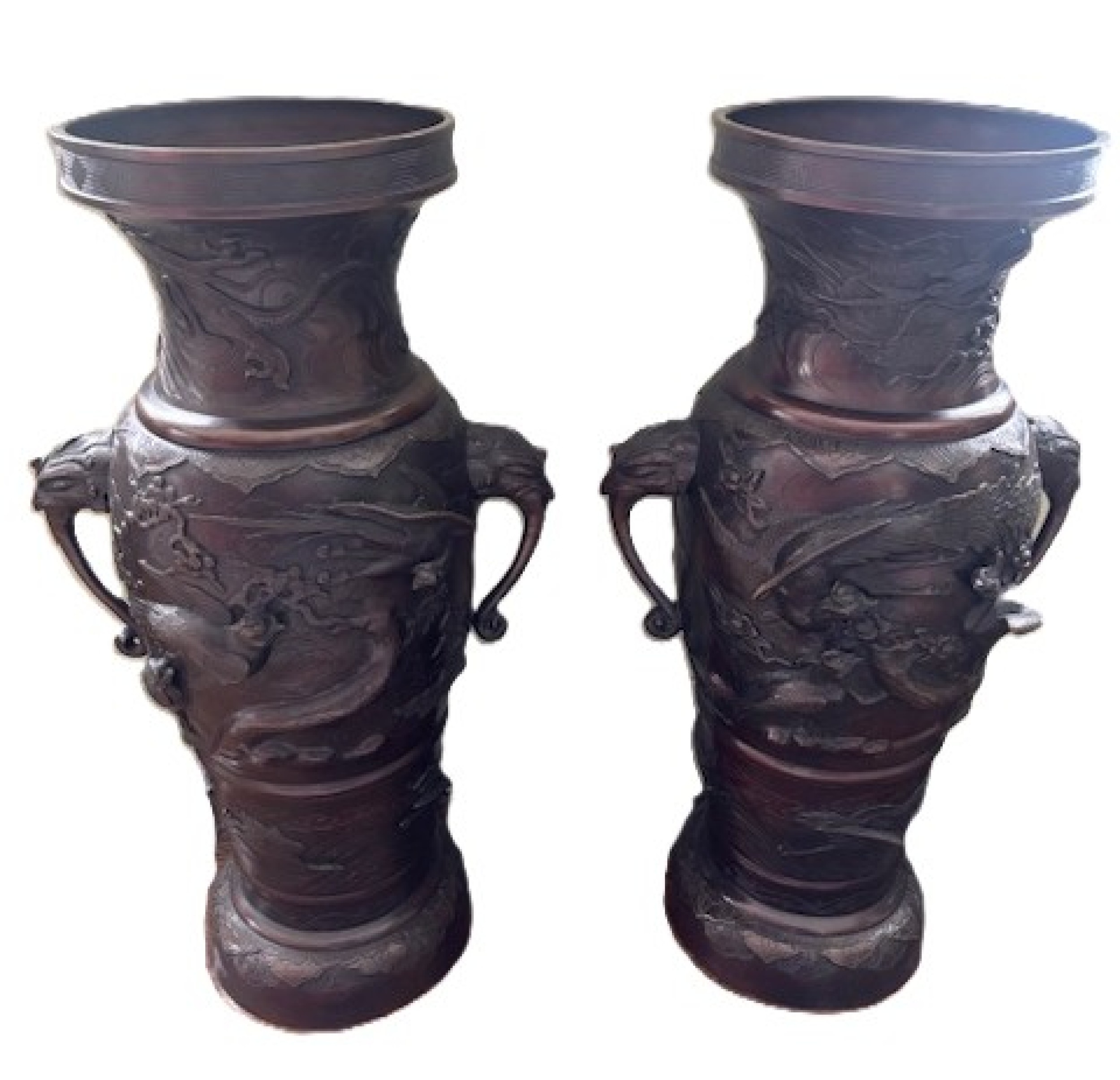 Pair of Japanese tall bronze floor vases with handles and bird relief