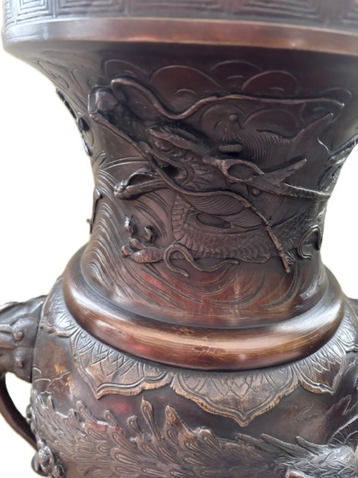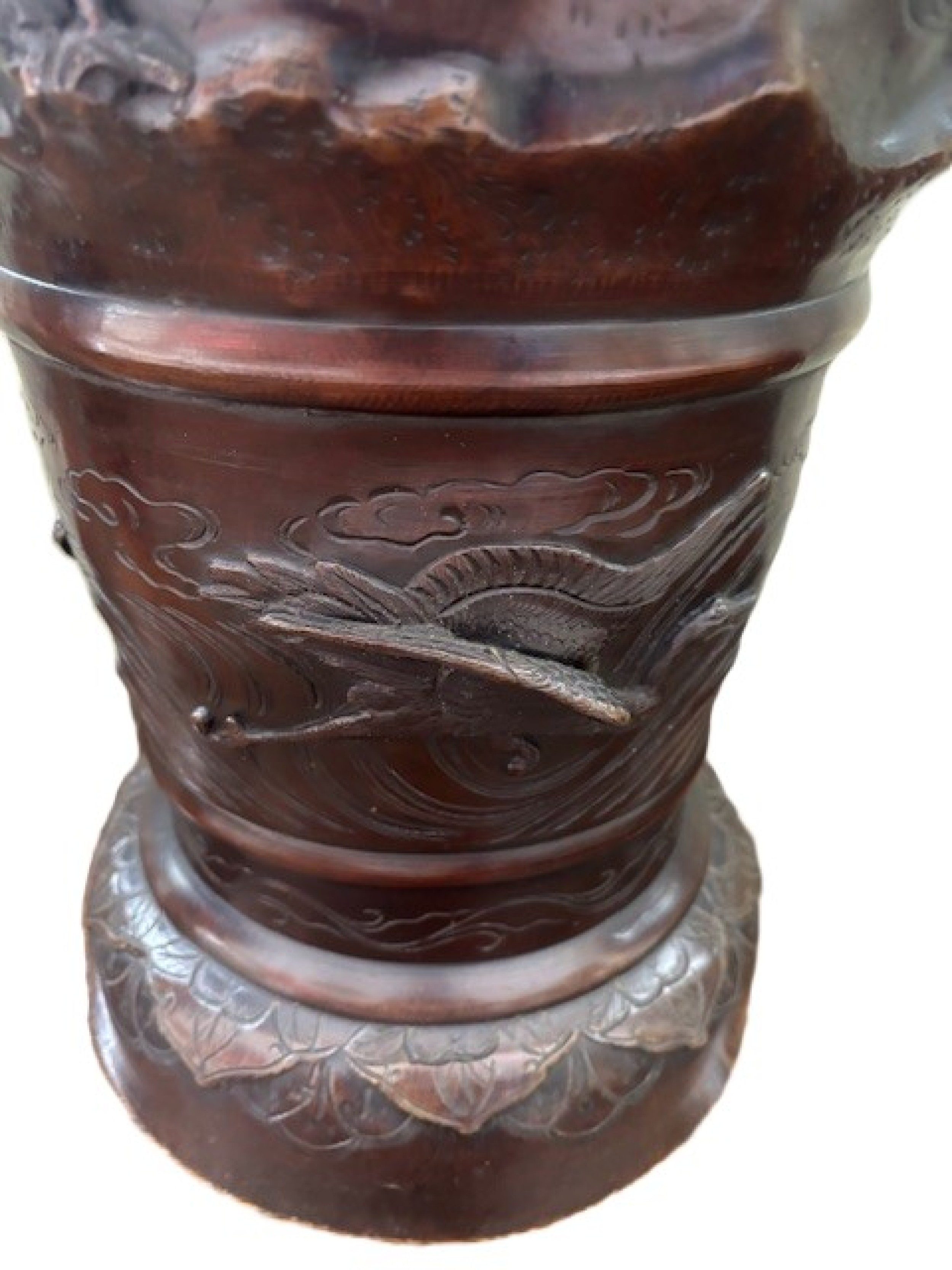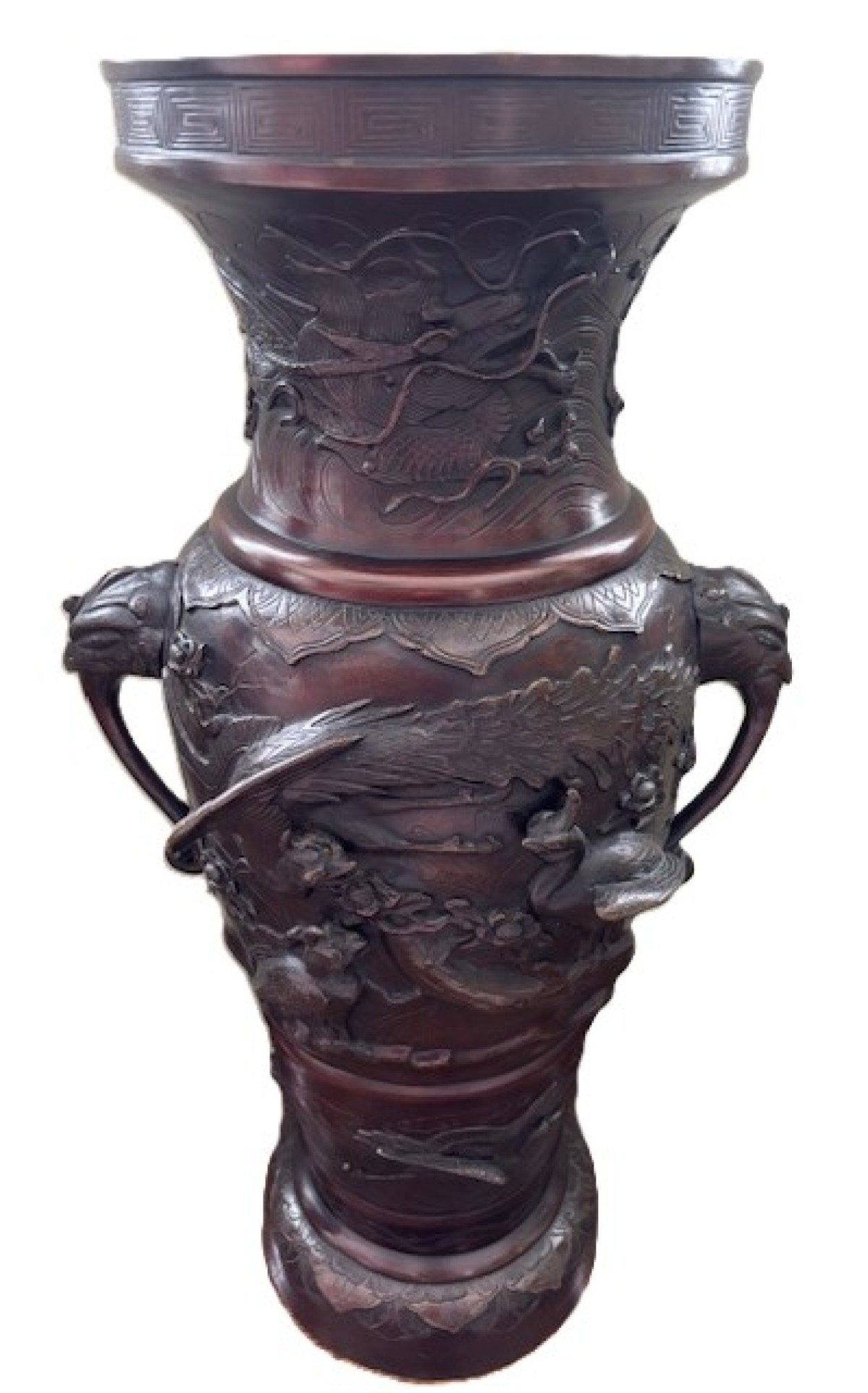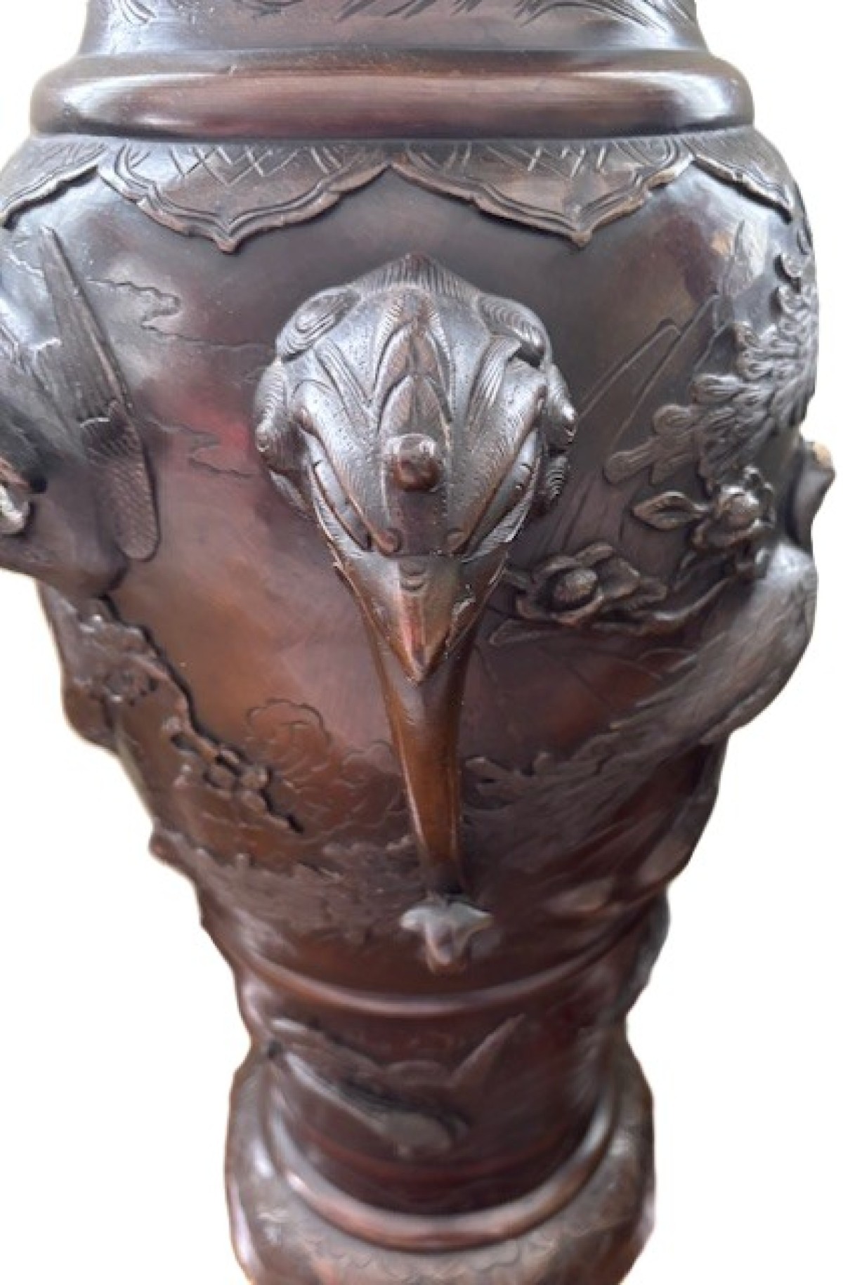 Pair of Japanese tall bronze floor vases with handles and bird relief