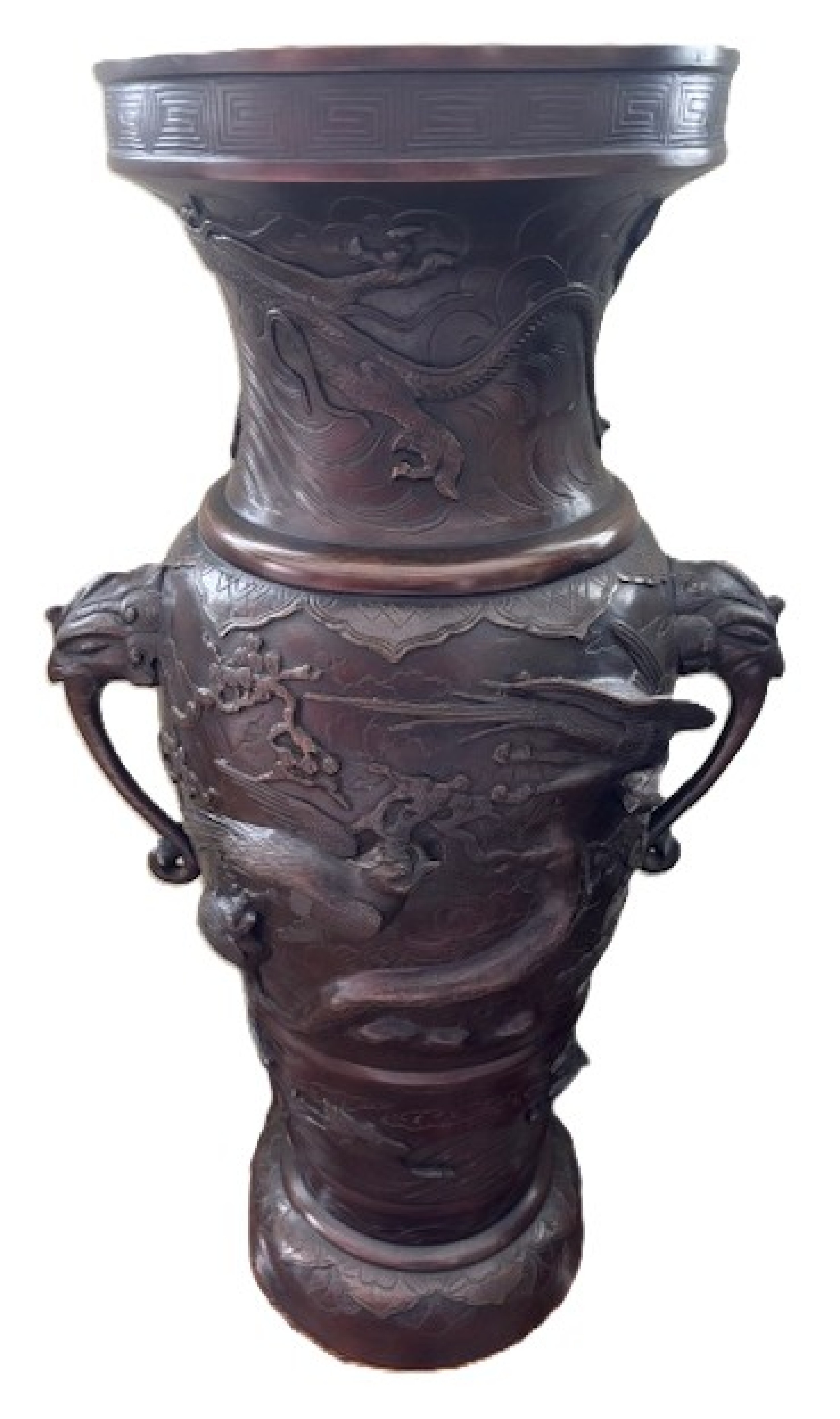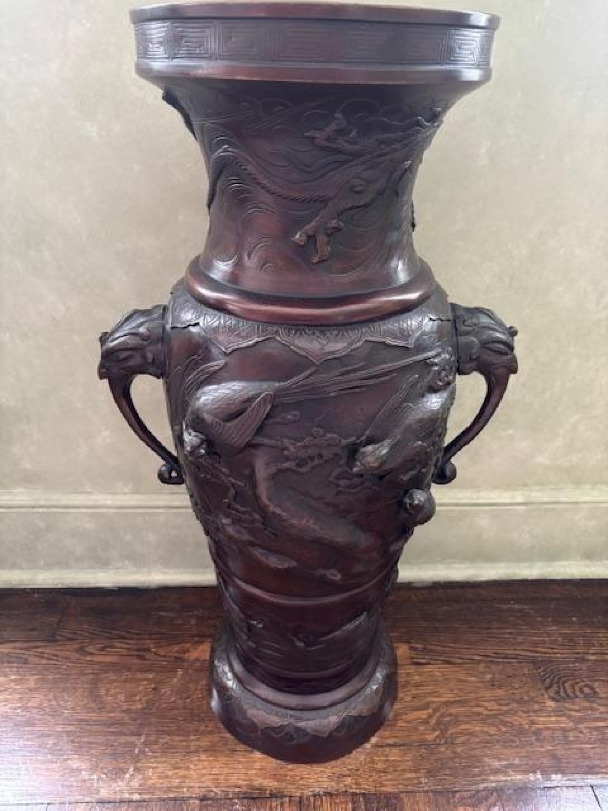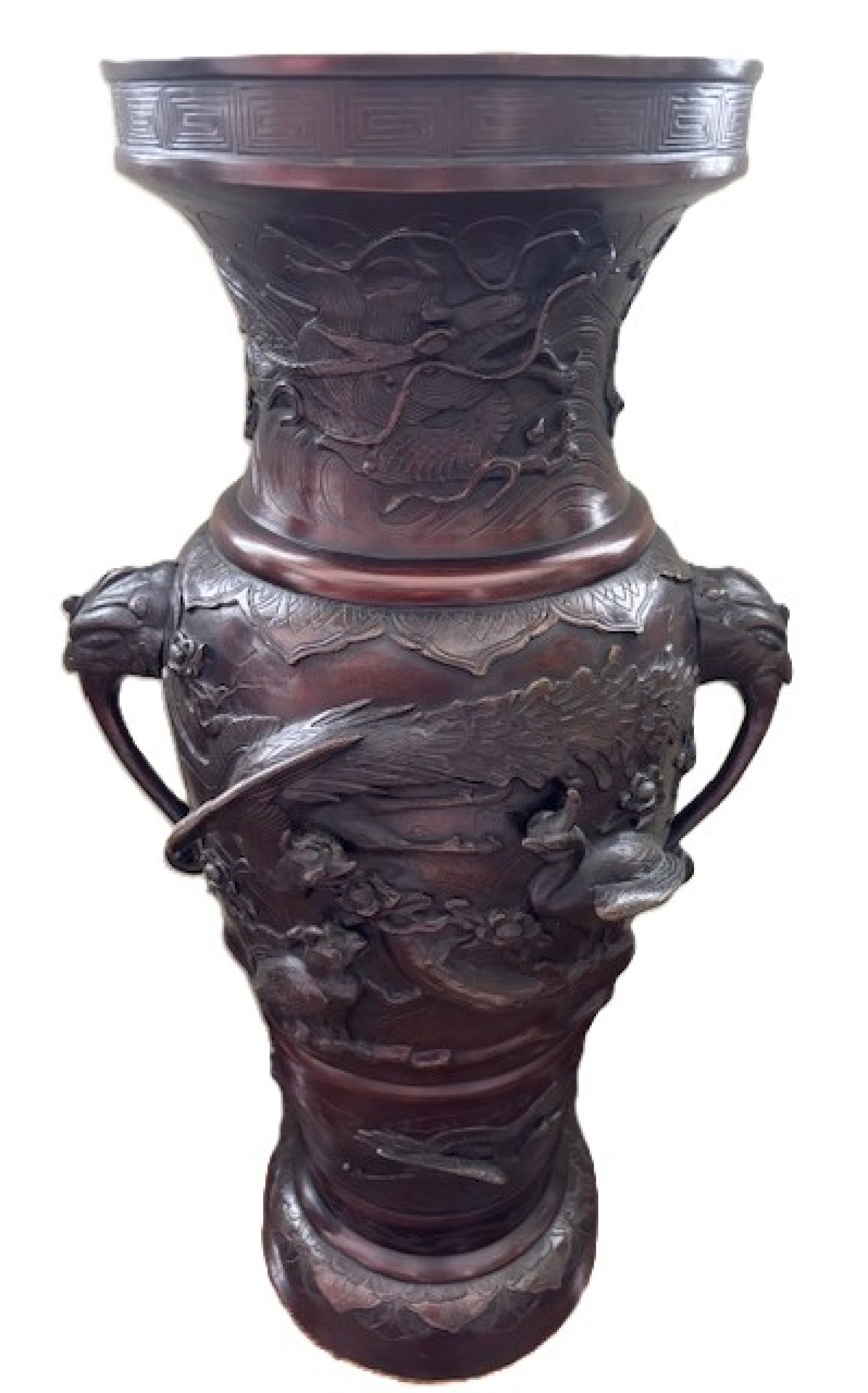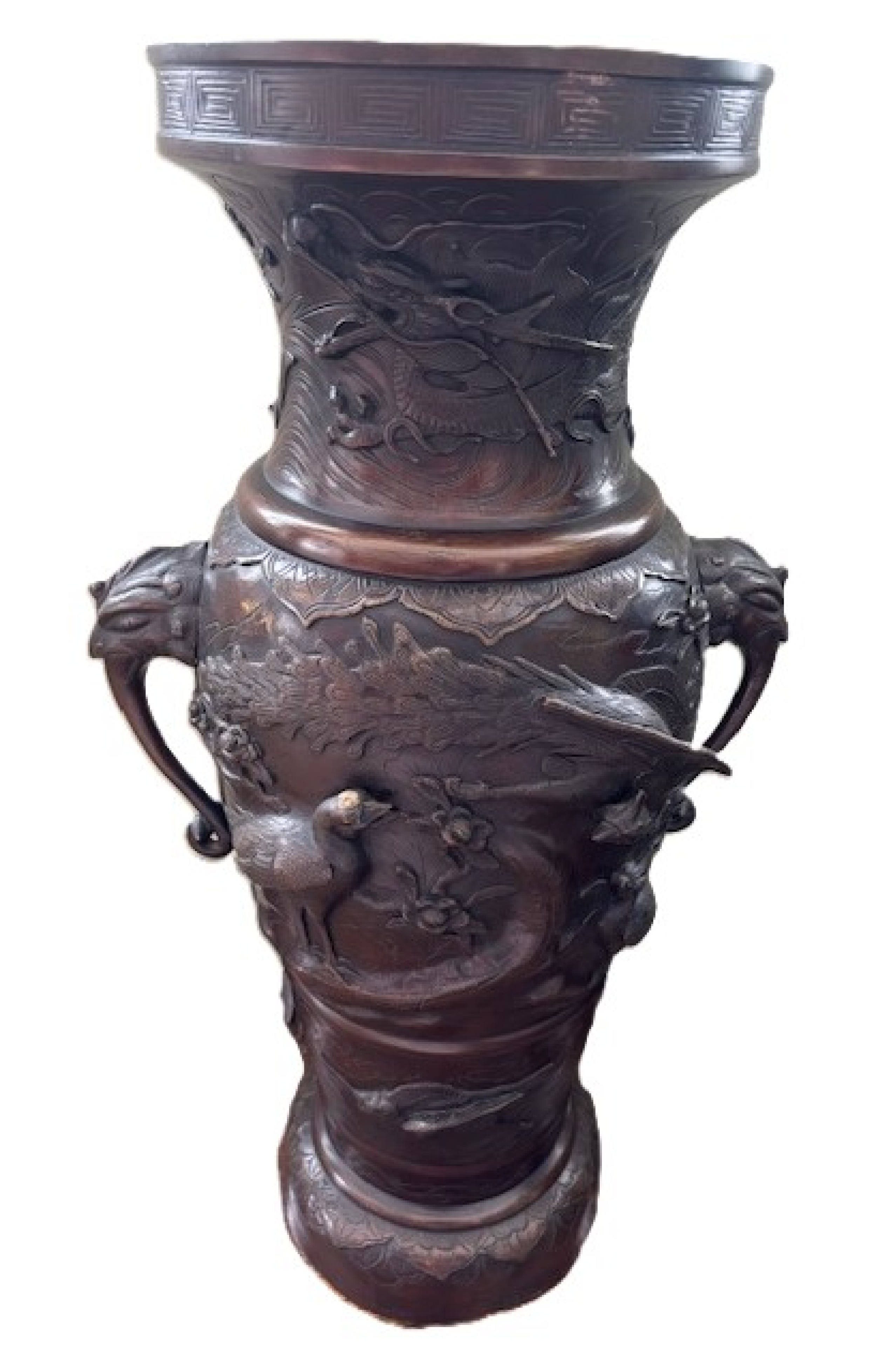 PAIR of Japanese (19th Century) tall bronze floor vases with handles having bird and floral relief (PRICED AS PAIR)