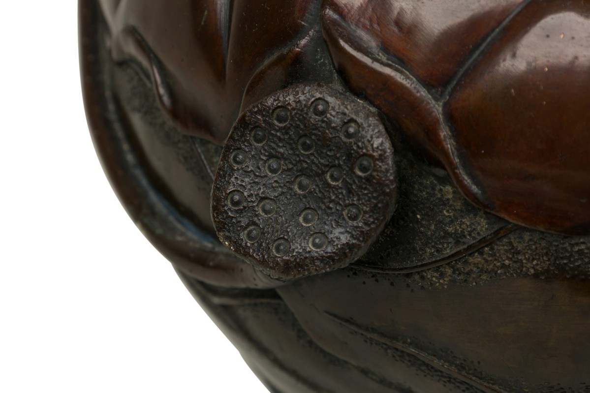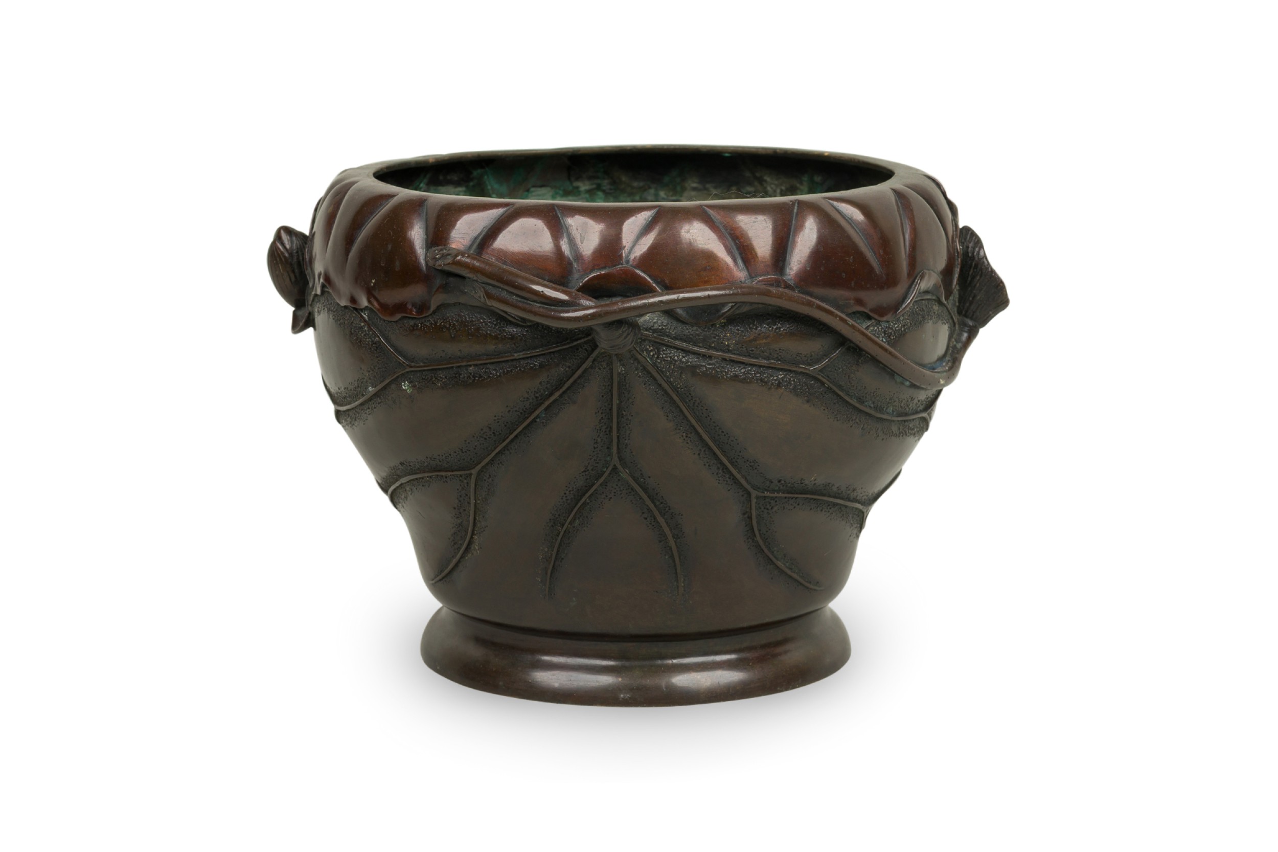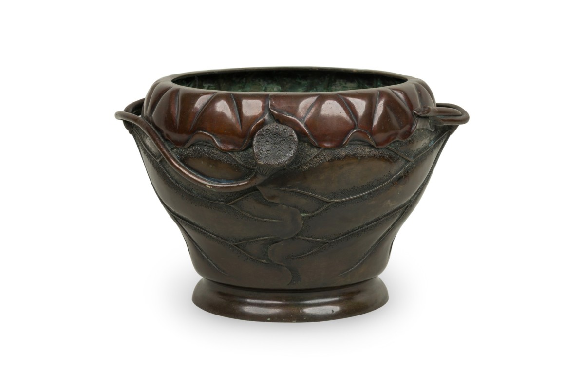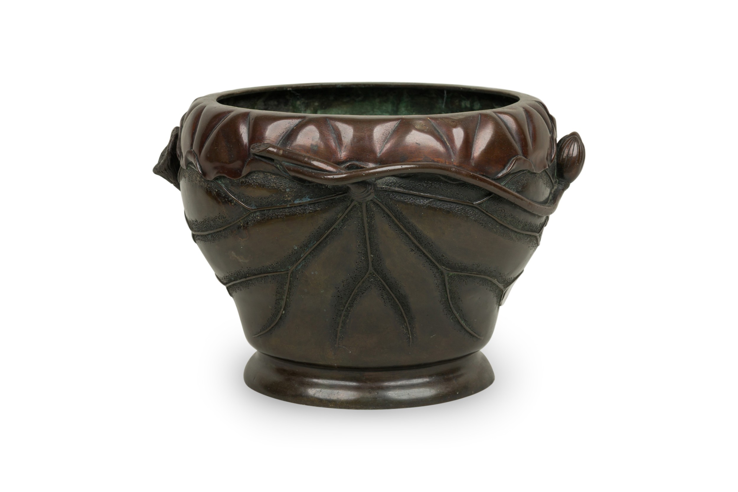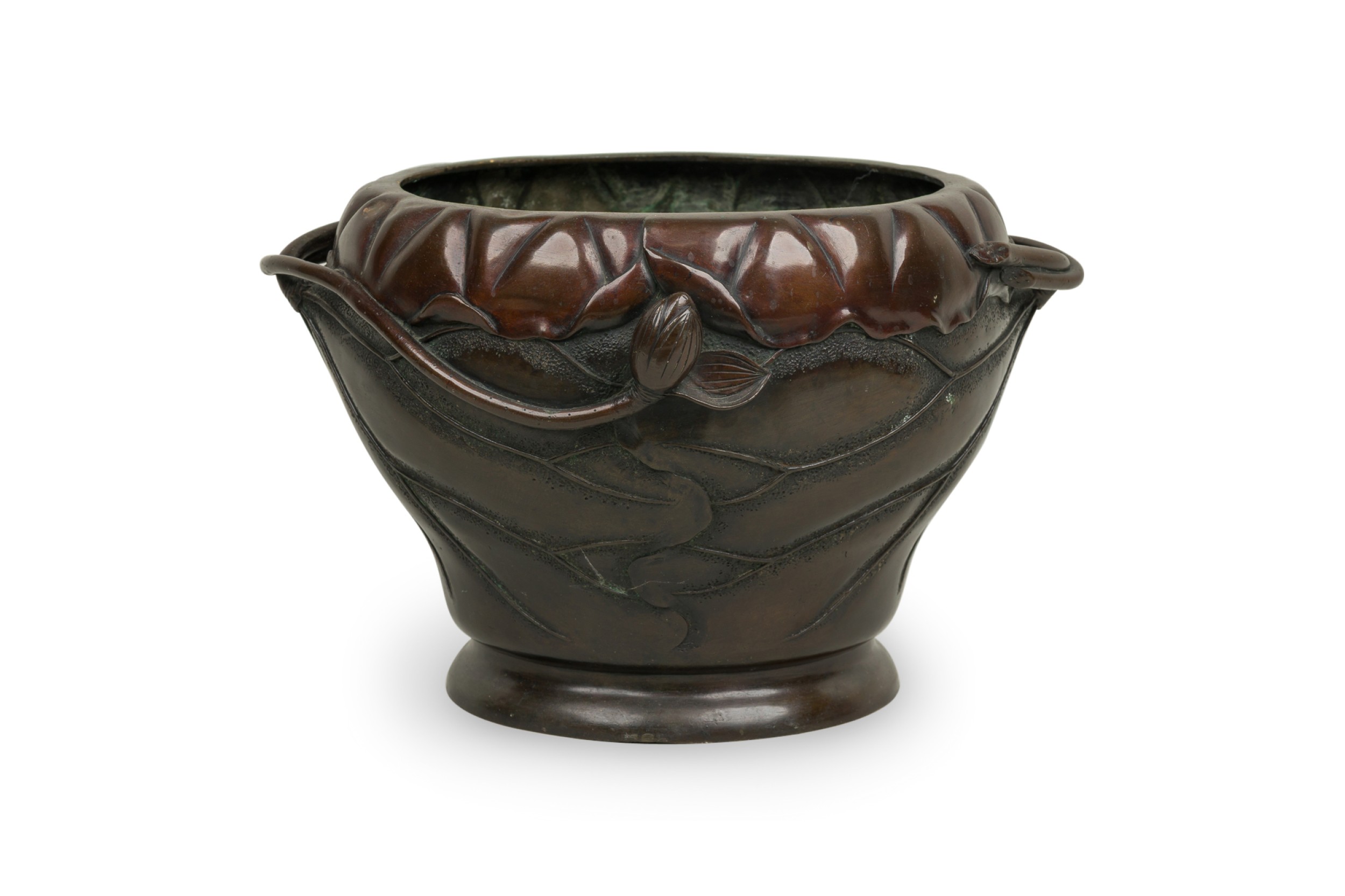 Japanese (19th Century) round shaped bronze jardiniere with bamboo and floral relief having open floral handles on a subtly raised round base