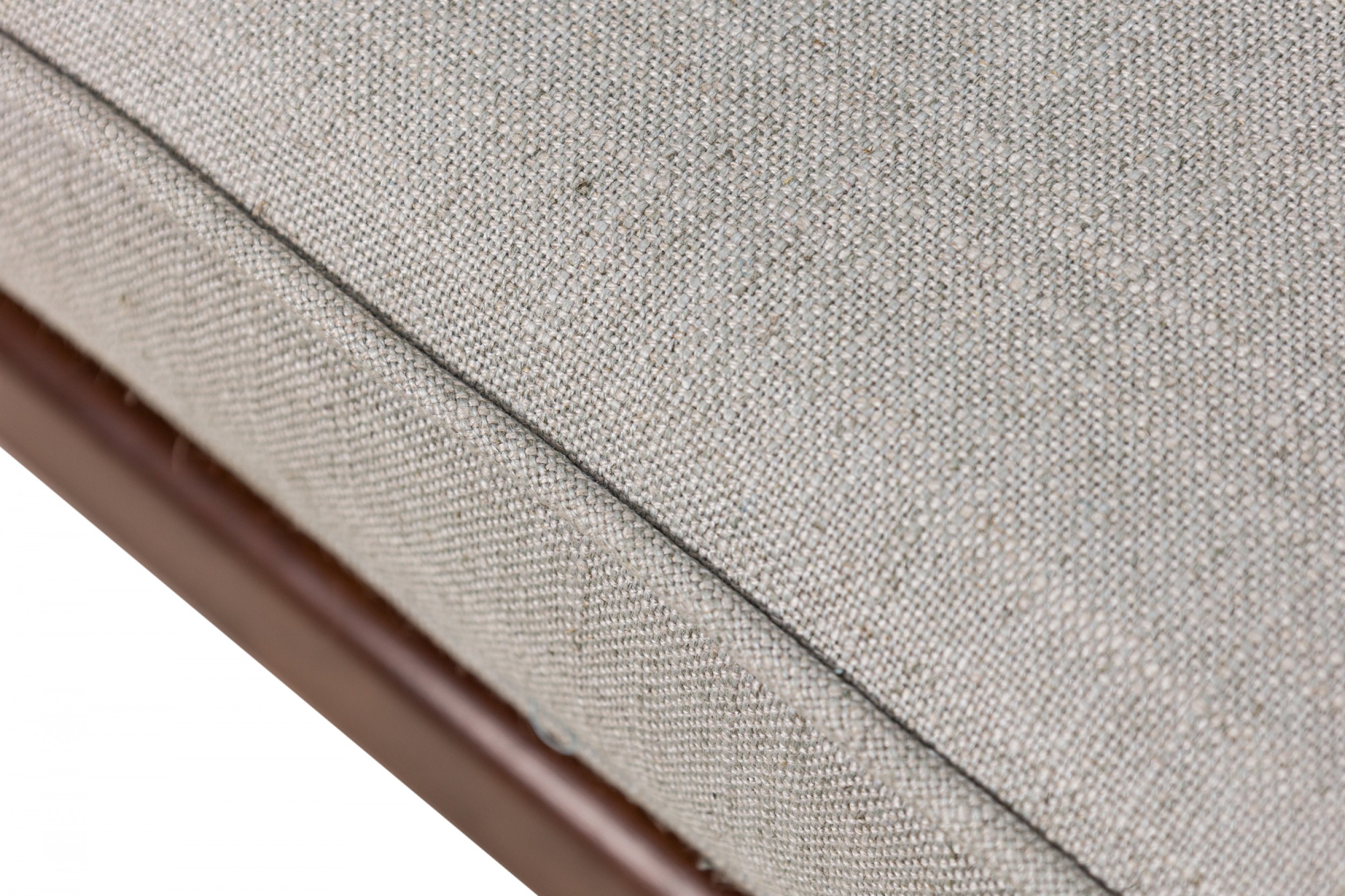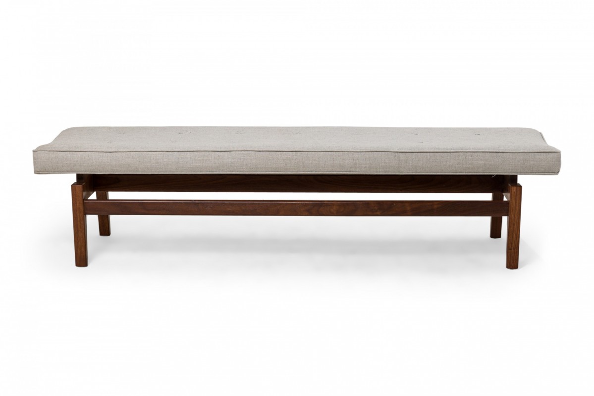 Danish Mid-Century floating bench with a walnut stretcher base supporting a rectangular seat cushion upholstered in light gray woven fabric with button tufted detail.