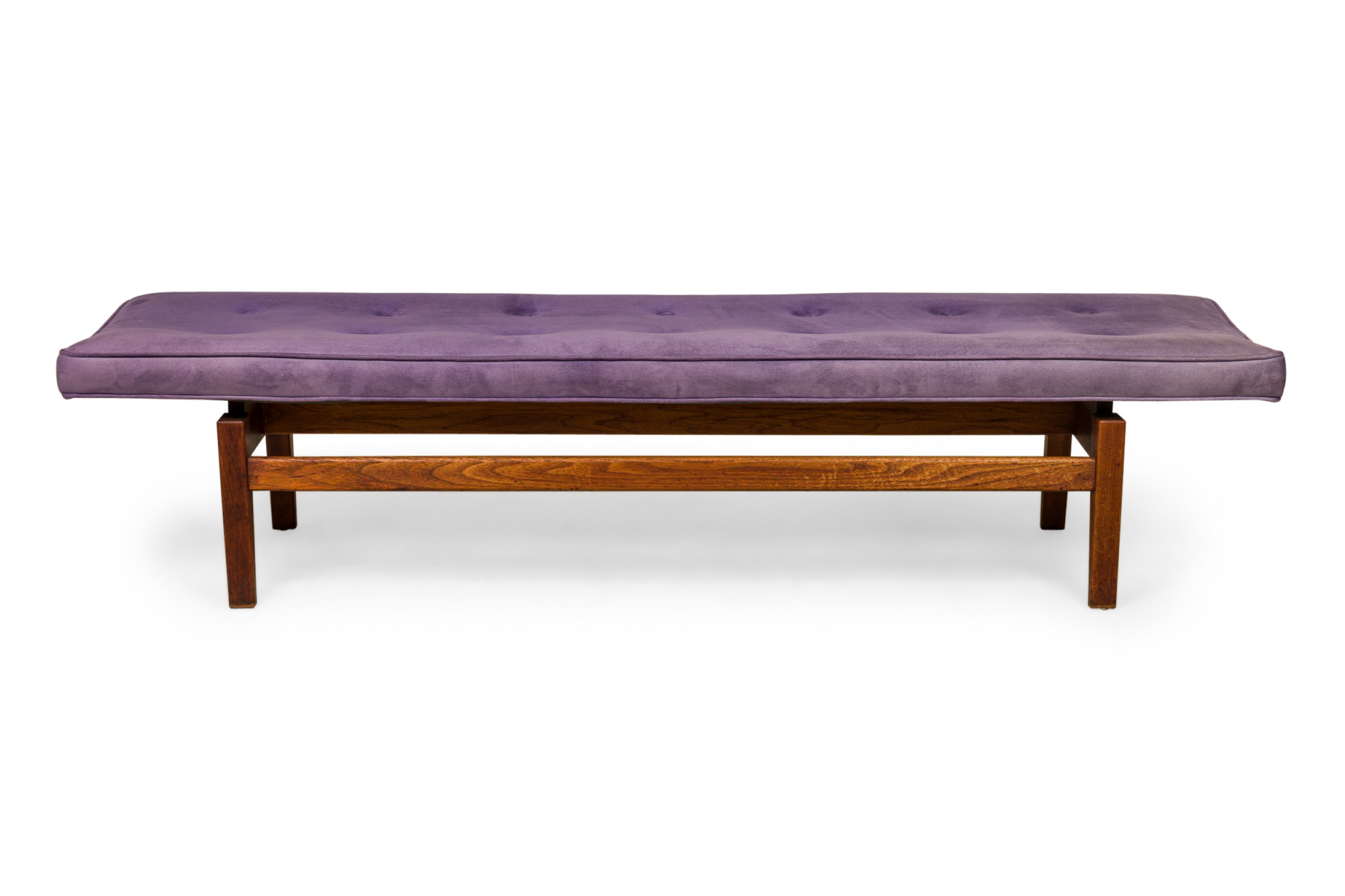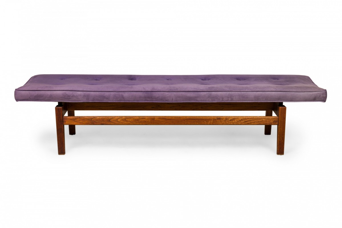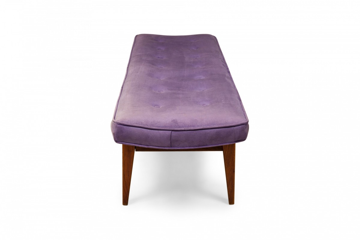 Danish Mid-Century rectangular floating bench with a purple button tufted velour seat resting on a wooden floating frame base.