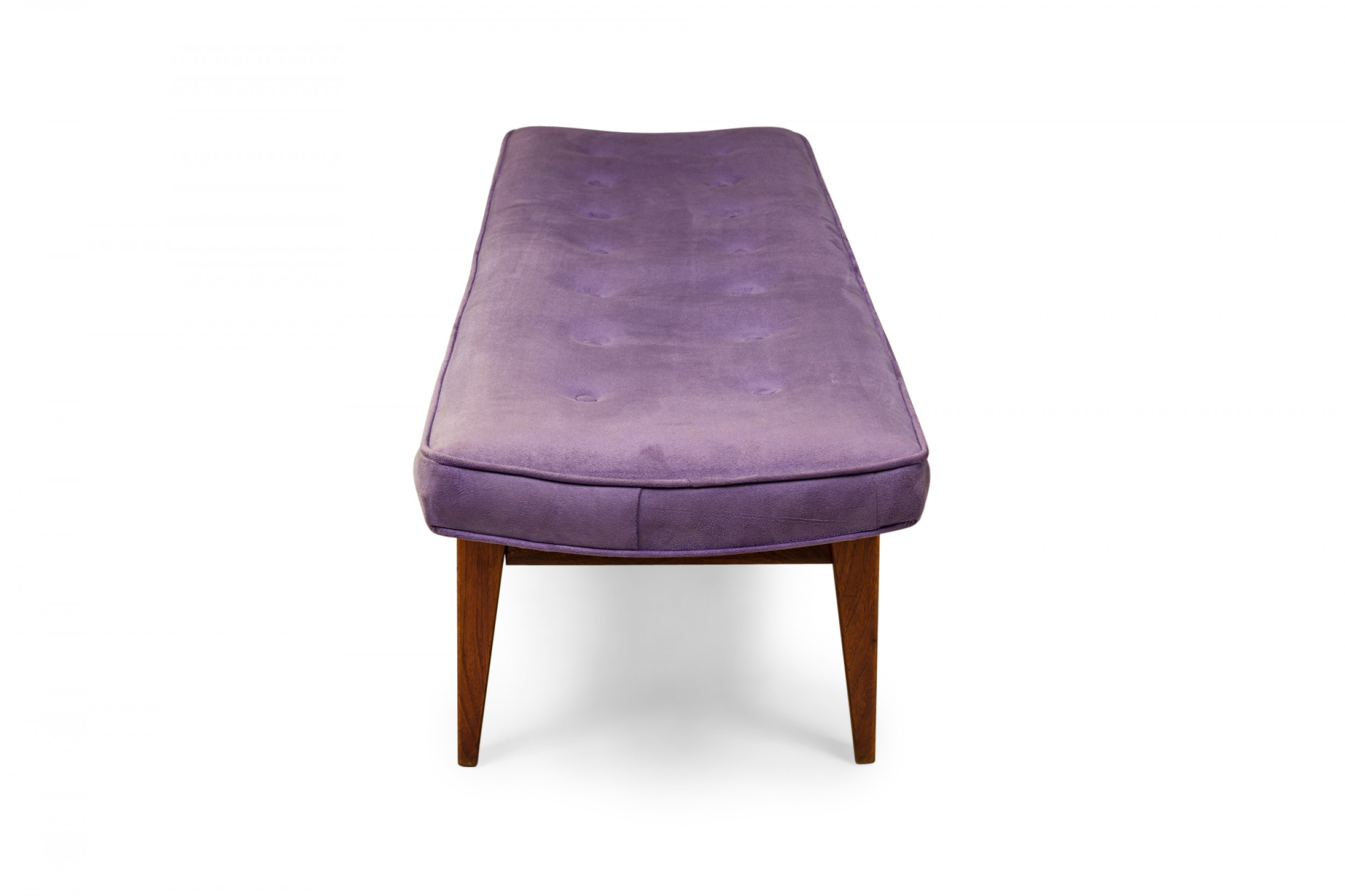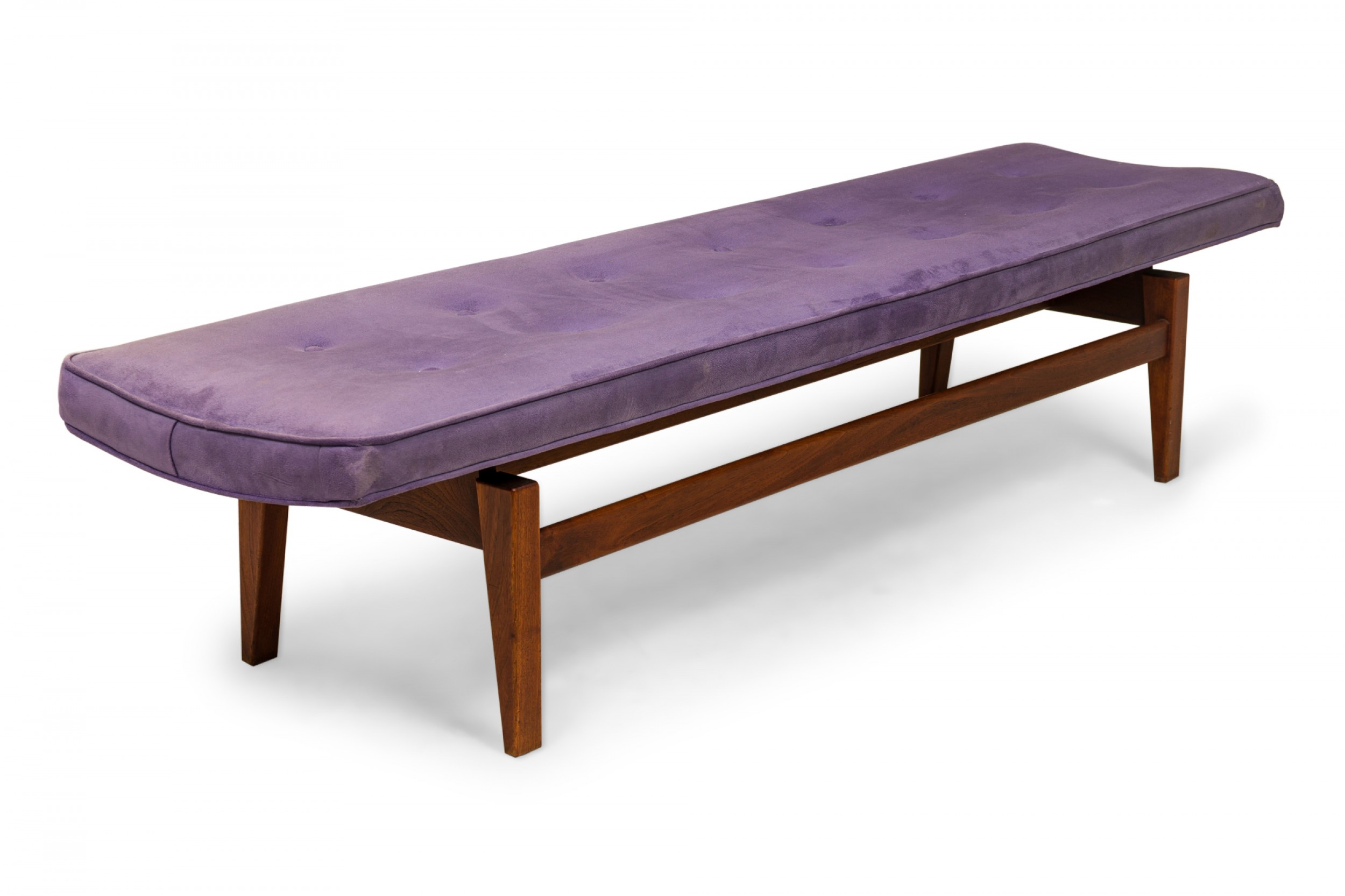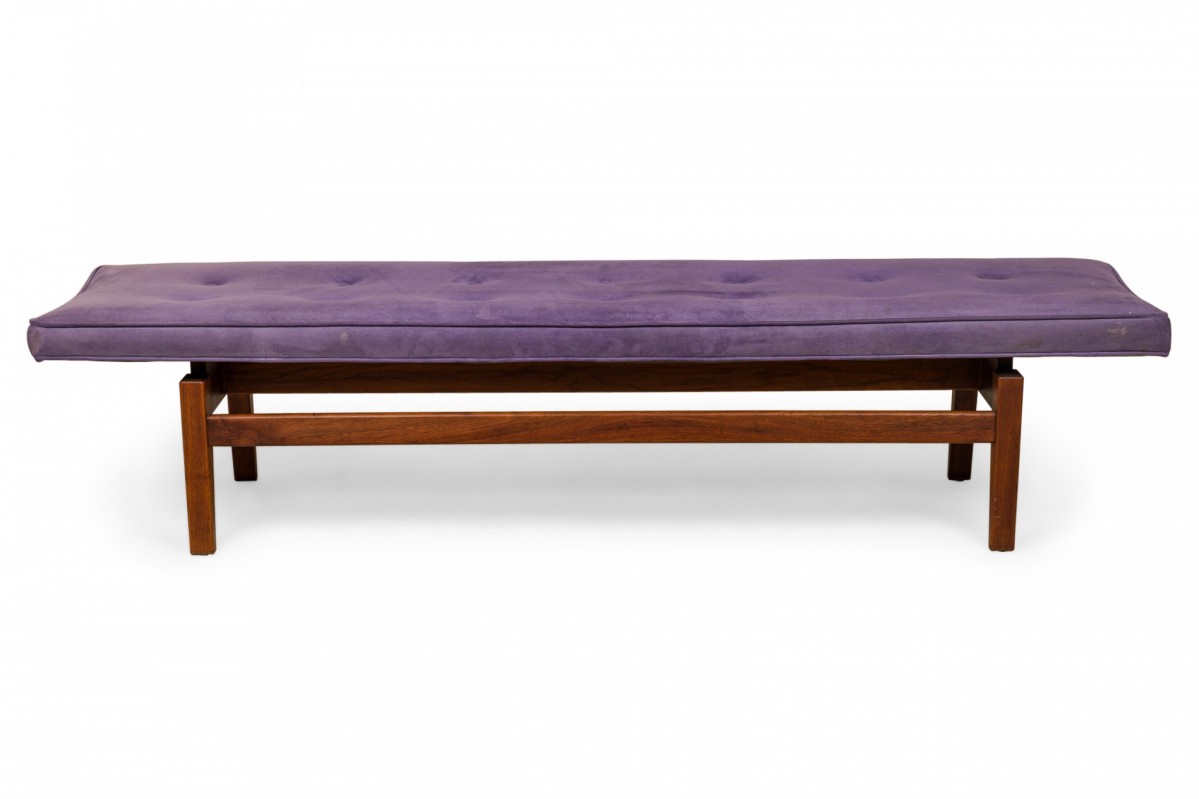 Danish Mid-Century rectangular floating bench with a purple button tufted velour seat resting on a wooden floating frame base.