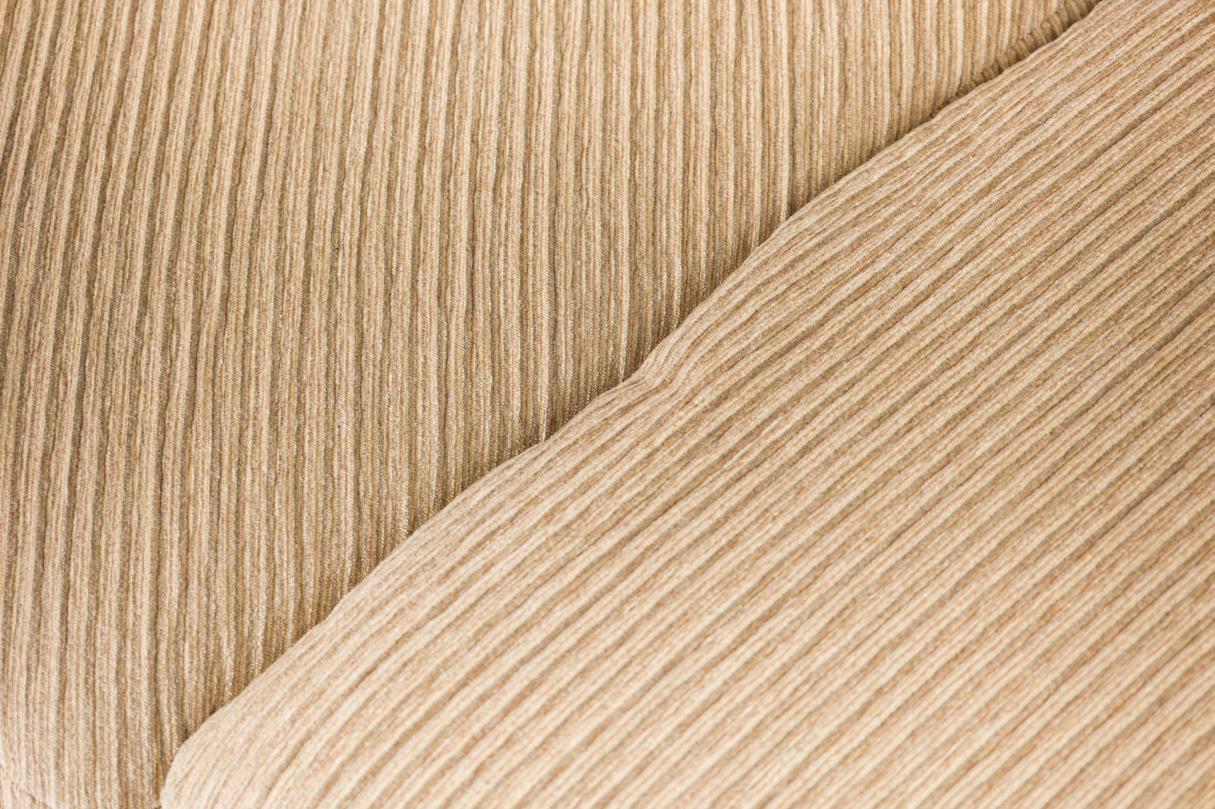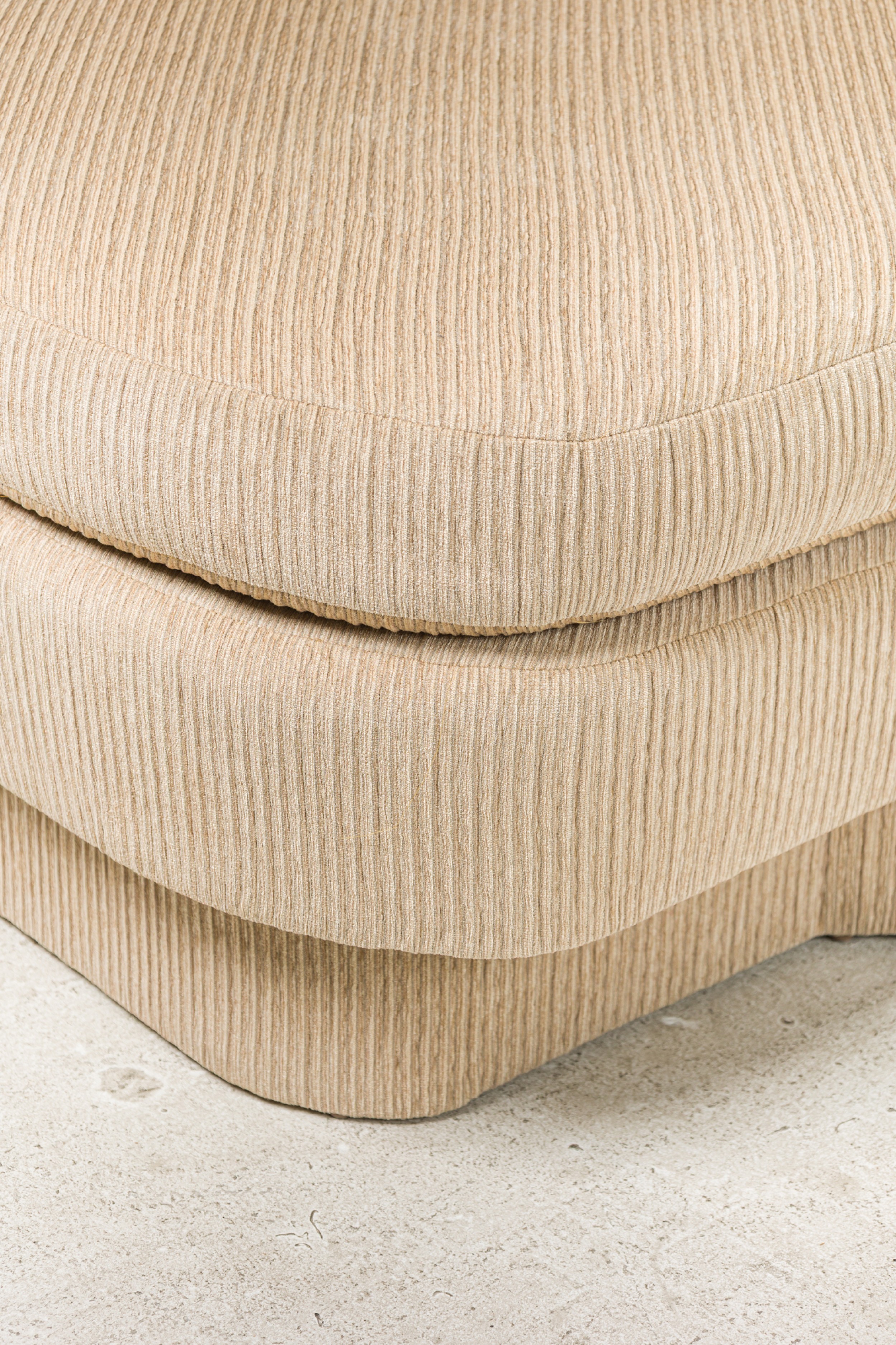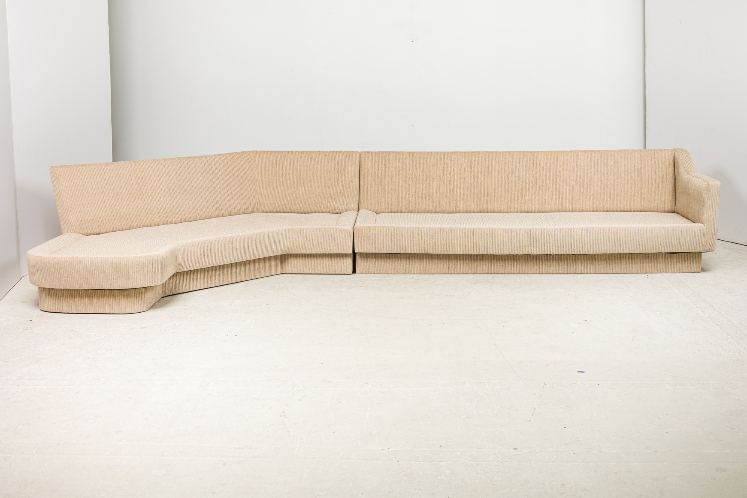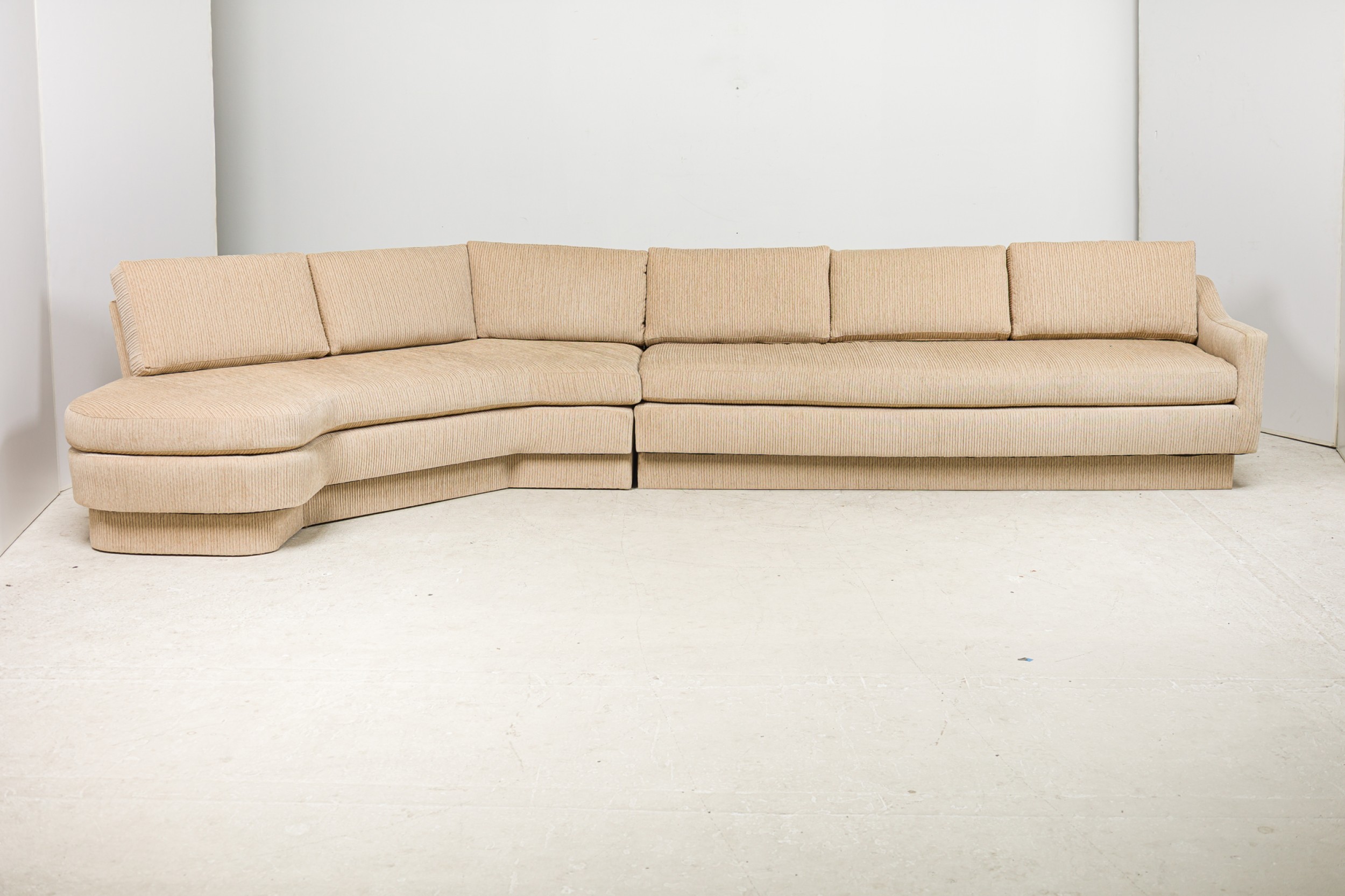 American Mid-Century large curved 2- piece sectional with ribbed tan wool upholstery, with sic loose back cushions, with angled end, ending on plinth base