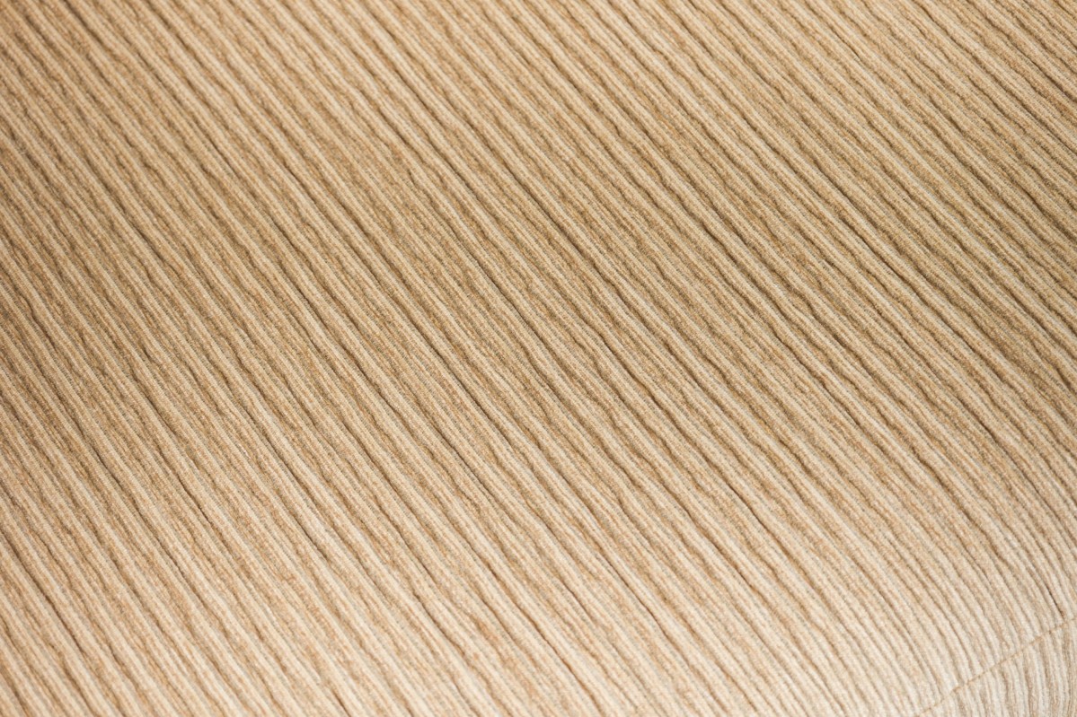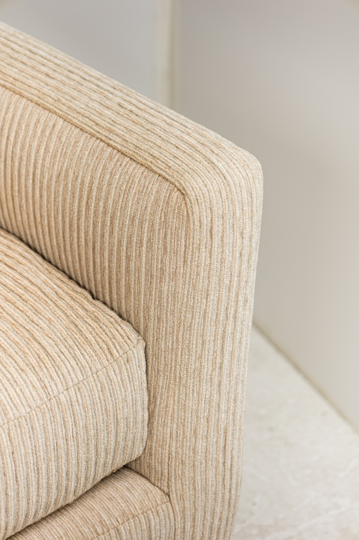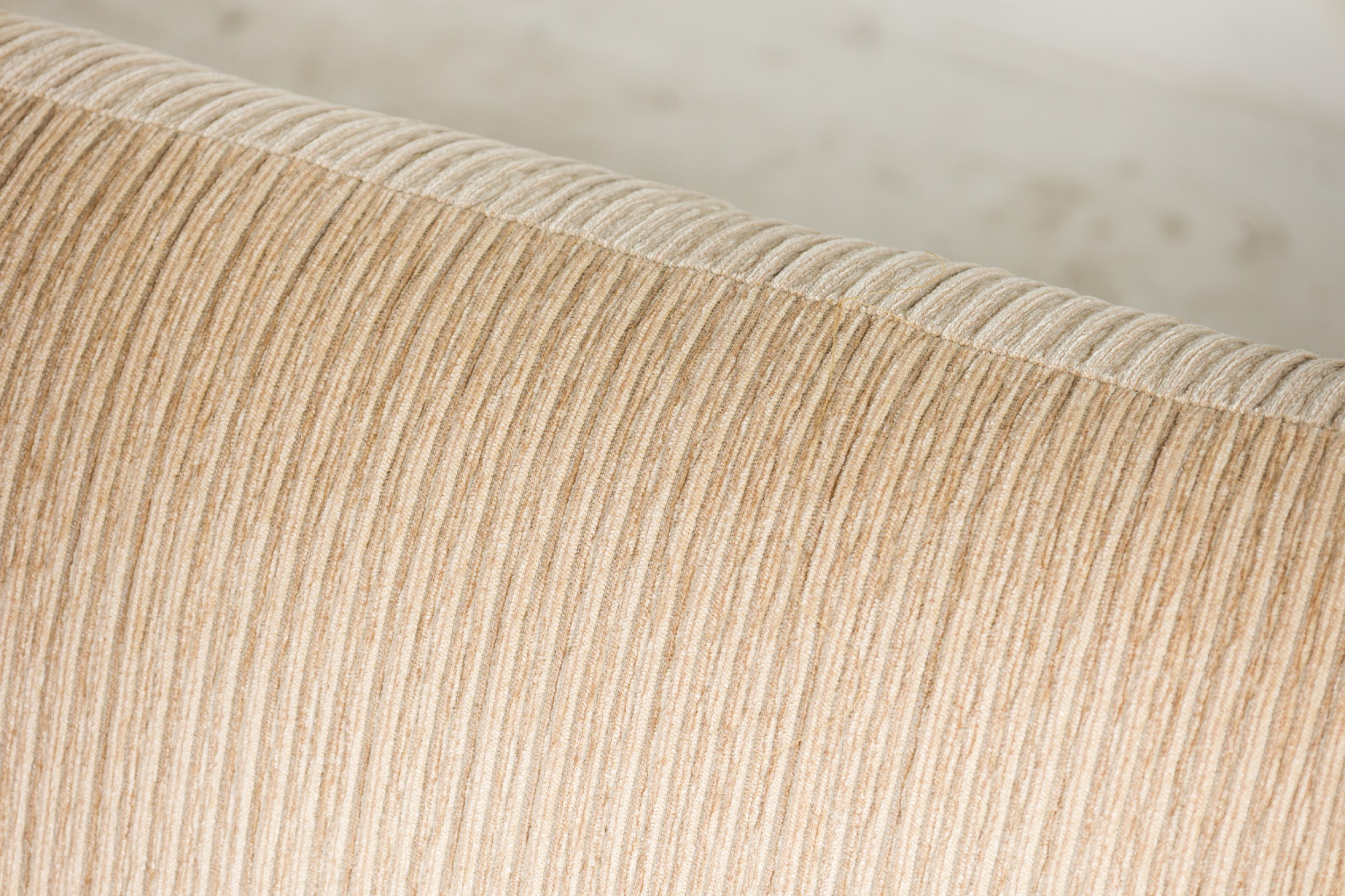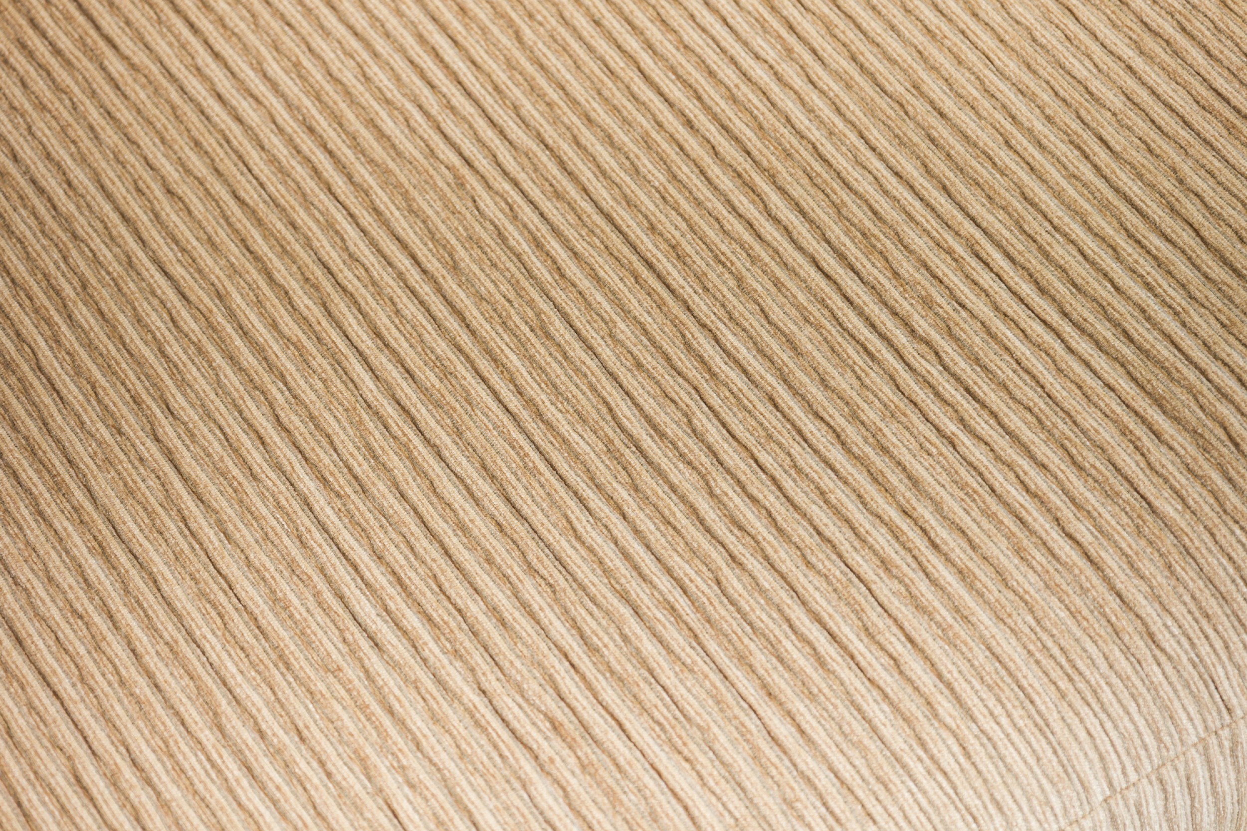 American Mid-Century large curved 2- piece sectional with ribbed tan wool upholstery, with sic loose back cushions, with angled end, ending on plinth base