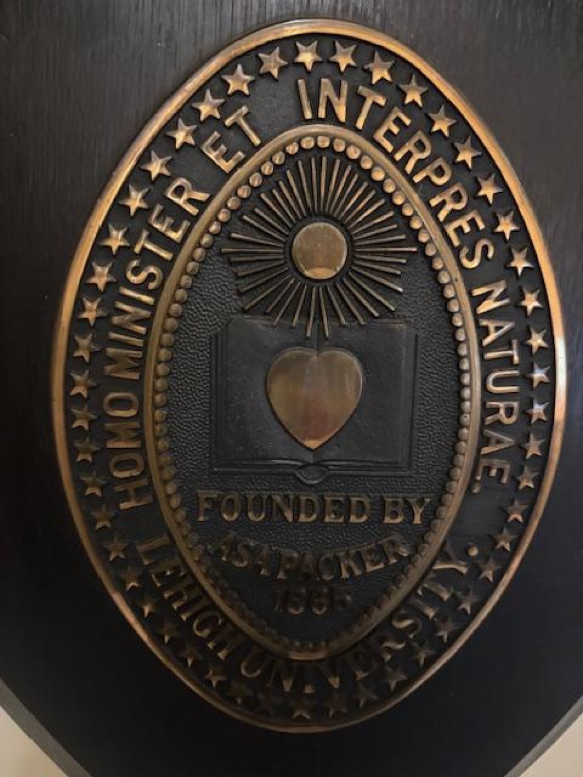 American Mid-Century oval bronze seal medalion wall plaque on a stained wood shield backing of Lehigh University