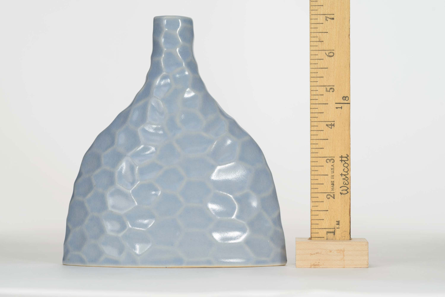 Light blue ceramic bud vase with hammered design and crackle glaze