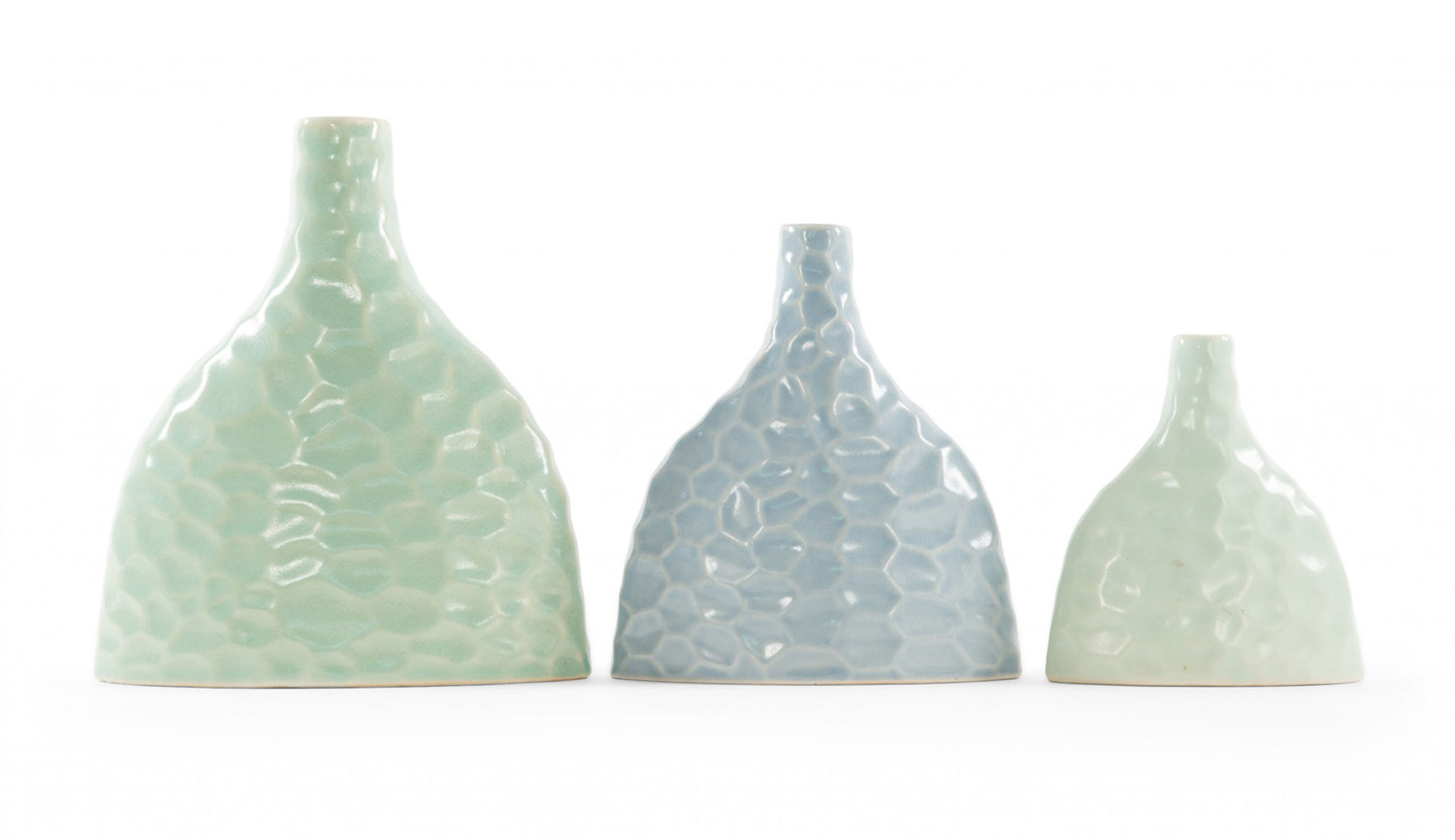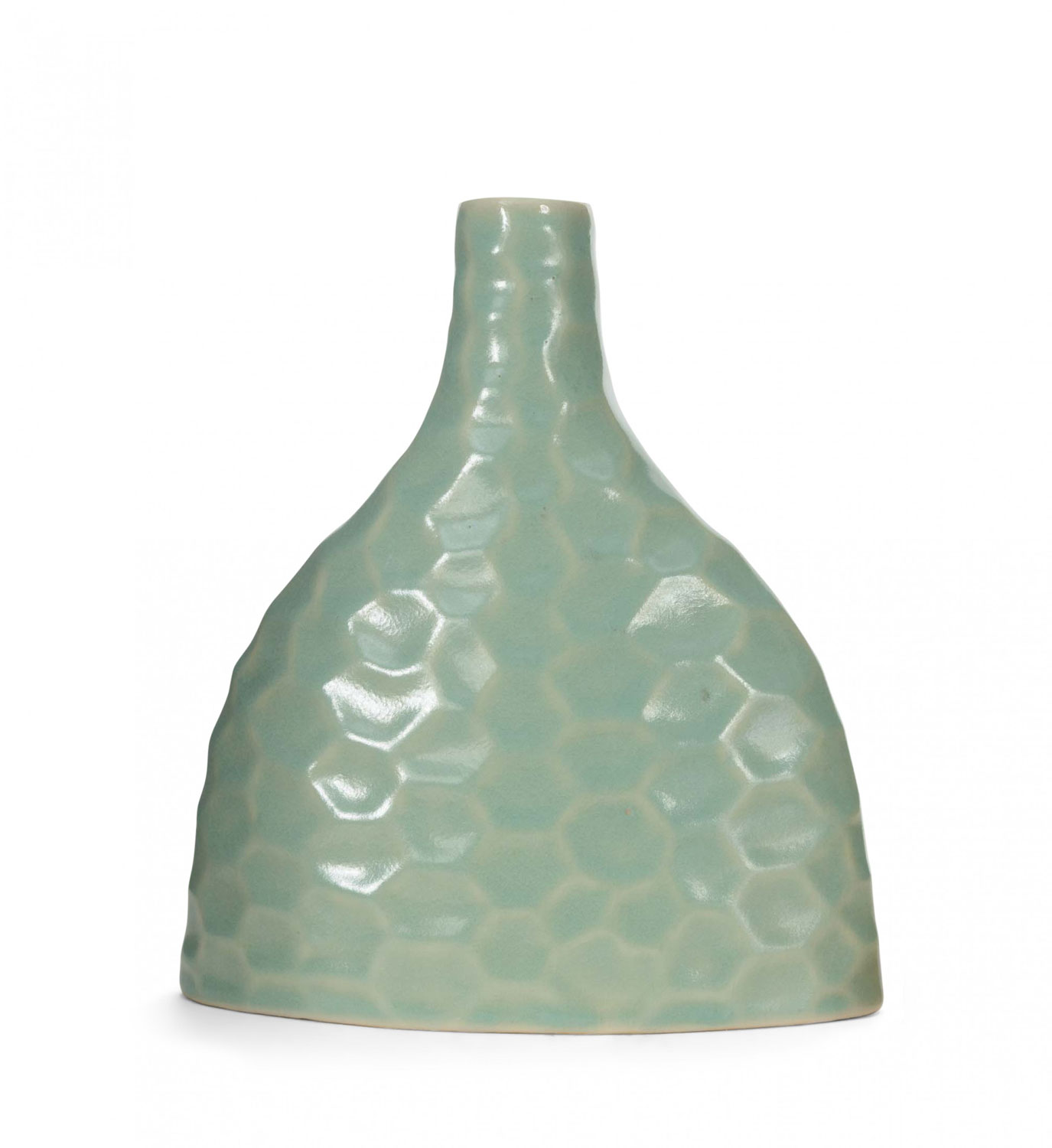 Mint-colored ceramic bud vase with hammered design and crackle glaze