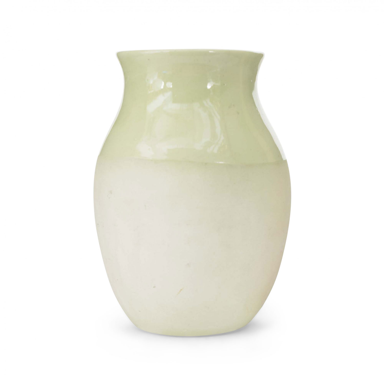 Bulbous-shaped, light mint-colored glazed ceramic vase with shiny, darker glaze on top third