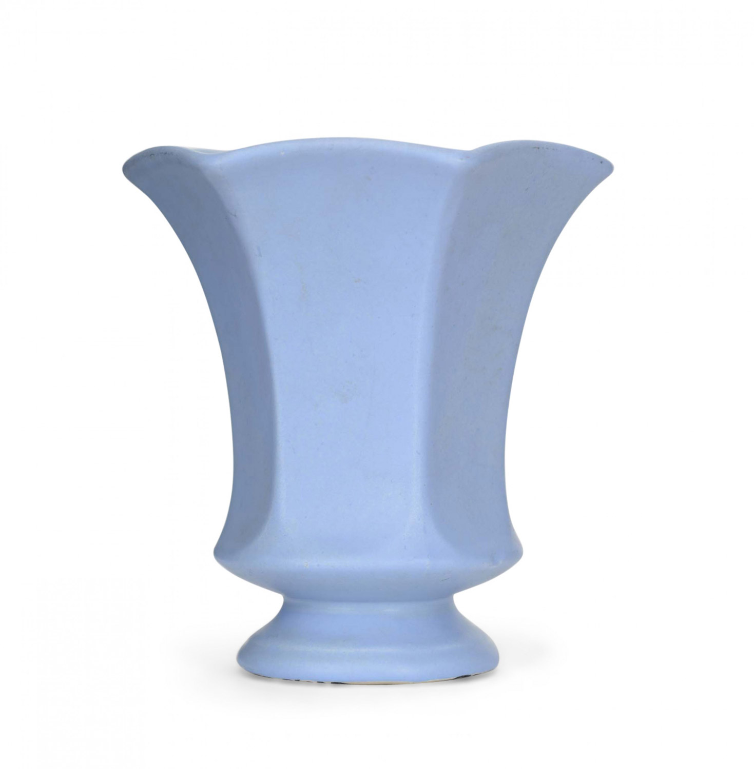 Vintage flared, faceted hexagonal lavender-color glazed ceramic vase with a round foot