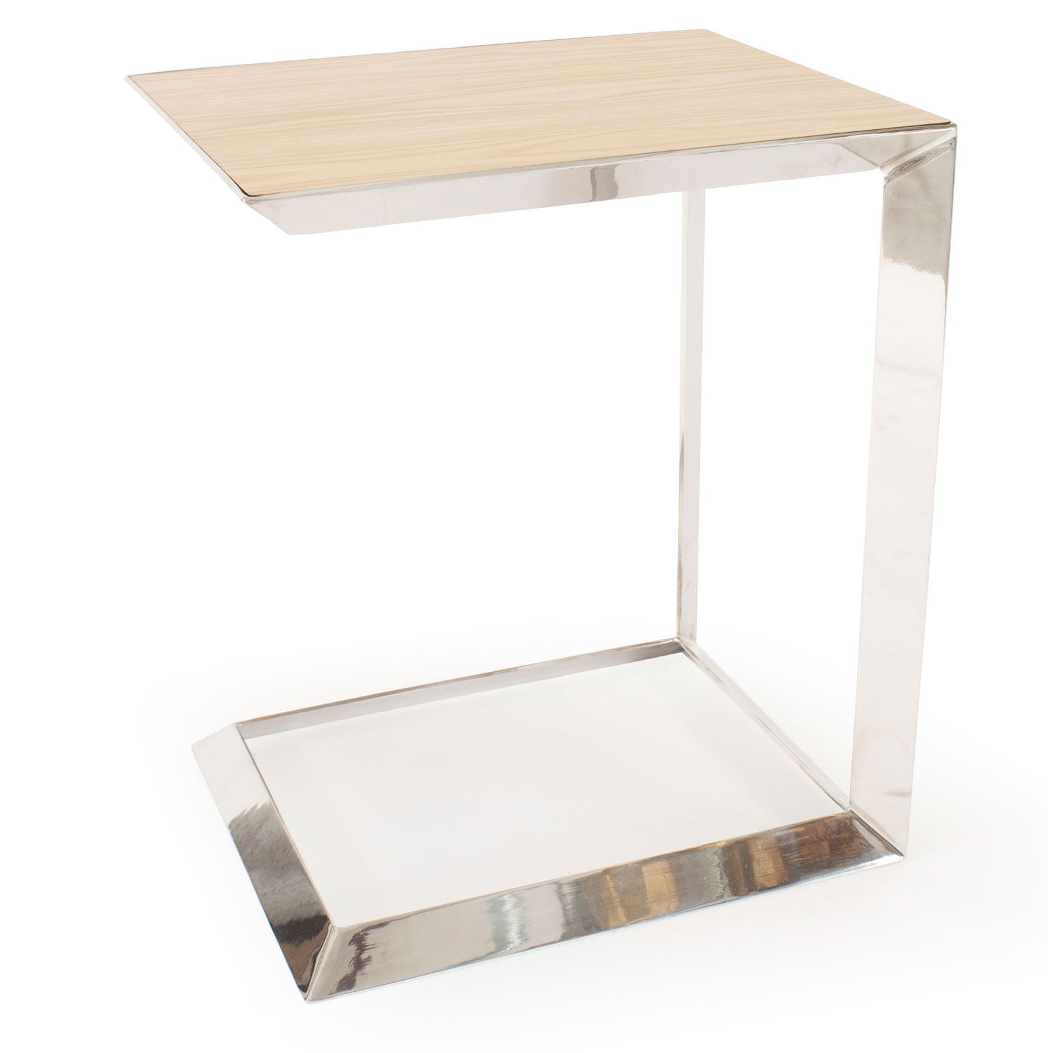 Contemporary light wood and silver metal rectangular side table with one open side and a geometric base