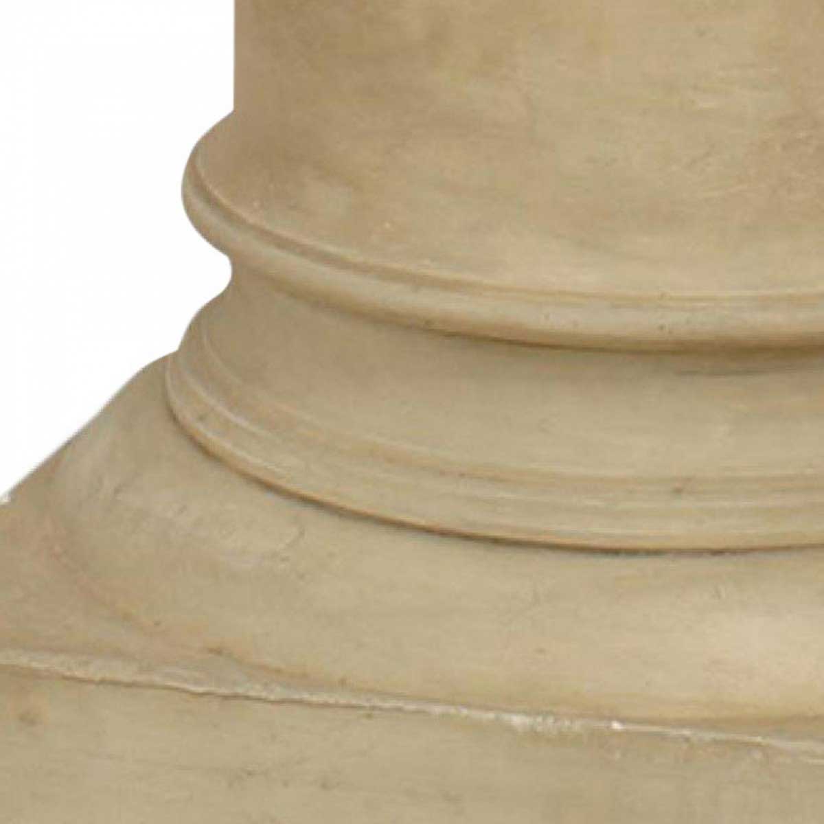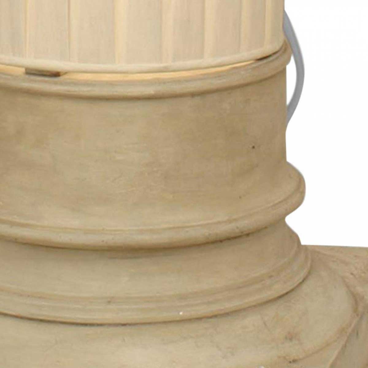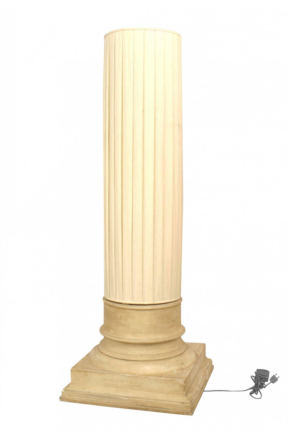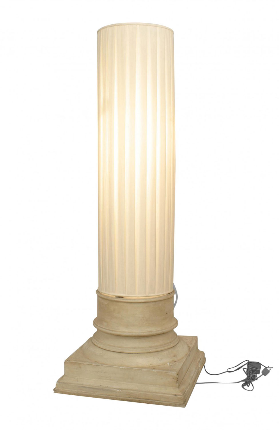 Italian 1960s floor lamp with an off-white square plaster column base supporting a large cylindrical fabric shade.