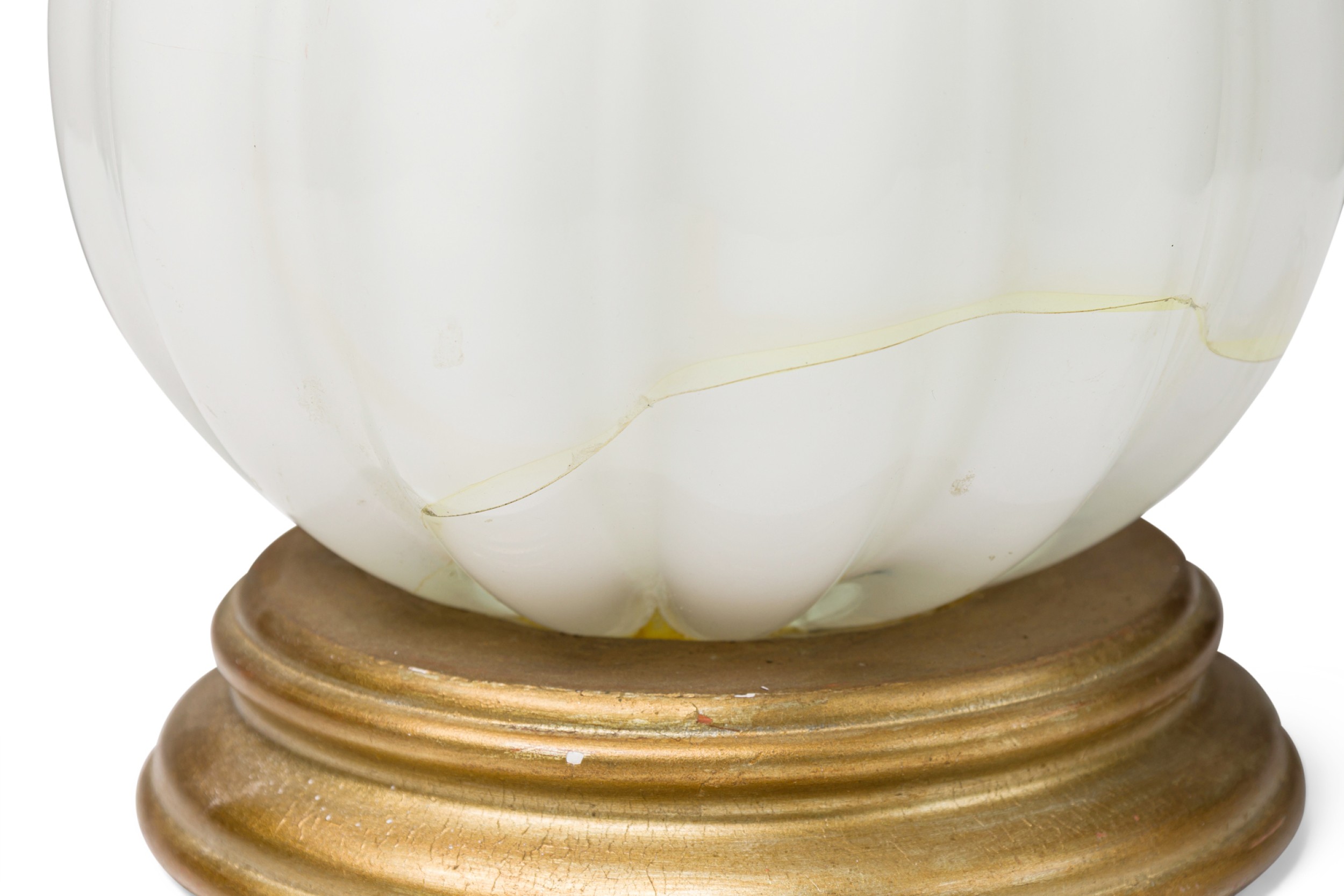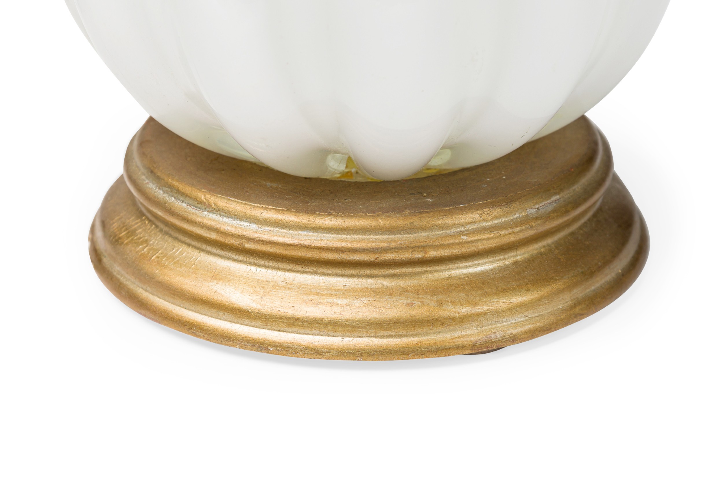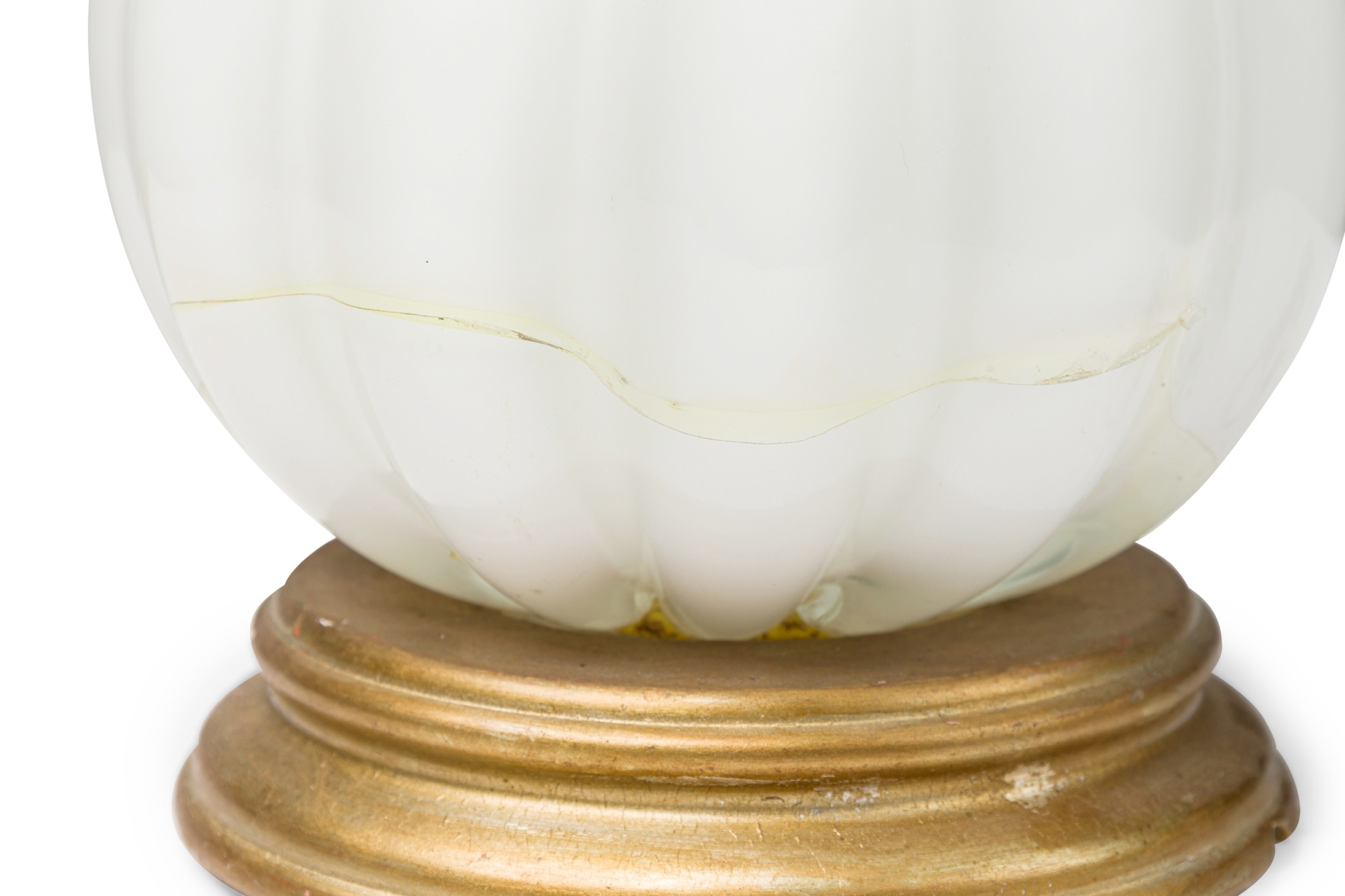 Italian Murano white "INCAMICIATO" glass table lamp with 3 fluted design sections separated by gold dusted glass rings resting on a round wood base (AS IS-bottom section with a crack)