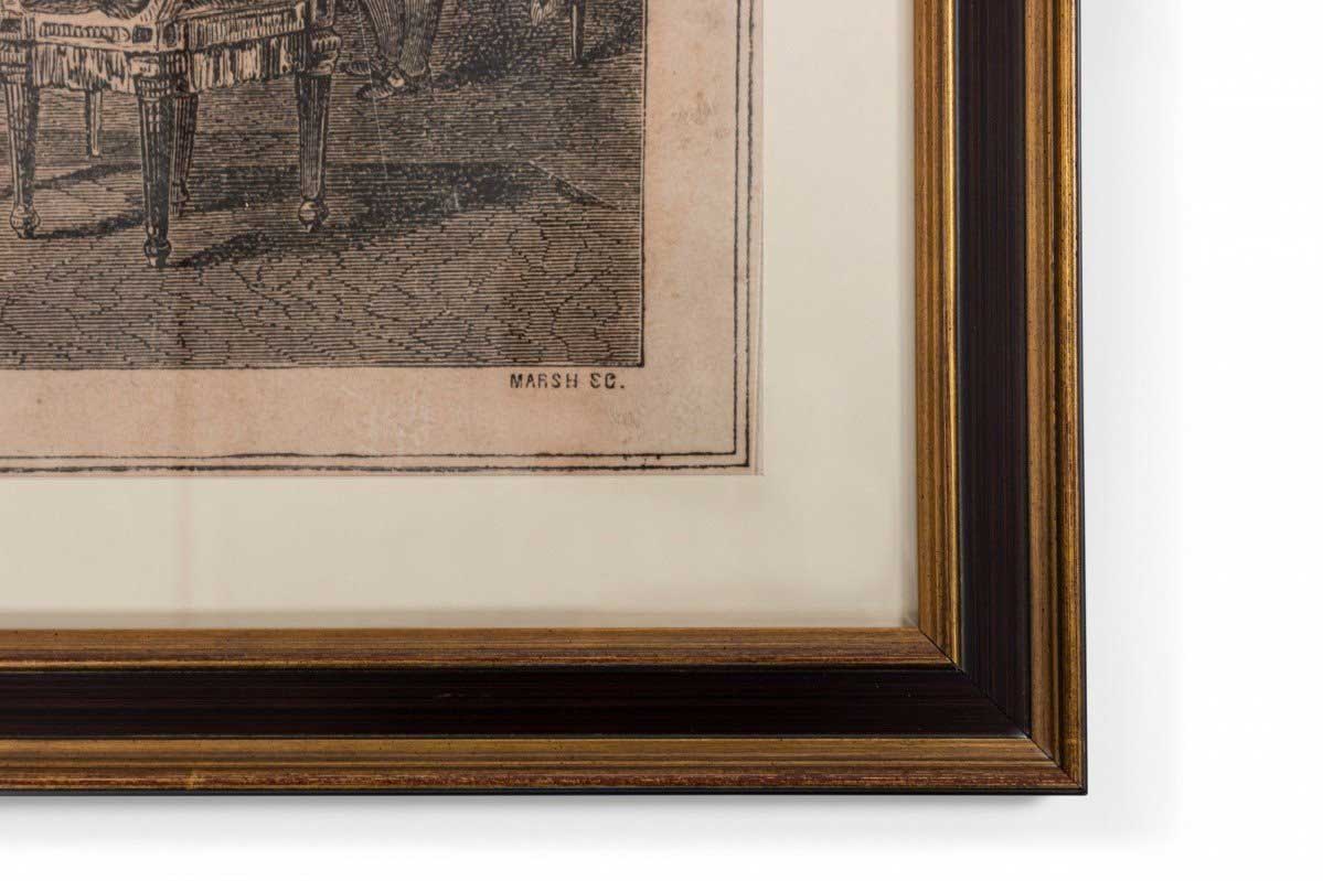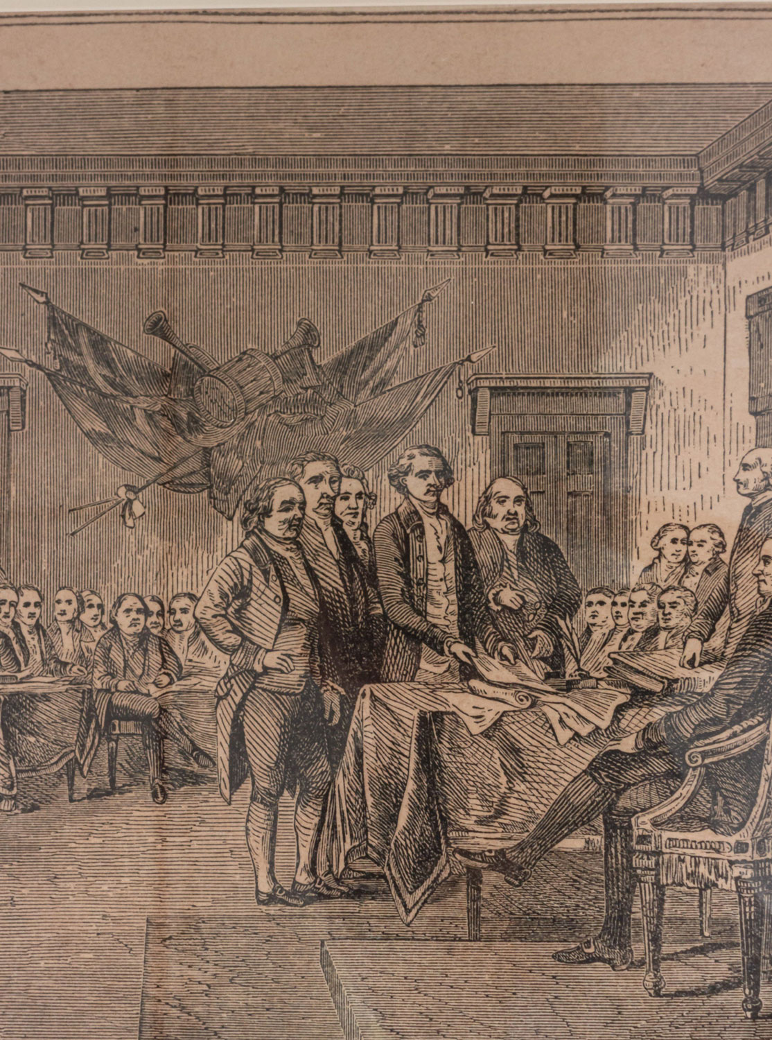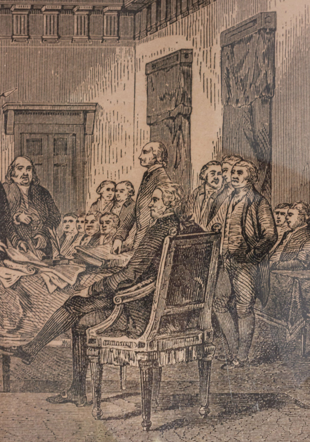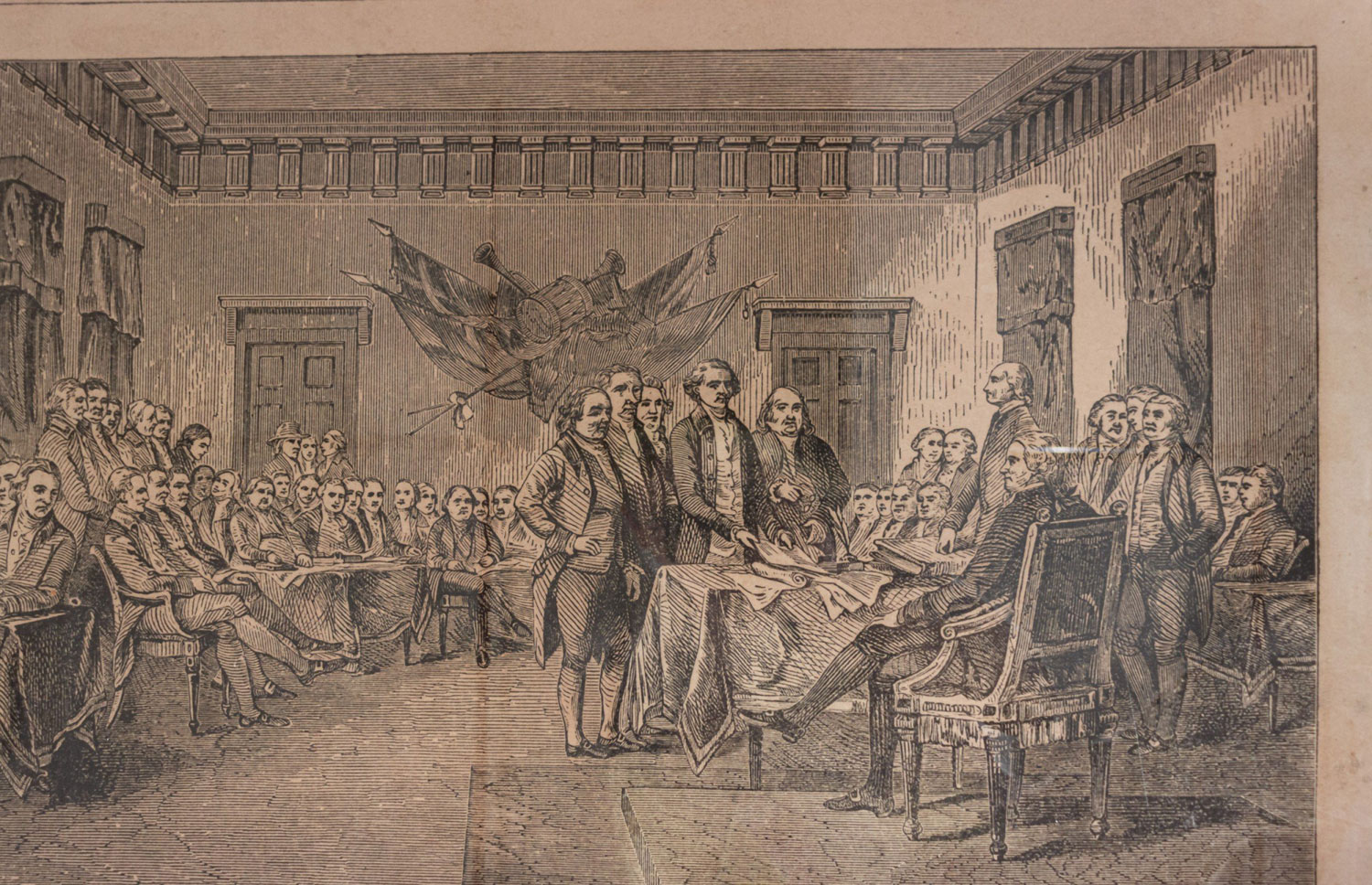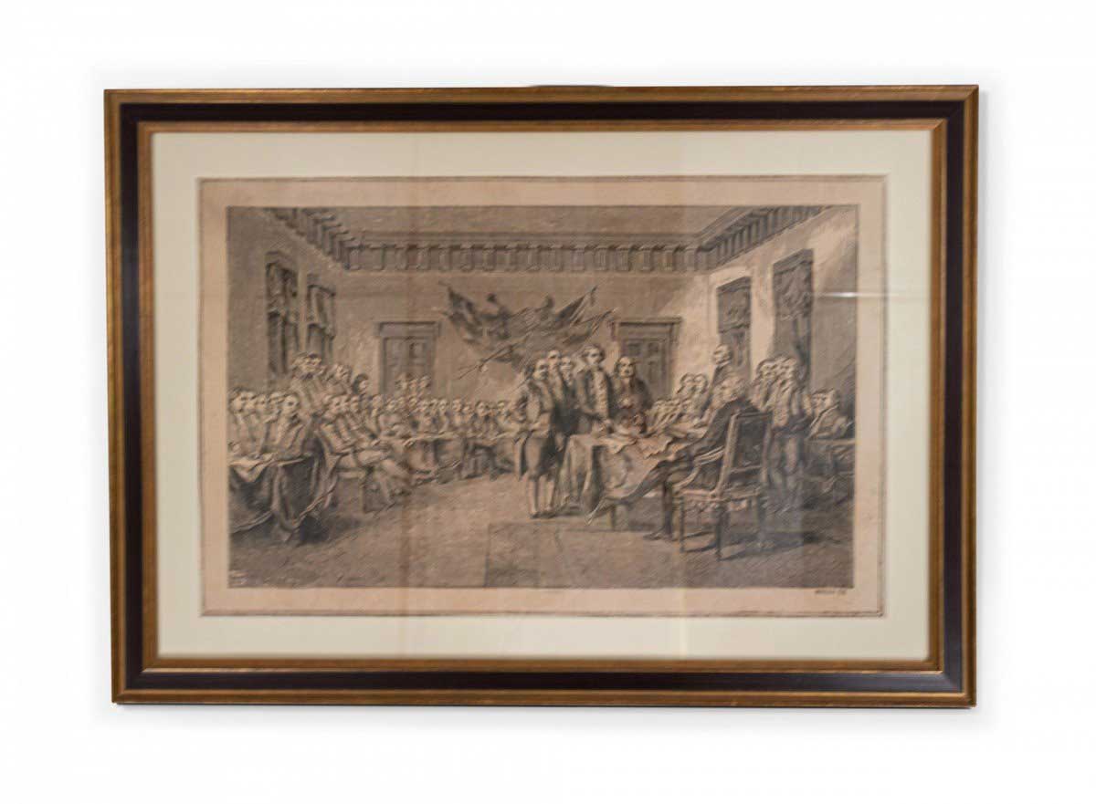 American (19th Century) copy of a black lithograph on beige paper depicting the founding fathers signing the Declaration of Independence in a black and gold frame.