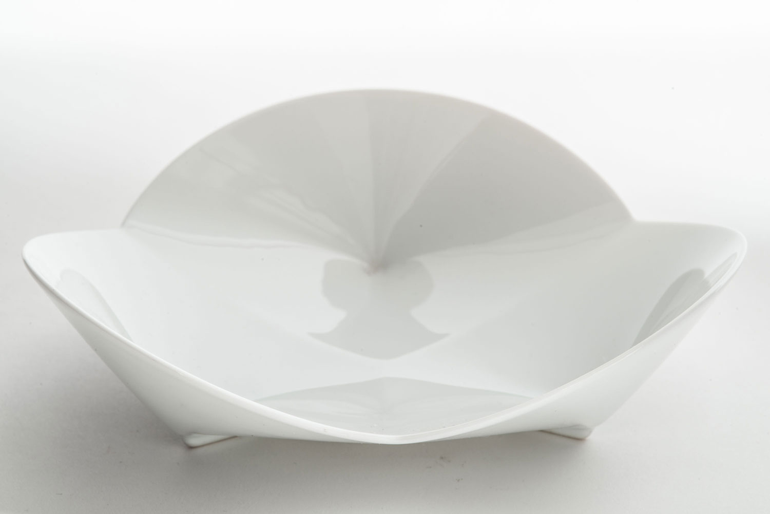 3-lobed white glazed ceramic bowl on 3 small feet with an indentation in the center of each lobe