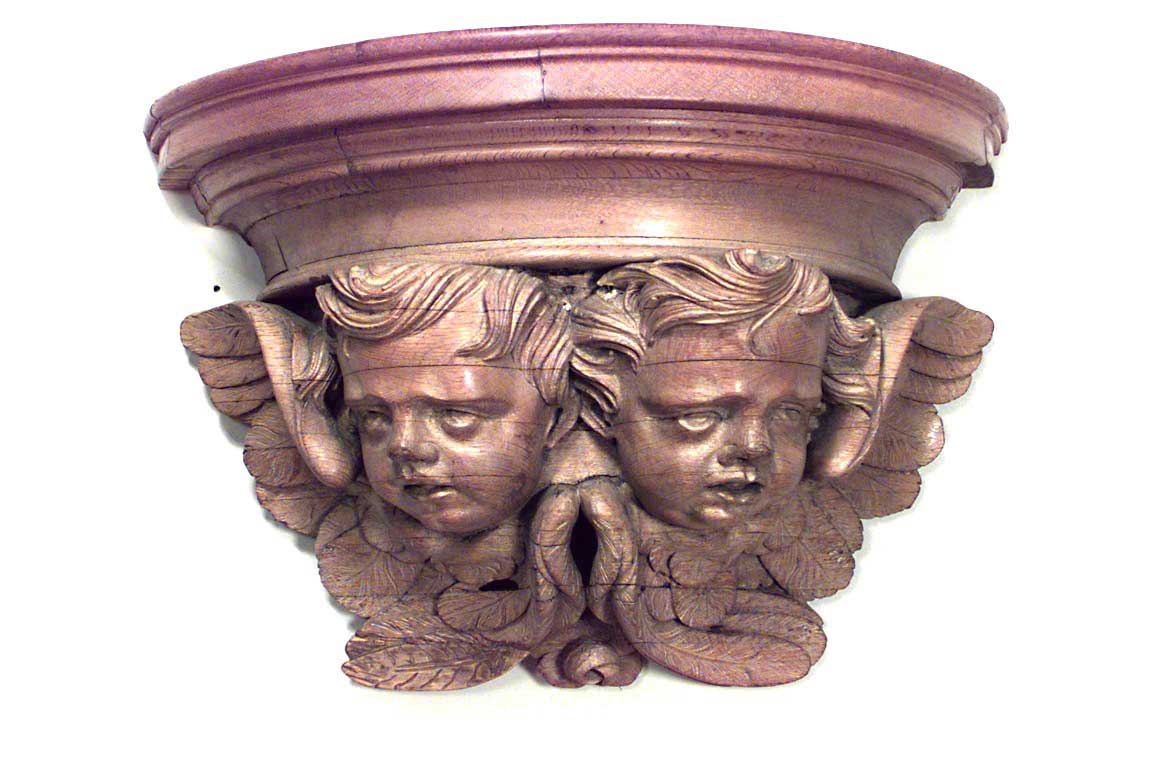 French Louis XV style (19th Cent) stripped oak half round wall shelf with 2 cupid heads with wings.
