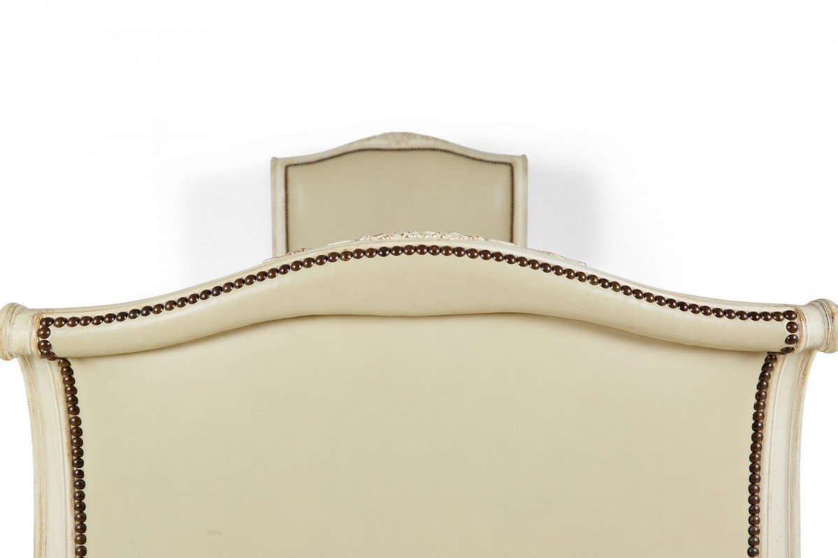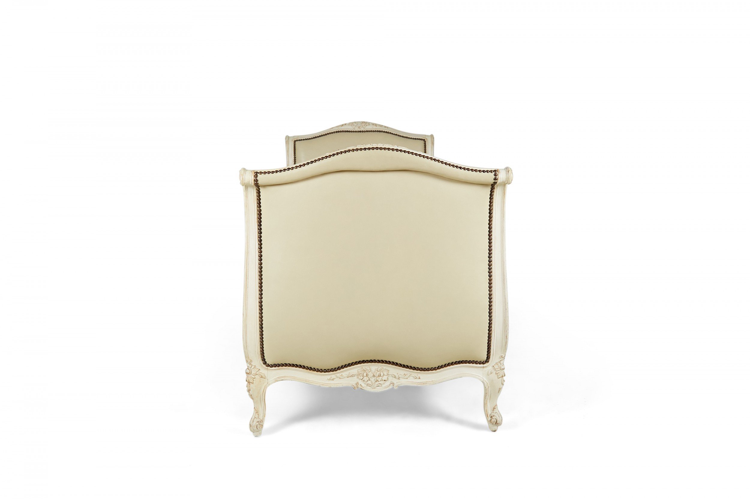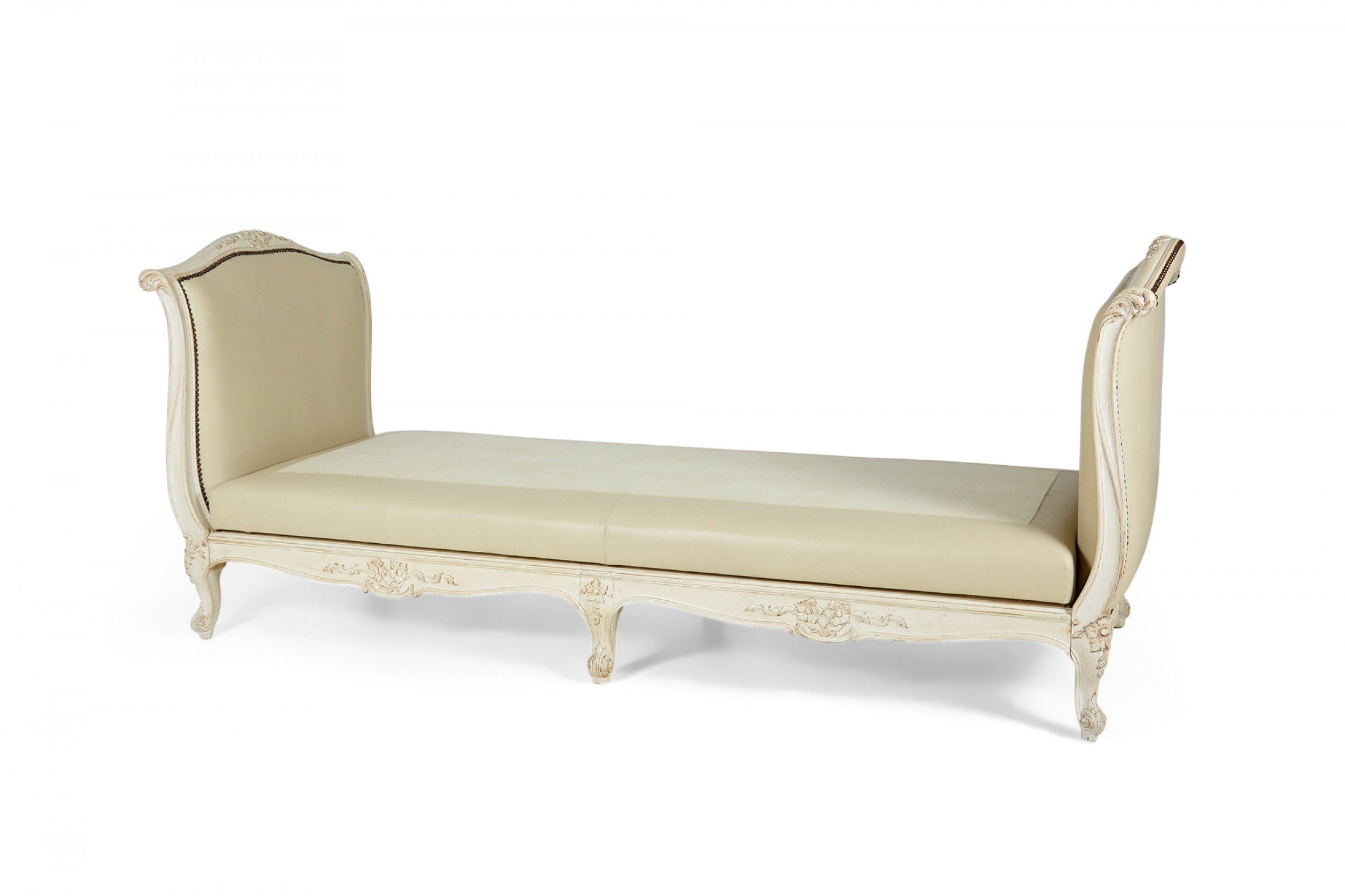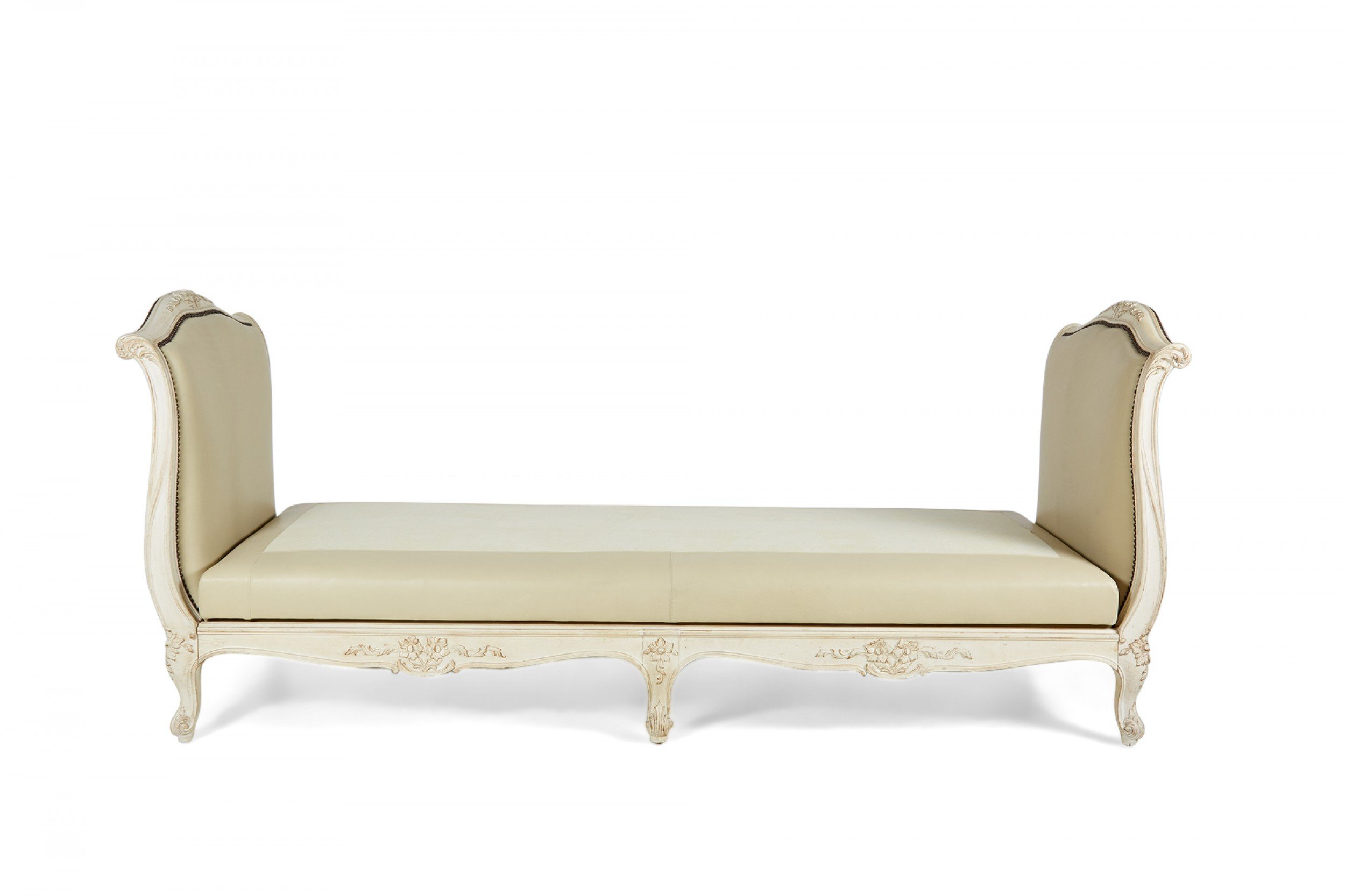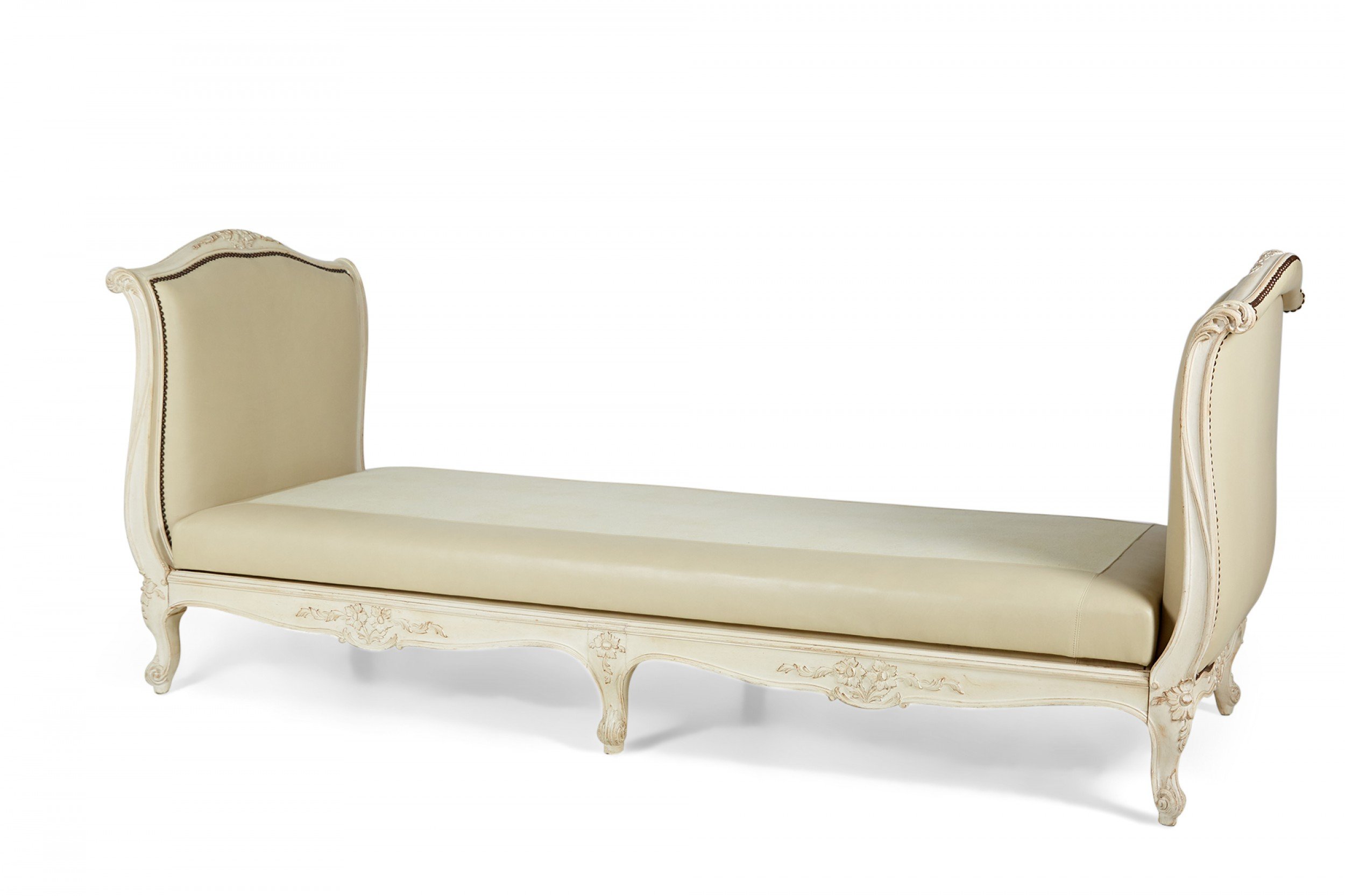 French Louis XV-style daybed with white distressed painted finish having carved embellishments, and beige leather upholstered headboard, footboard, and base adorned with decorative furniture tacks. (Does not include seat cushion)