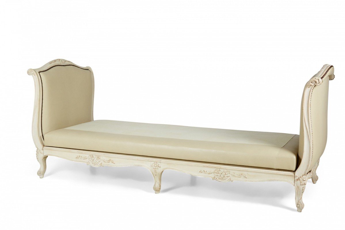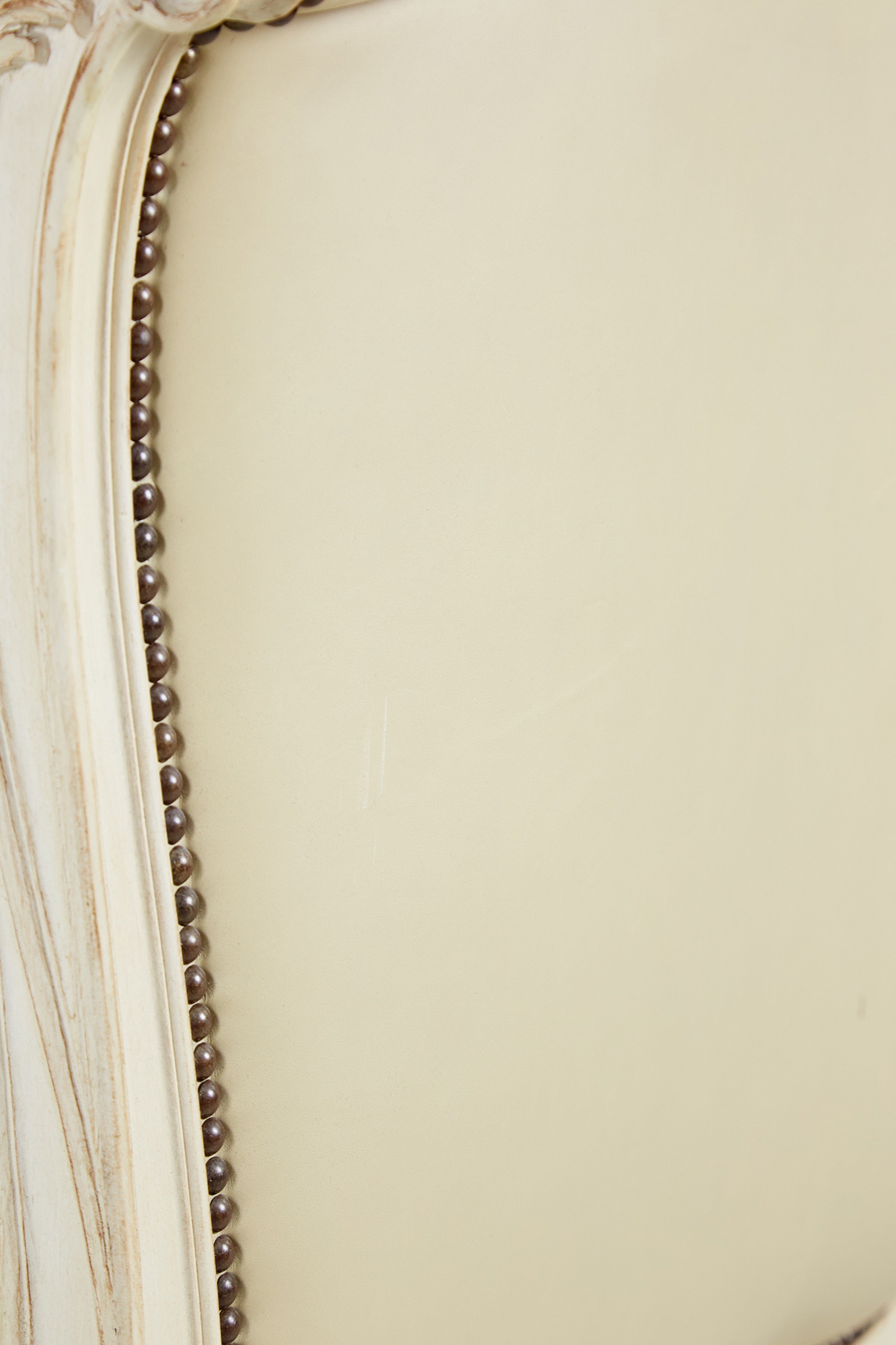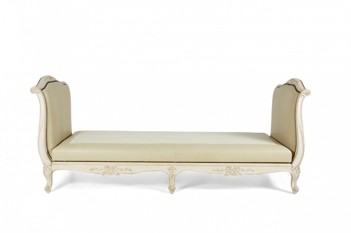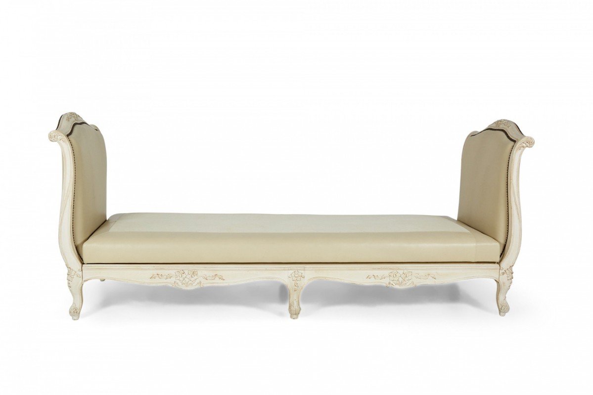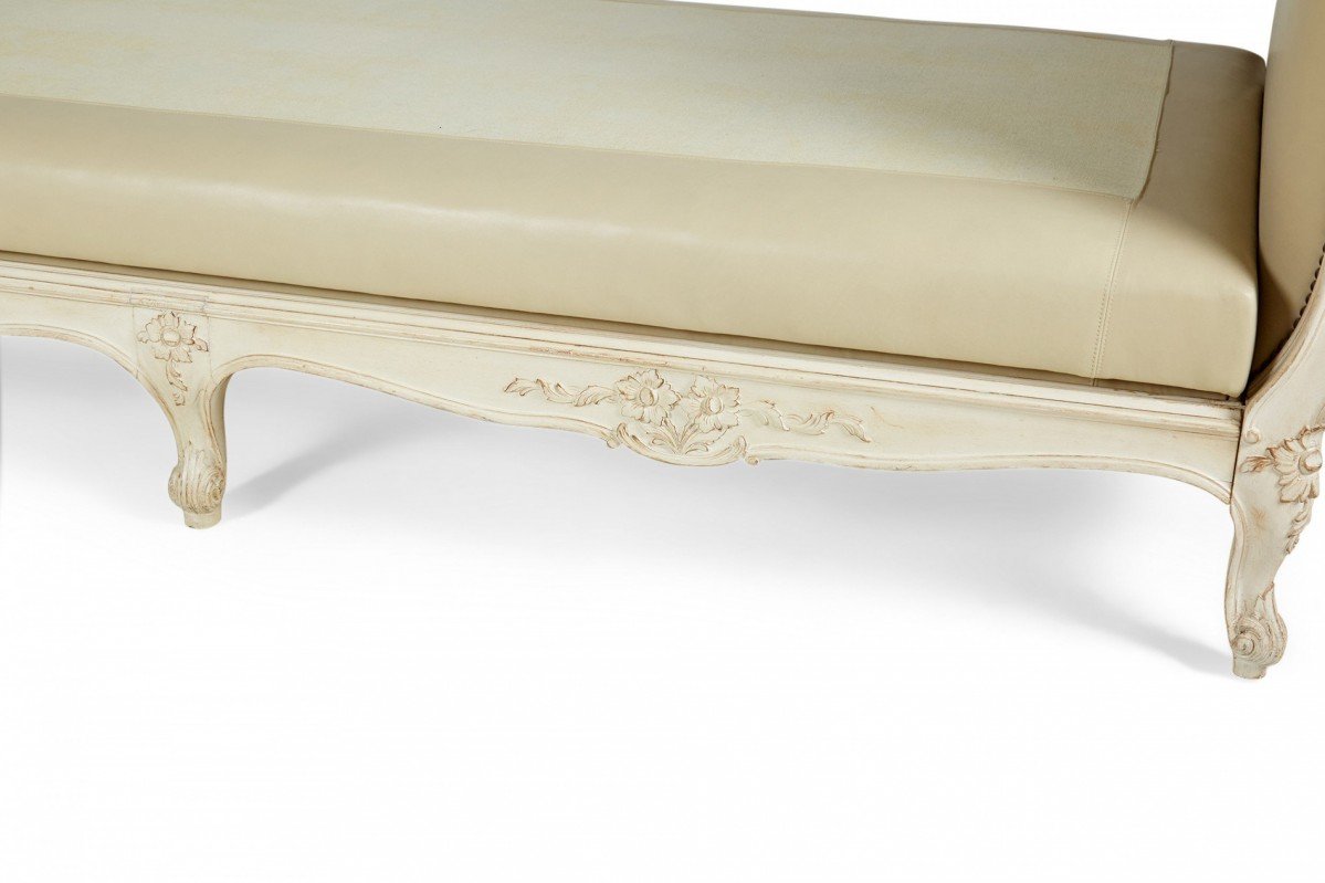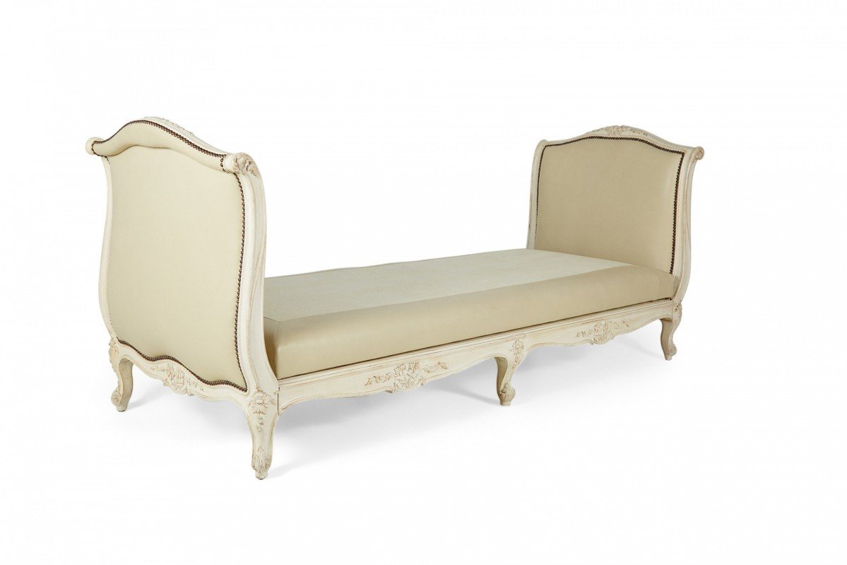 French Louis XV-style daybed with white distressed painted finish having carved embellishments, and beige leather upholstered headboard, footboard, and base adorned with decorative furniture tacks. (Does not include seat cushion)