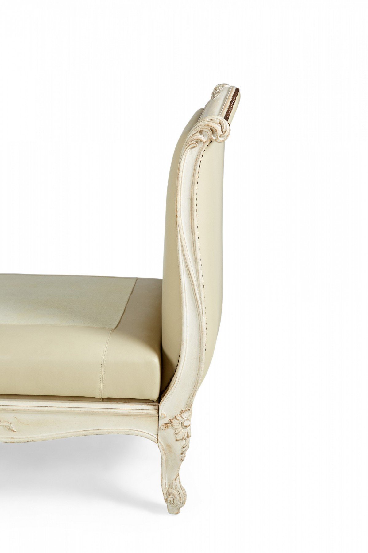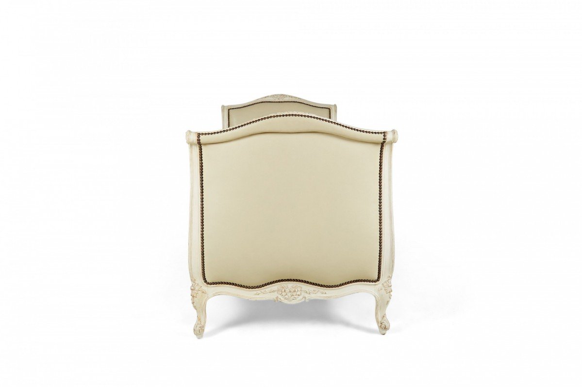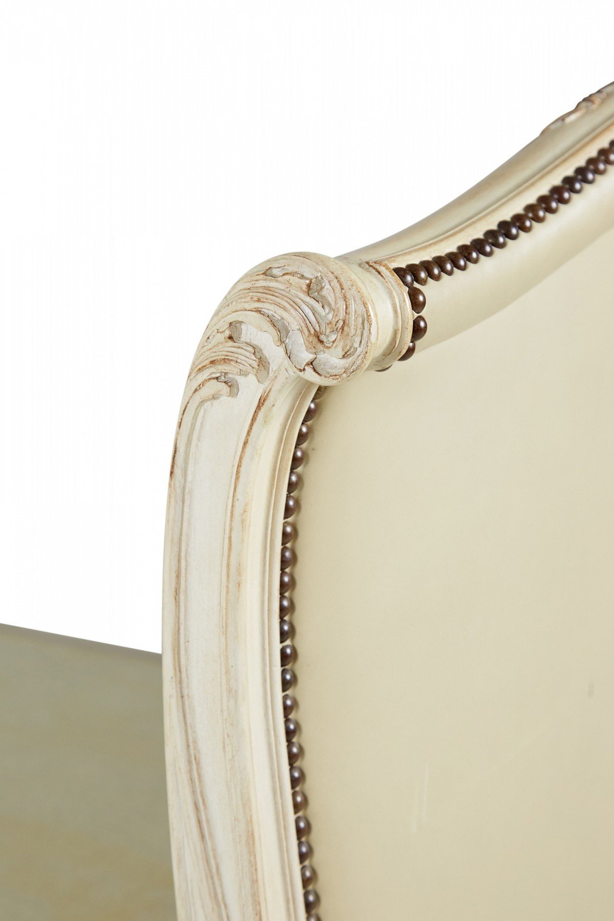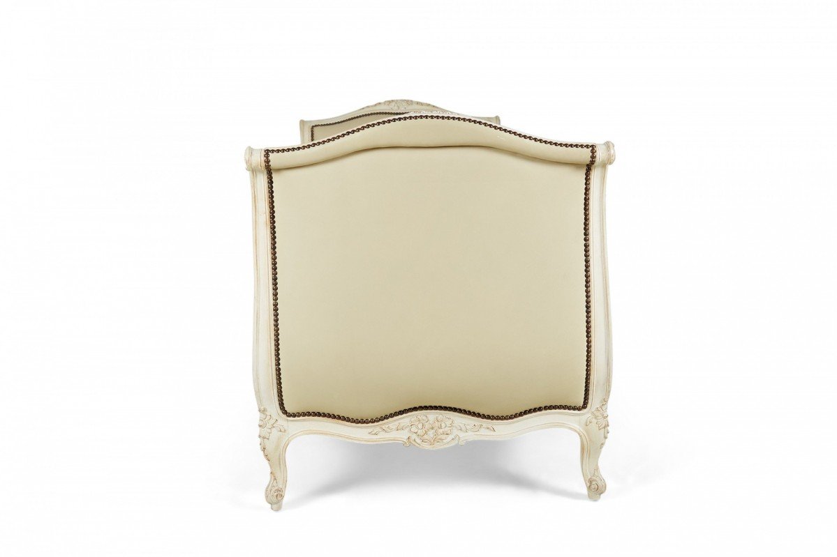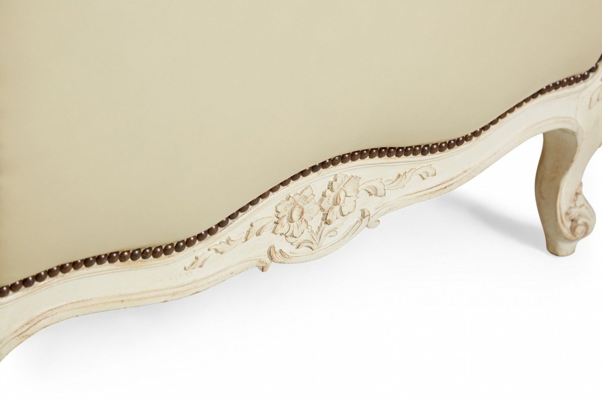 French Louis XV-style daybed with white distressed painted finish having carved embellishments, and beige leather upholstered headboard, footboard, and base adorned with decorative furniture tacks. (Does not include seat cushion)