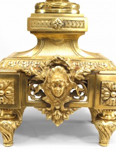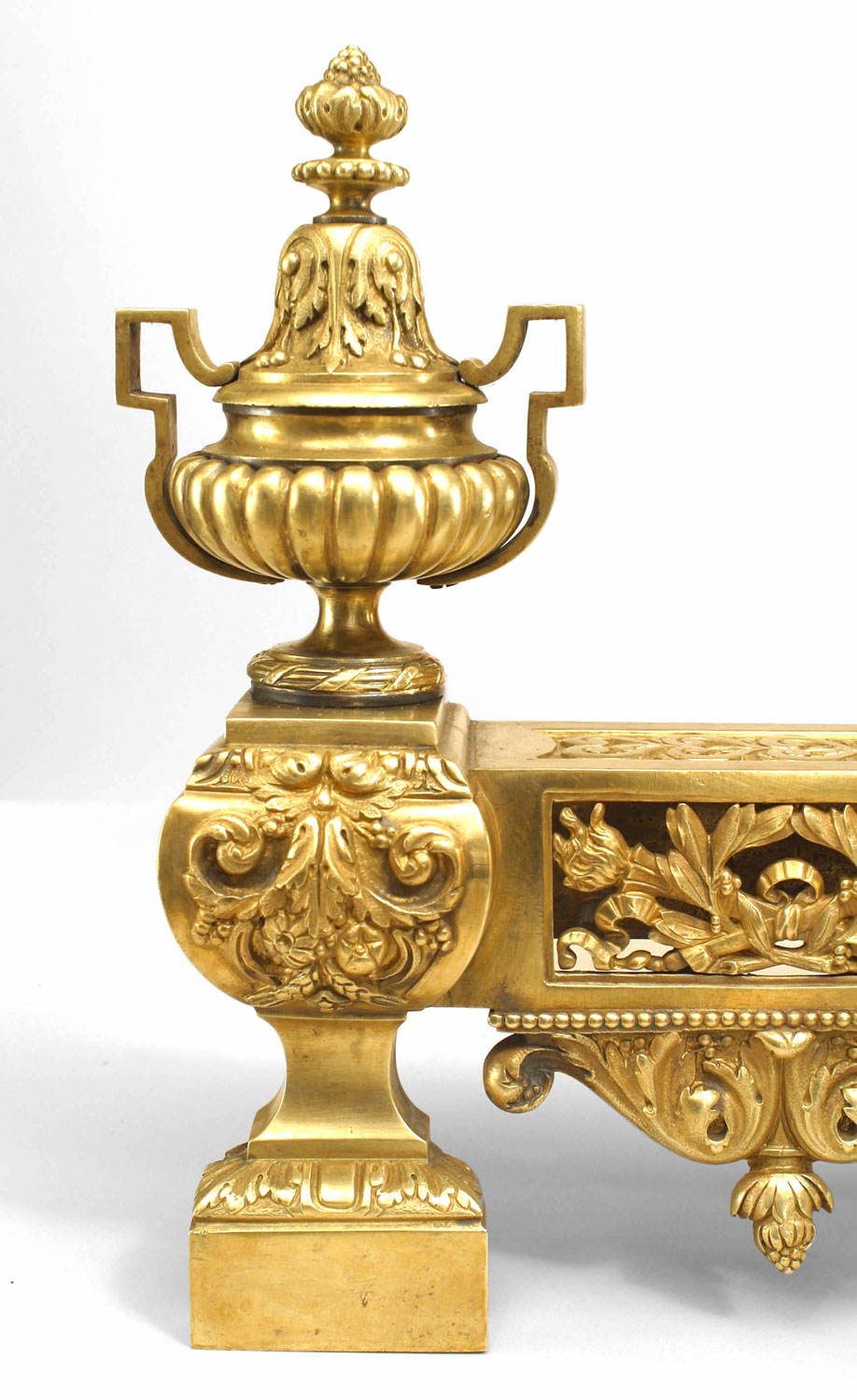 PAIR of French Louis XVI-style (19th Century) bronze dore double urn and festoon andirons with female head and filigree design. (PRICED AS PAIR)