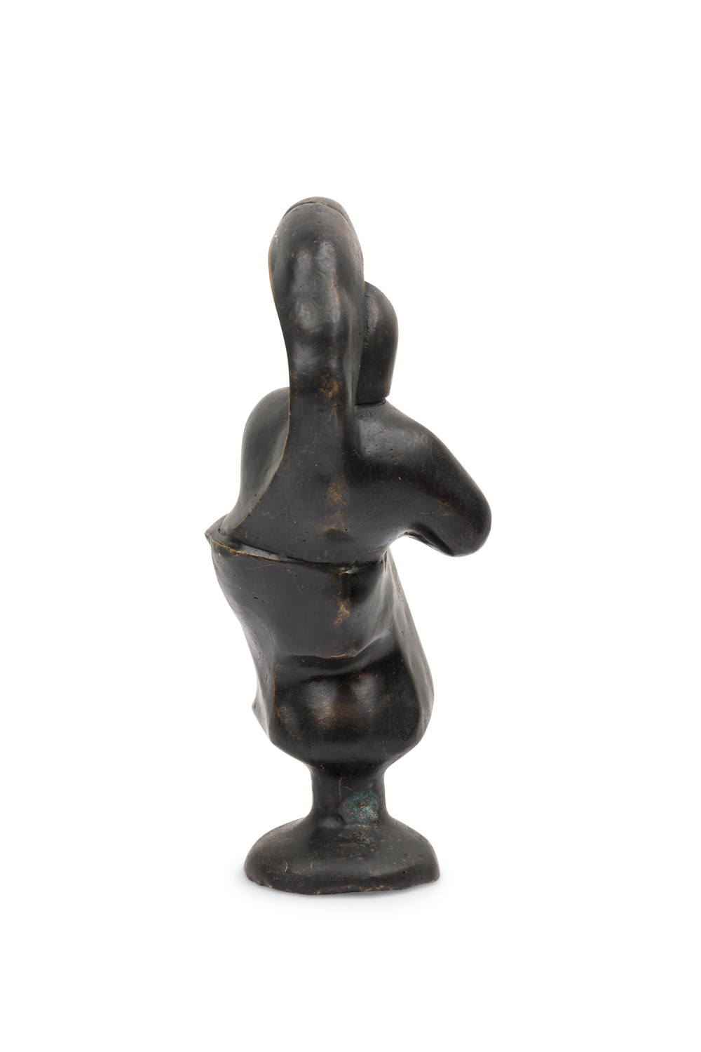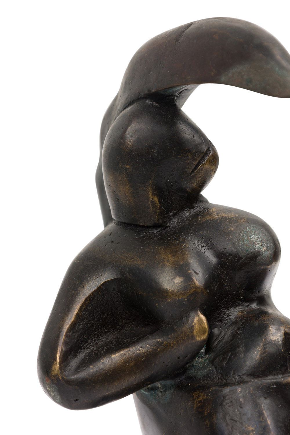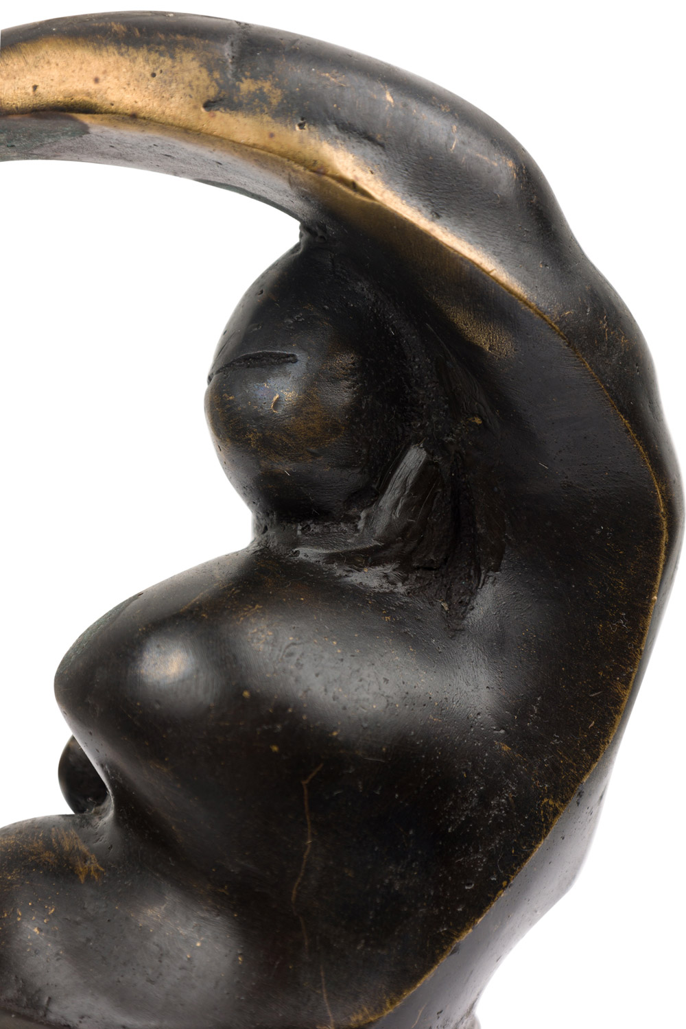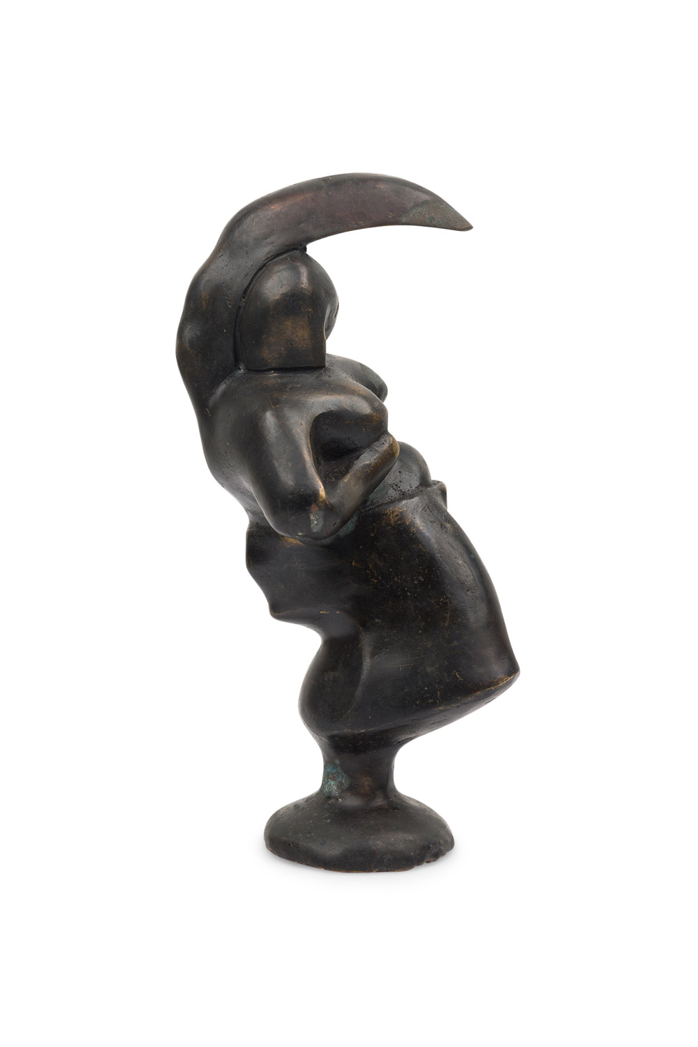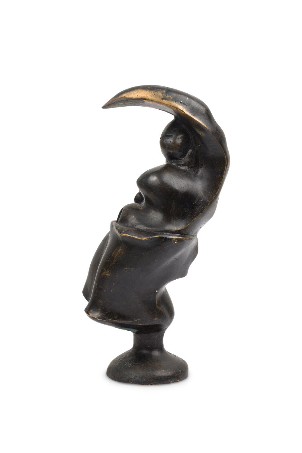 Contemporary hand-forged bronze Brutalist-inspired figural sculpture depicting a female carved into a crescent moon shape finished in an ebonized patina. (PRICED EACH)