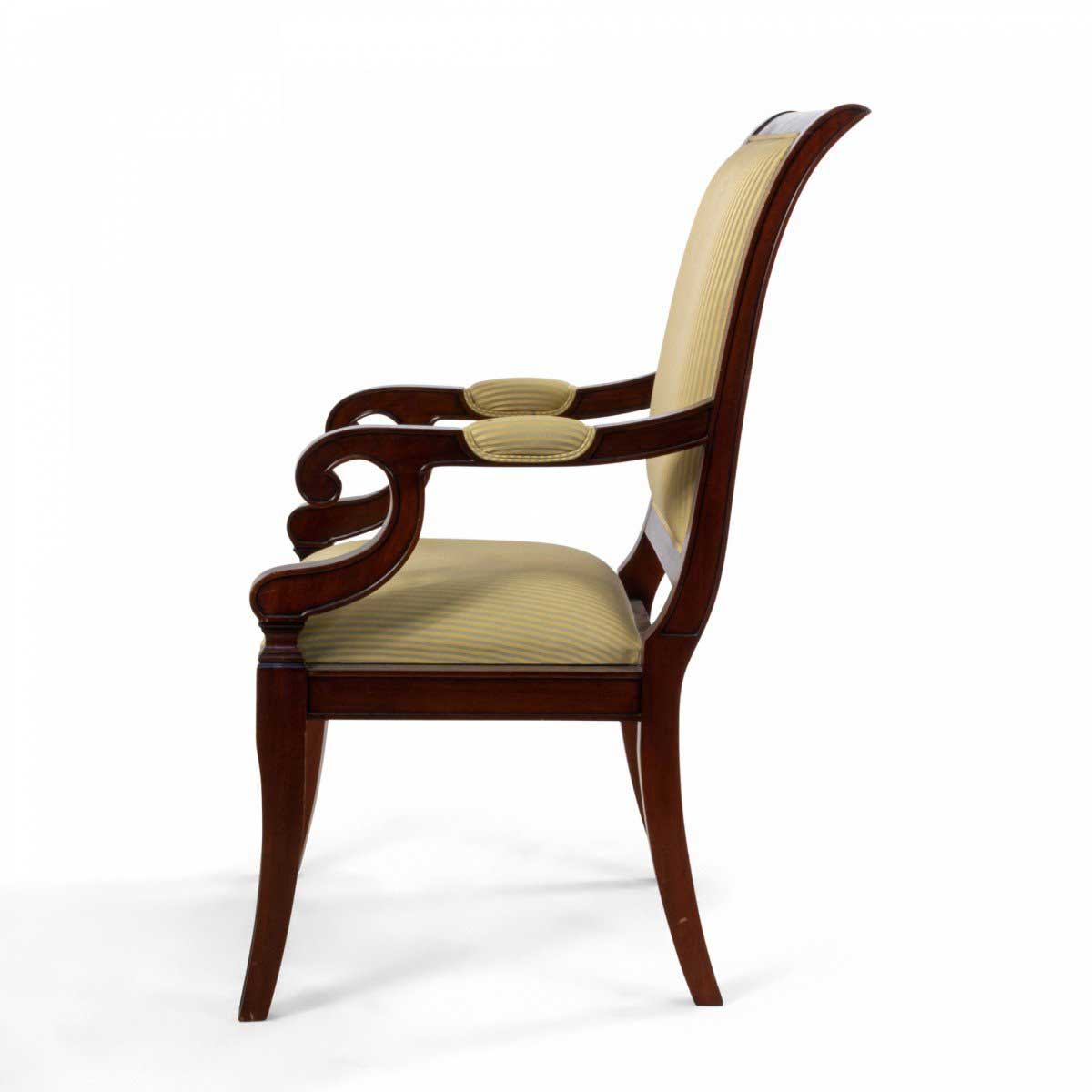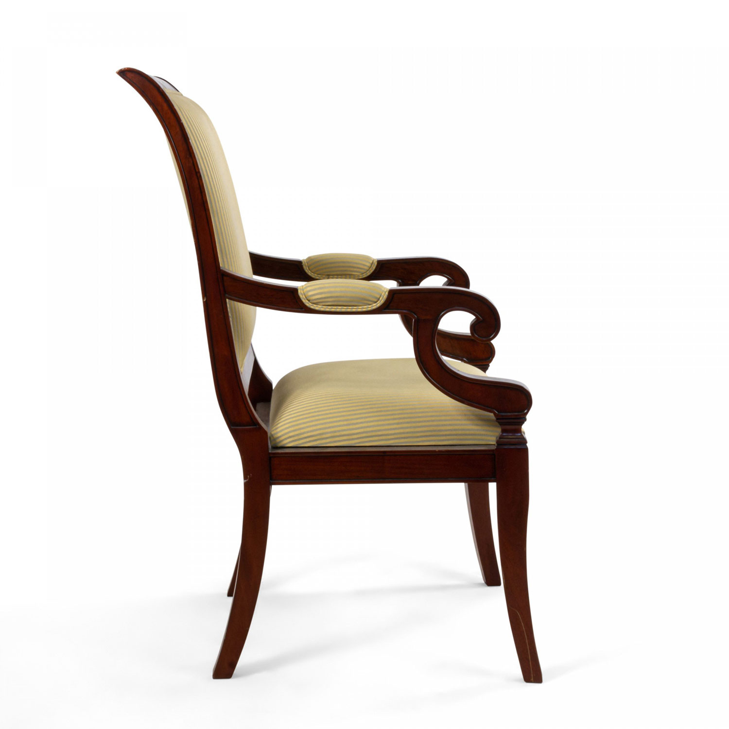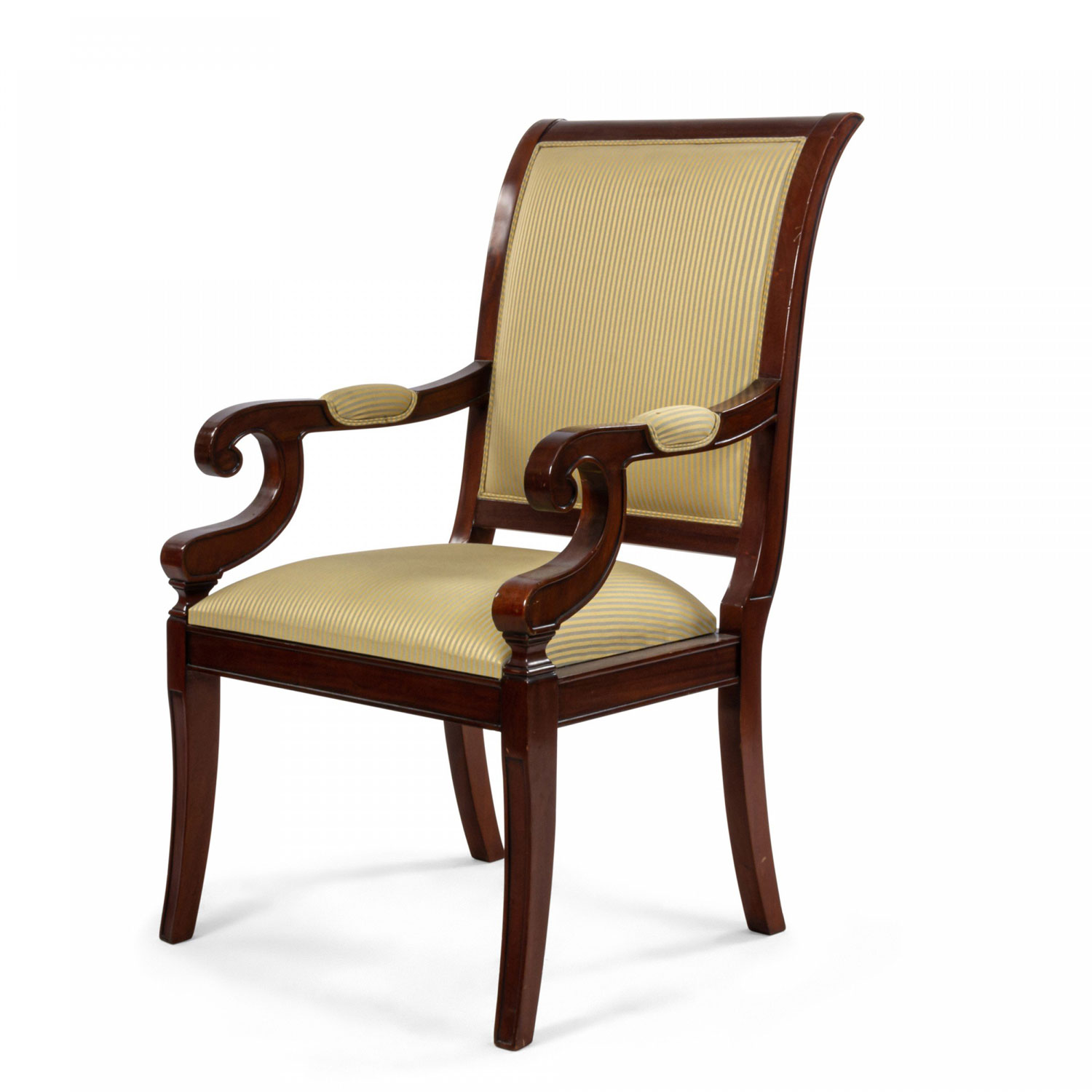 French Empire style mahogany armchair with curved back and c-scroll arms with beige striped upholstered back and seat supported on four splayed legs.