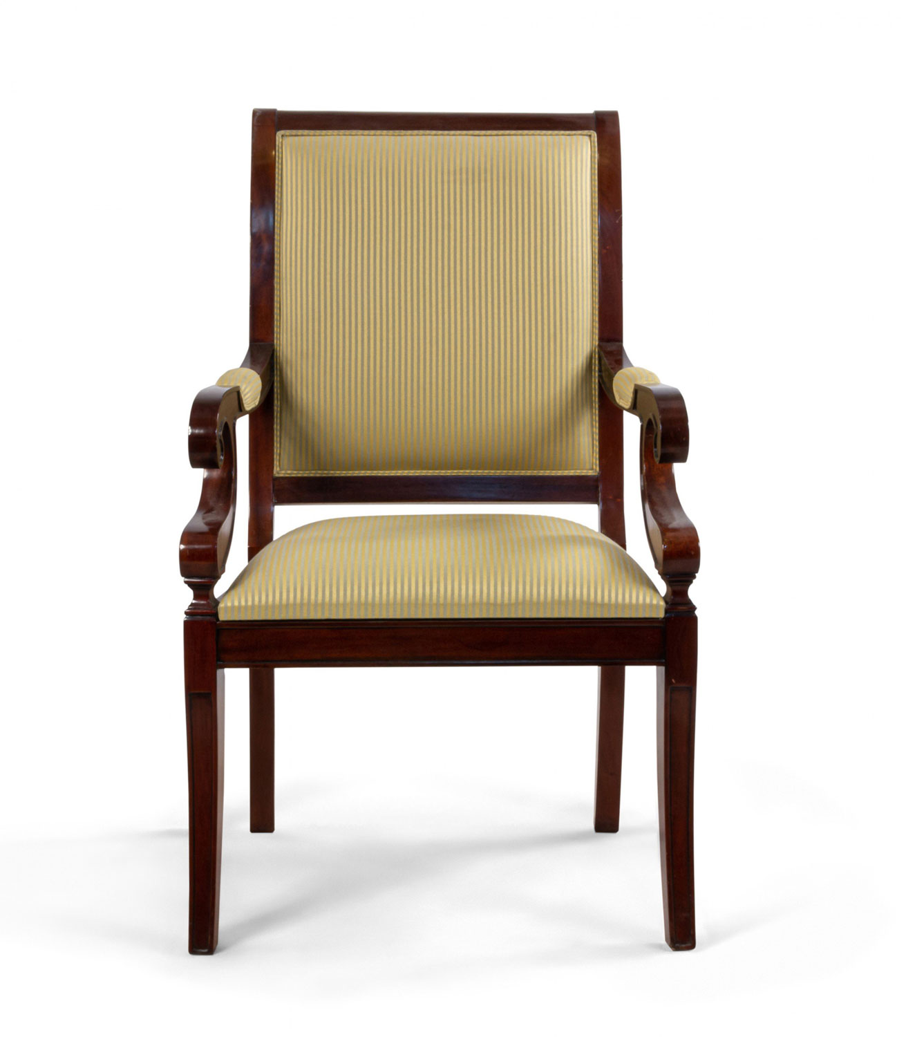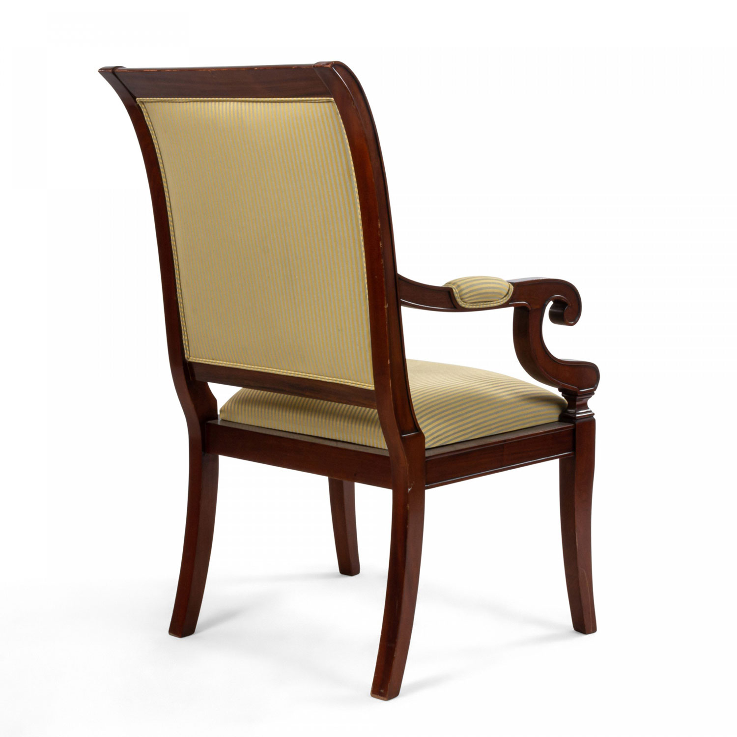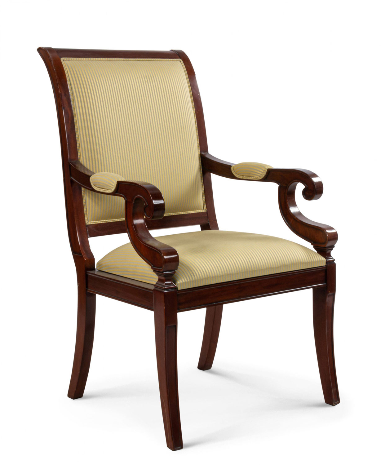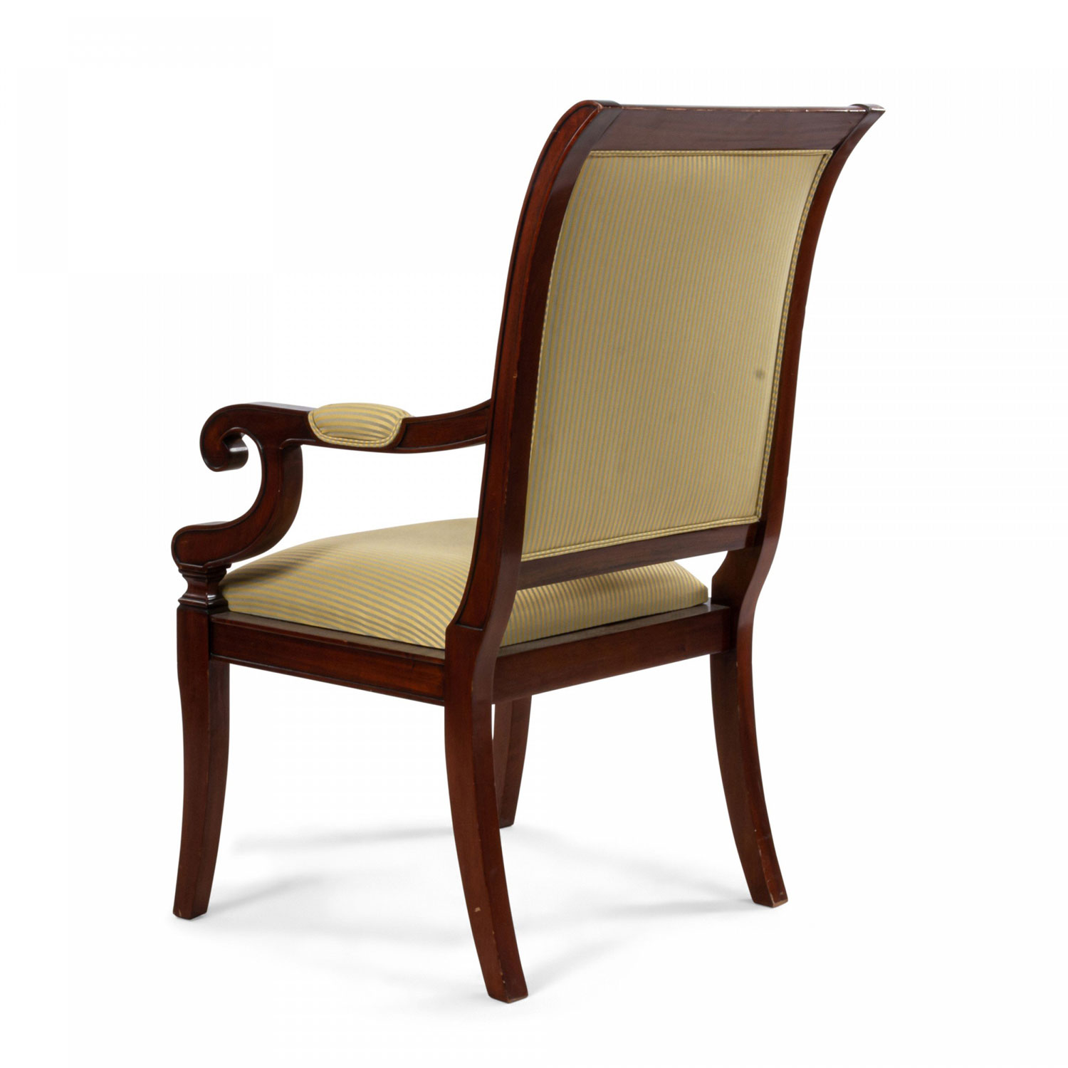 French Empire style mahogany armchair with curved back and c-scroll arms with beige striped upholstered back and seat supported on four splayed legs.