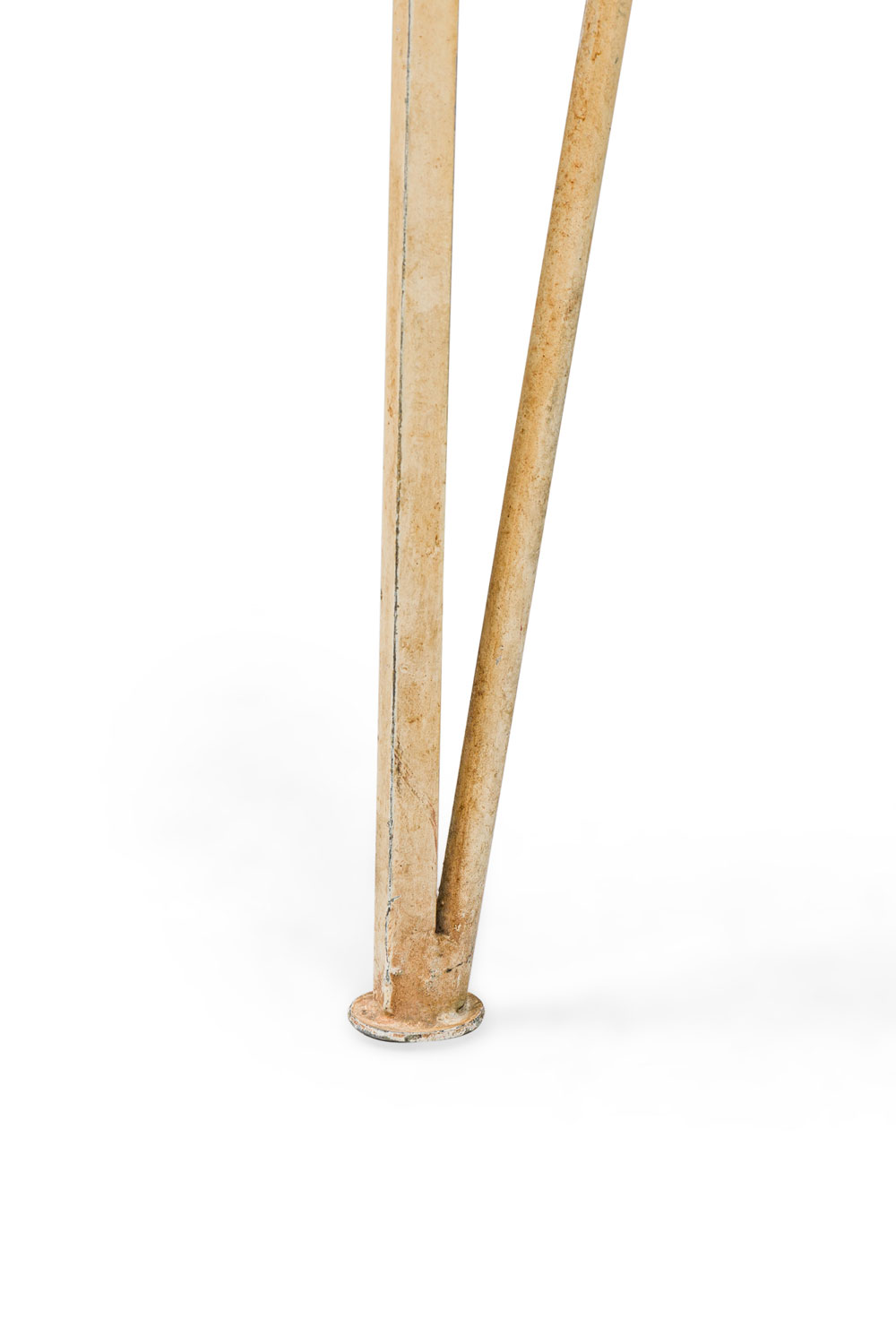 Mid-Century circular white metal "Ribbon" occasional table with glass top standing on 4 triangular legs. (Pair available in black: DUF0859)