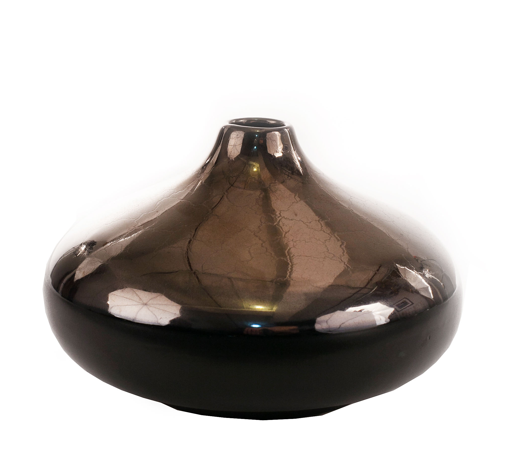 Short round ceramic vase with a narrow circular mouth, a black matte-glazed lower half, and a metallic silver crackle-glazed upper half