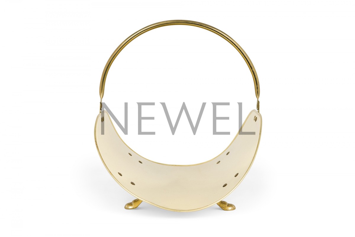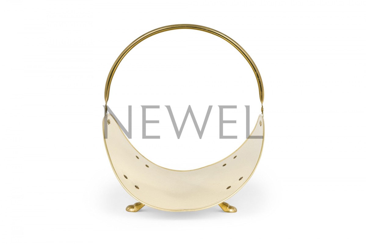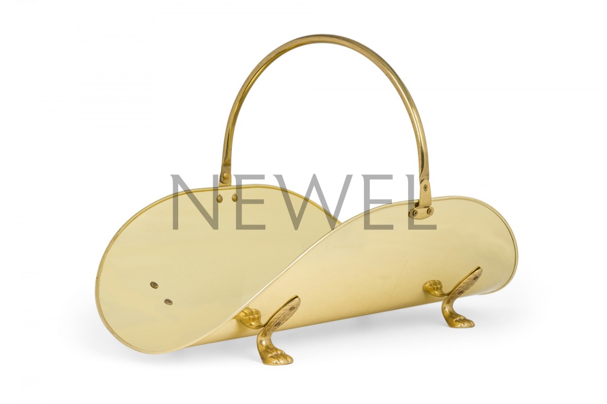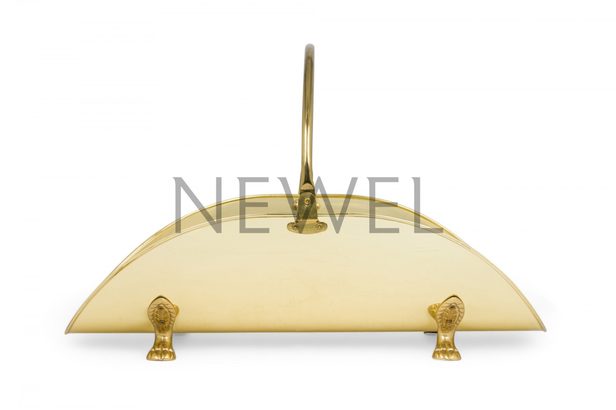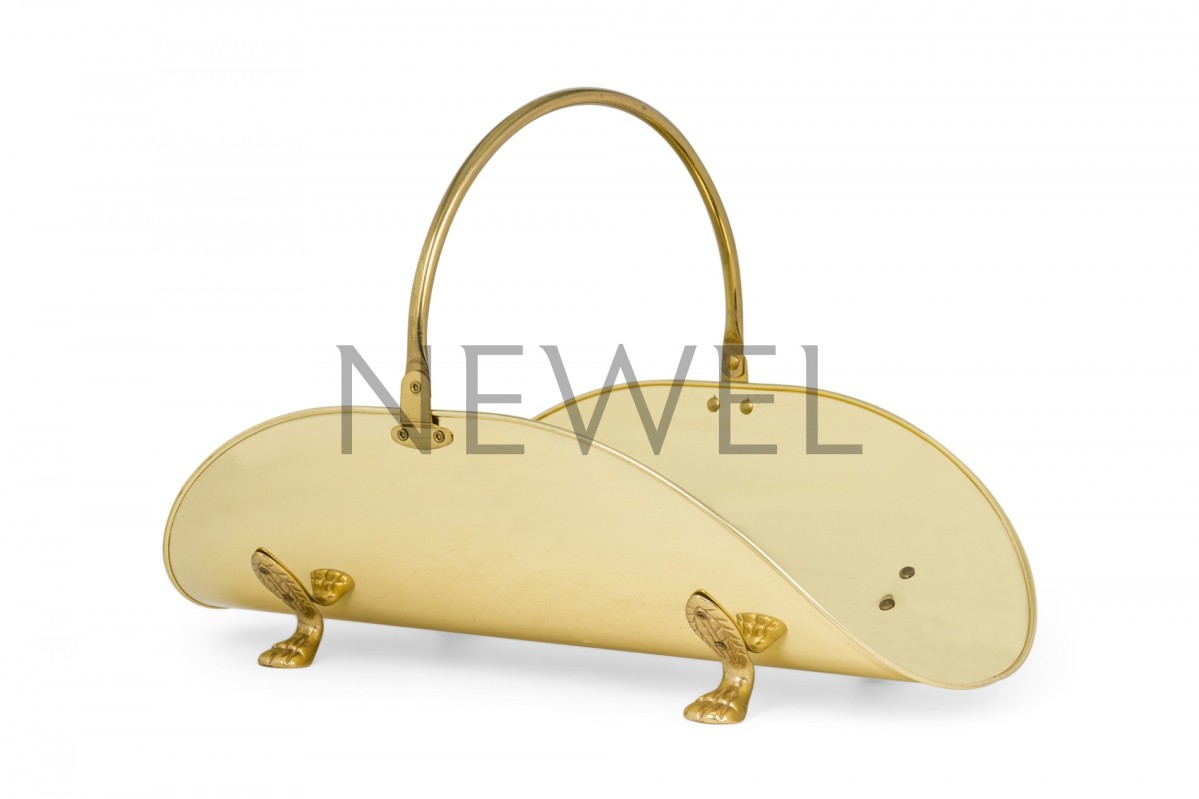 Mid-Century American brass log holder with leaf-form bun feet and handle.