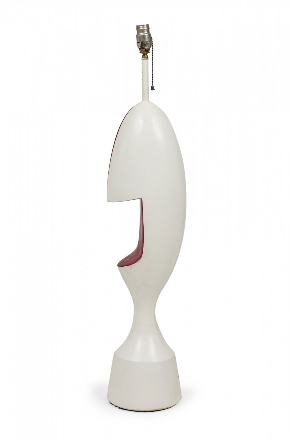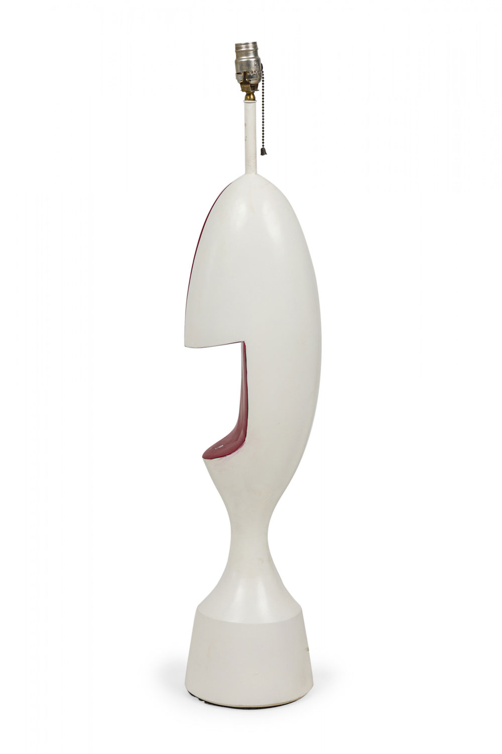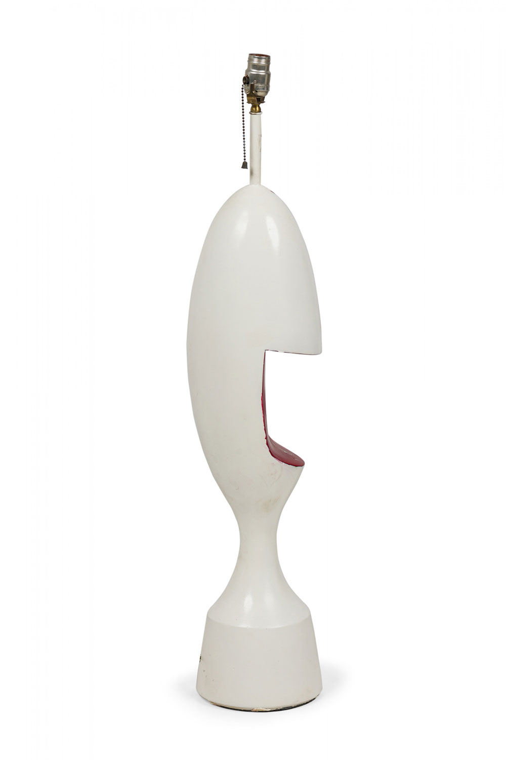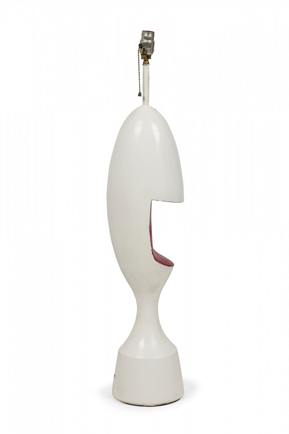 Mid-Century American red and white painted plaster "Harlequin Bishop" table lamp, sculpted in the form of a bishop chess piece featuring an elongated oval body which splits in half vertically at the upper section with functioning light switch socket, ending in a concave tapered cylindrical base. (Similar piece: DUL0017)