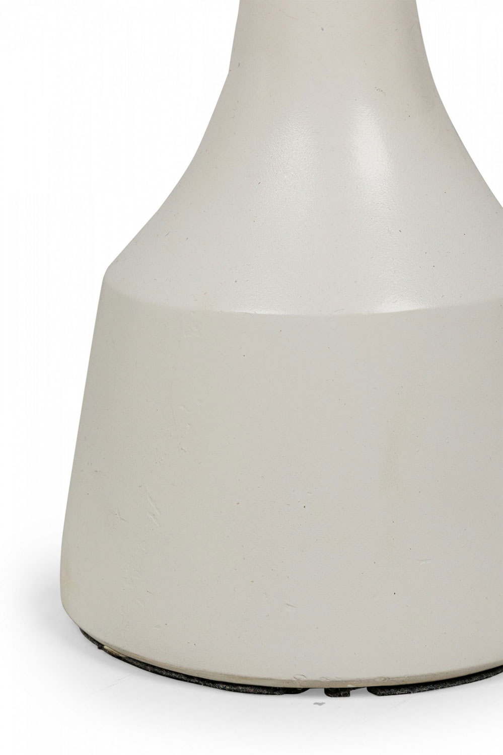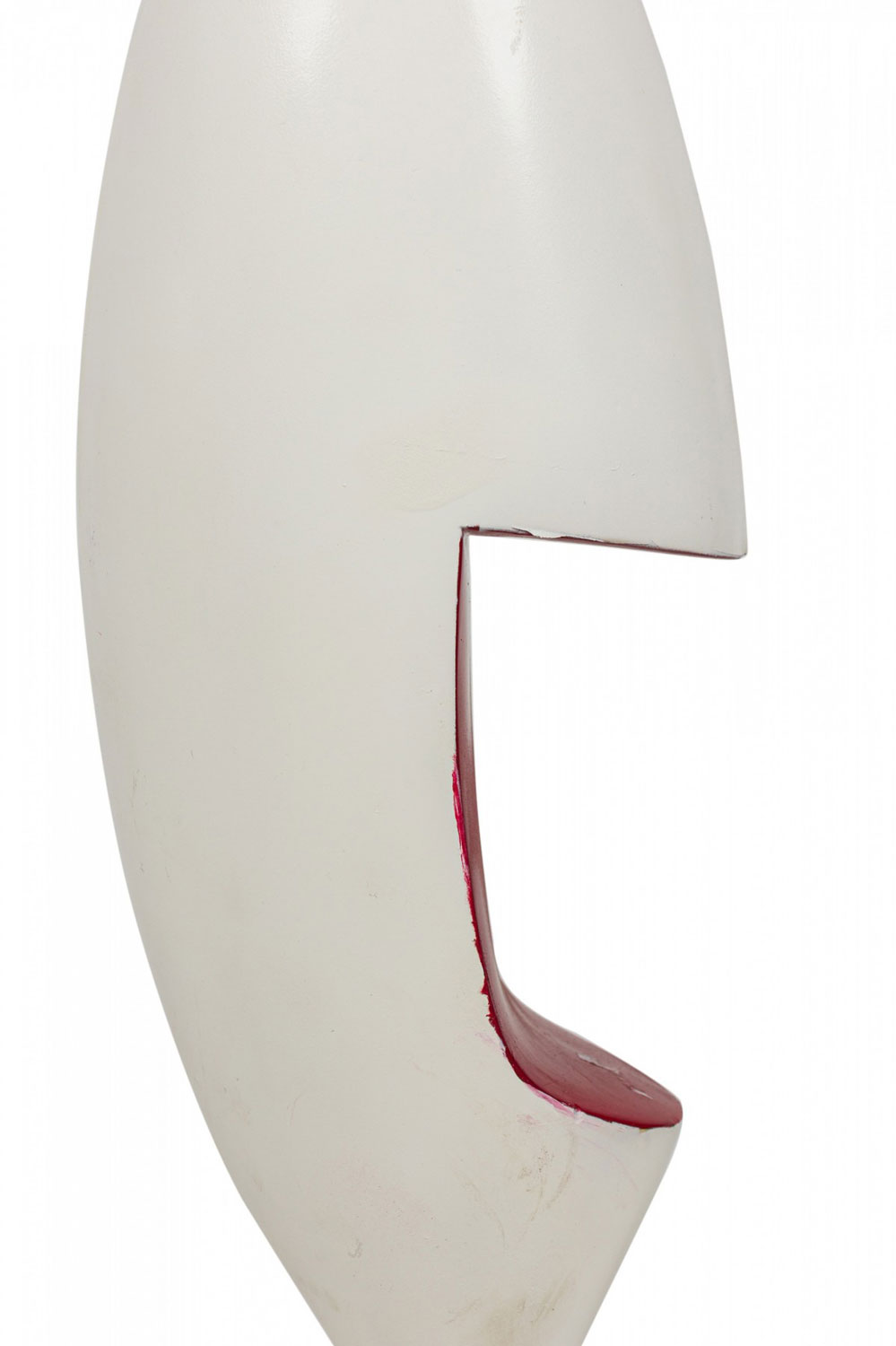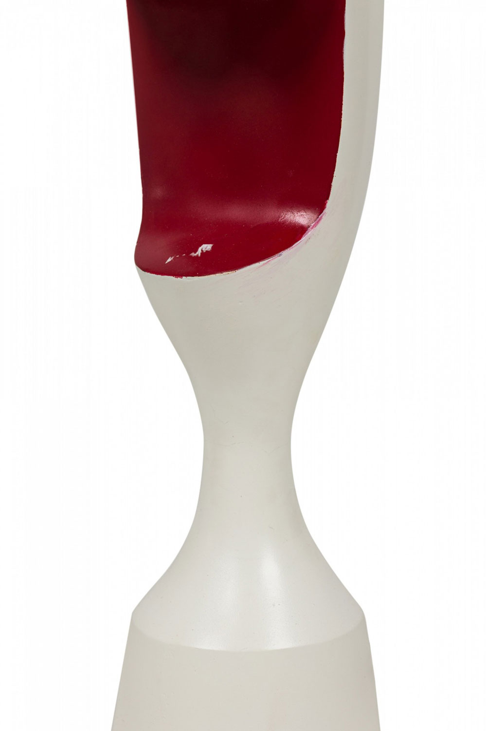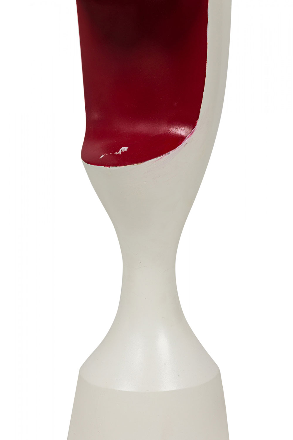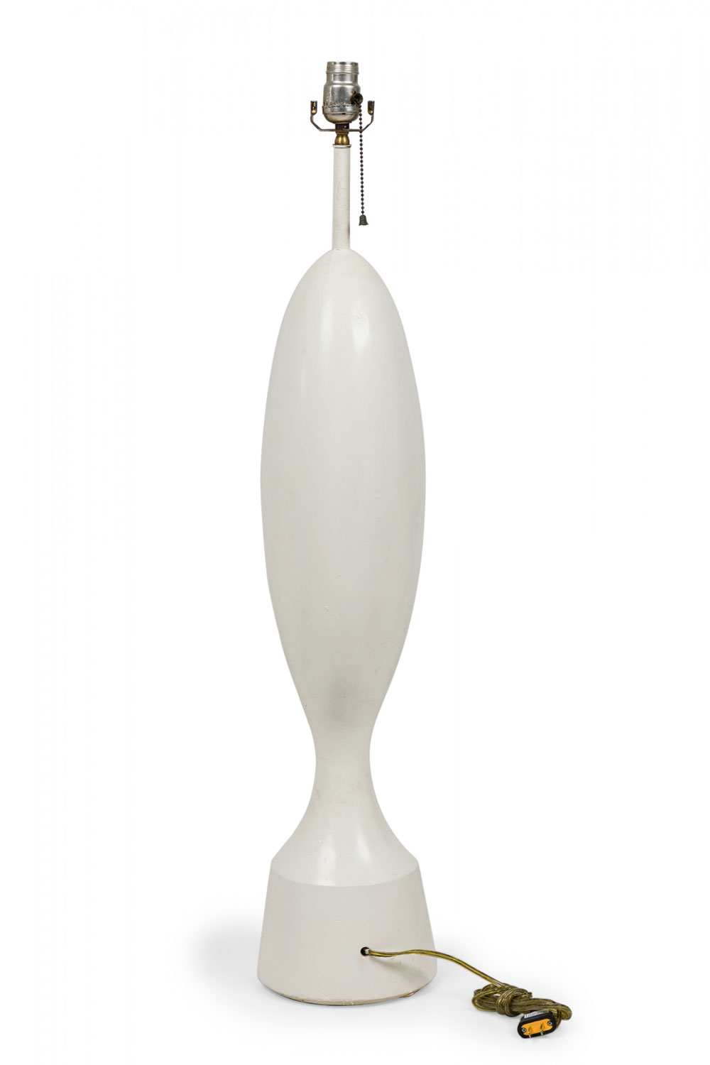 Mid-Century American red and white painted plaster "Harlequin Bishop" table lamp, sculpted in the form of a bishop chess piece featuring an elongated oval body which splits in half vertically at the upper section with functioning light switch socket, ending in a concave tapered cylindrical base. (Similar piece: DUL0017)
