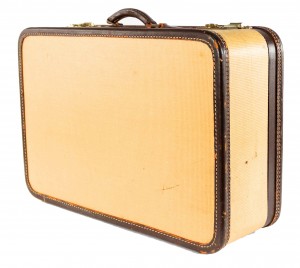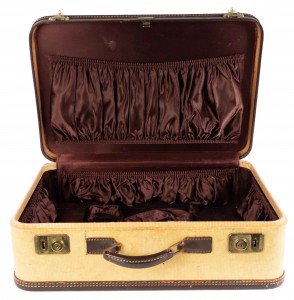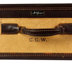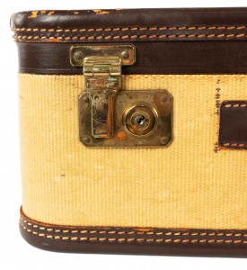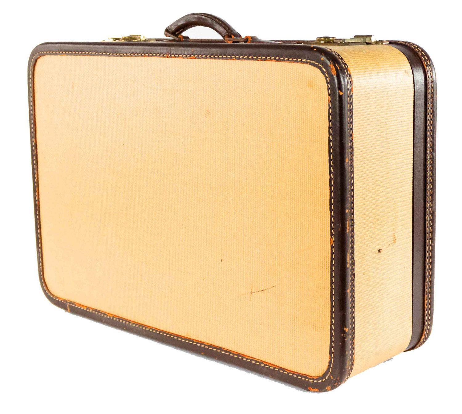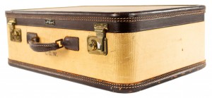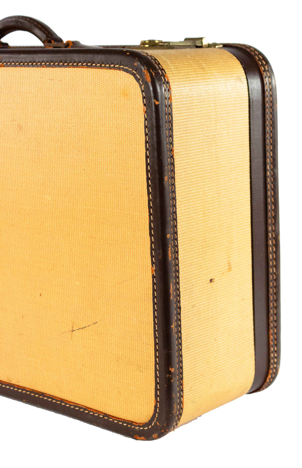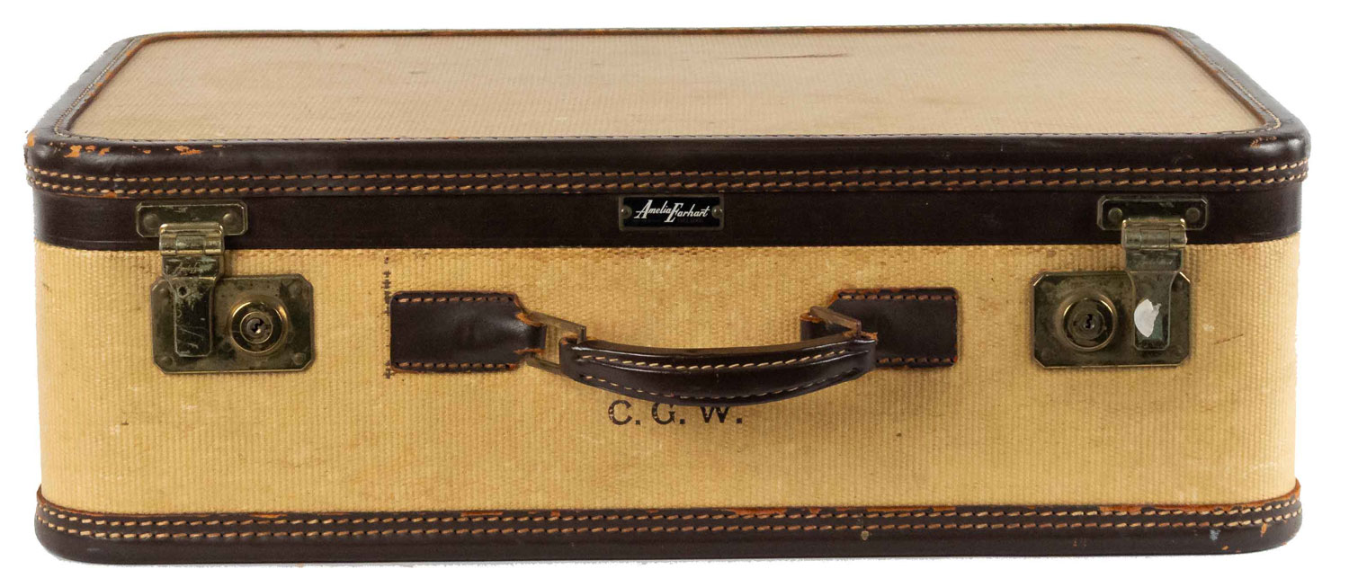 American Mid-century beige woven and dark brown leather trim suitcase (valise) AMELIA EARHART with initials: C.G.W.